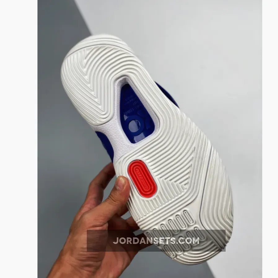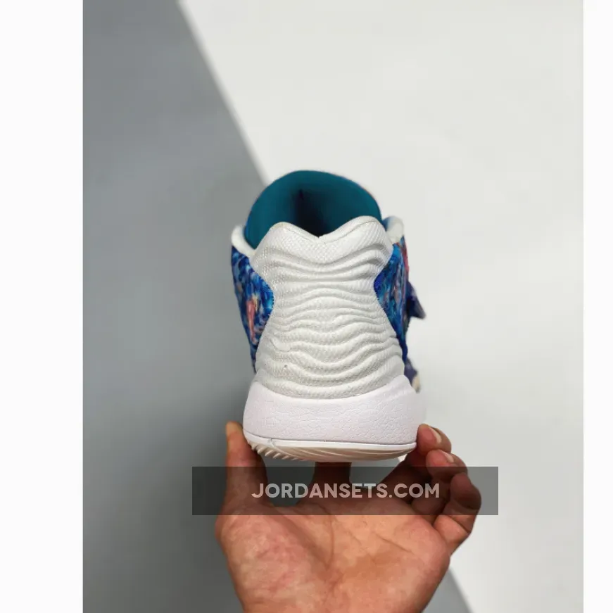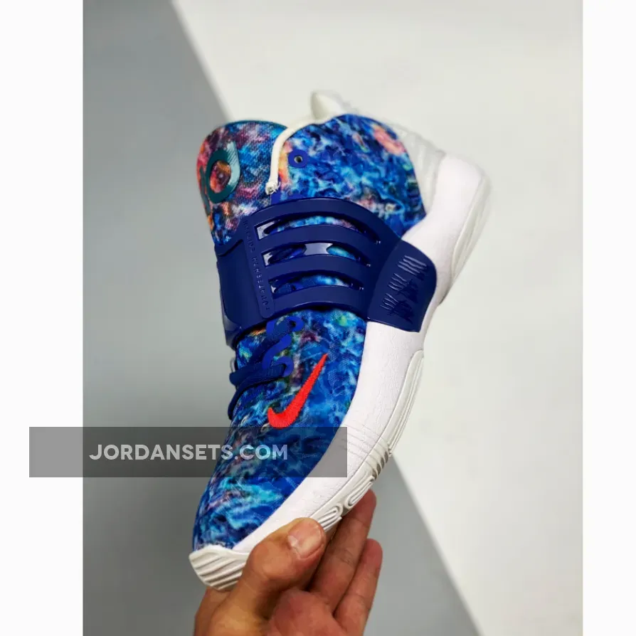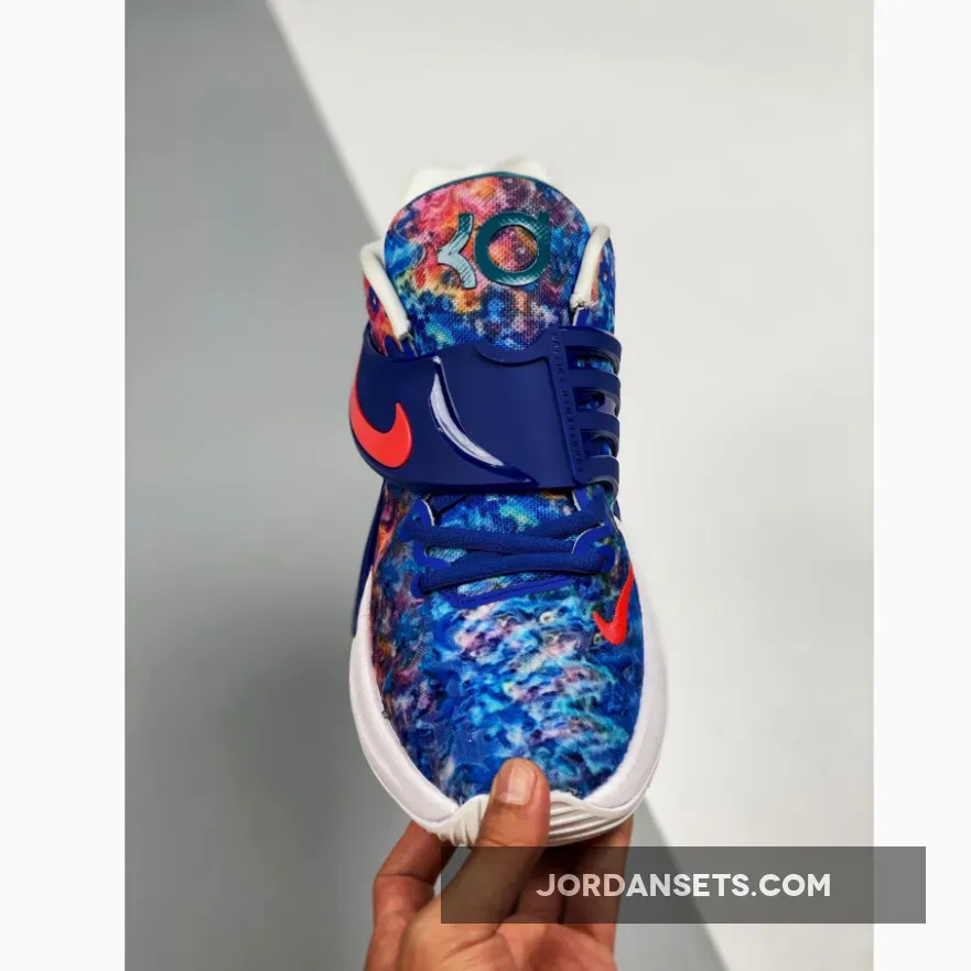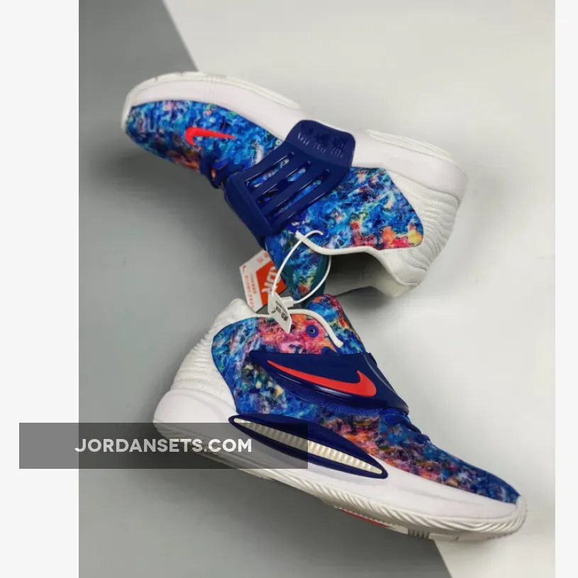Dressed in a Deep Royal Blue, Pale Coral, and Coconut Milk color scheme. This Nike KD 14 is highlighted with a psychedelic graphic print covering majority of its upper and tongue. Other details includes a Royal Blue cross strap at the midfoot with a Crimson Swoosh to match the embroidered Swoosh on the medial forefoot.