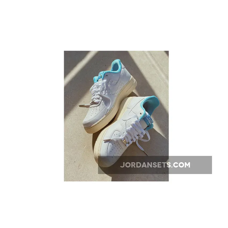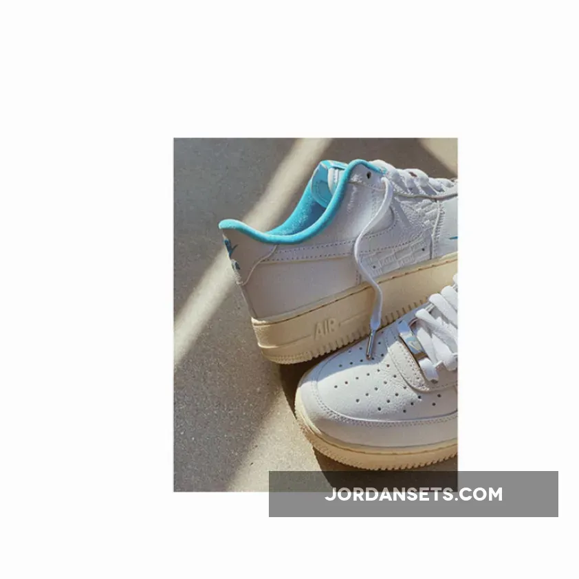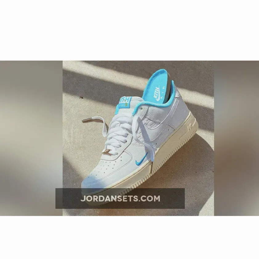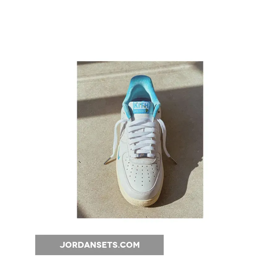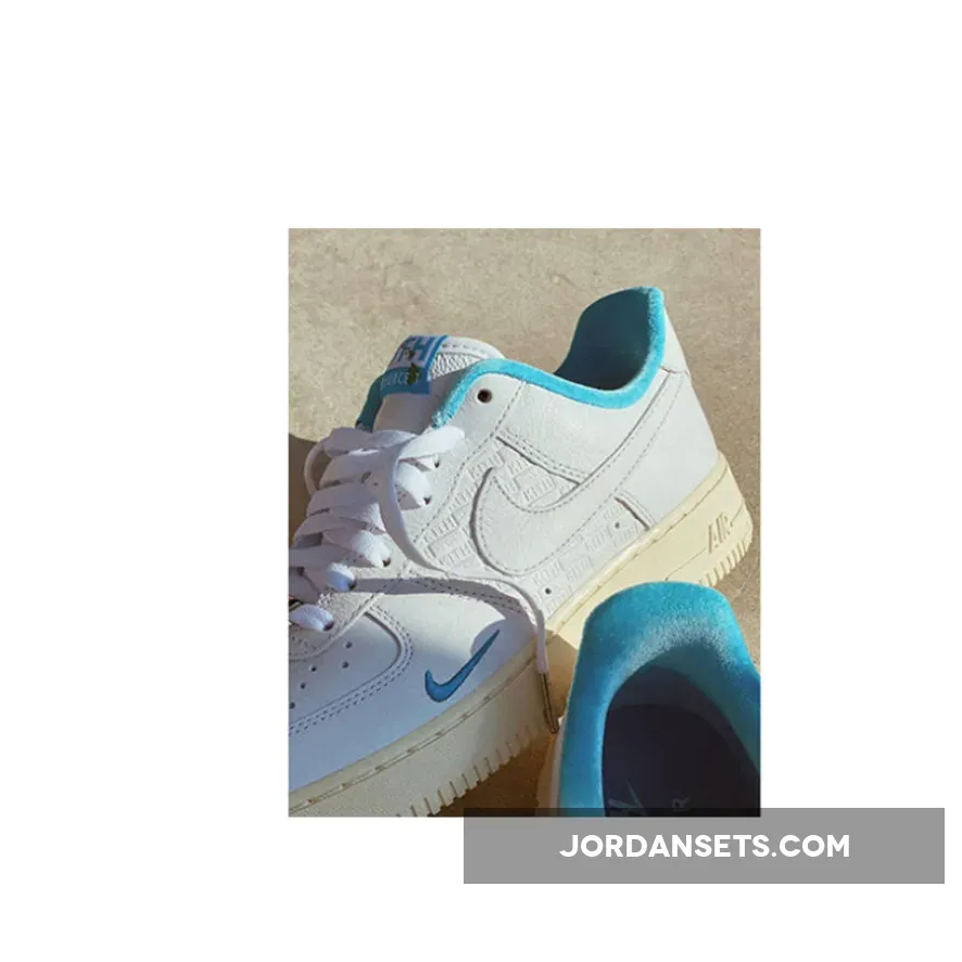 Dressed in a White, Blue Lagoon, Aloe Verde, and White color scheme. Inspired by the map of Hawaii, this Kith x Nike Air Force 1 features an all-White leather upper with Light Blue hits seen on the velvet lining and embroidered mini-toe Swoosh, while the tongue label highlights “Kith Air Force 1” above a map of Hawaii. Other details include special Kith Air logos, a reimagining of the Nike Air logo, embroidered on the heel tabs and printed on the footbeds.