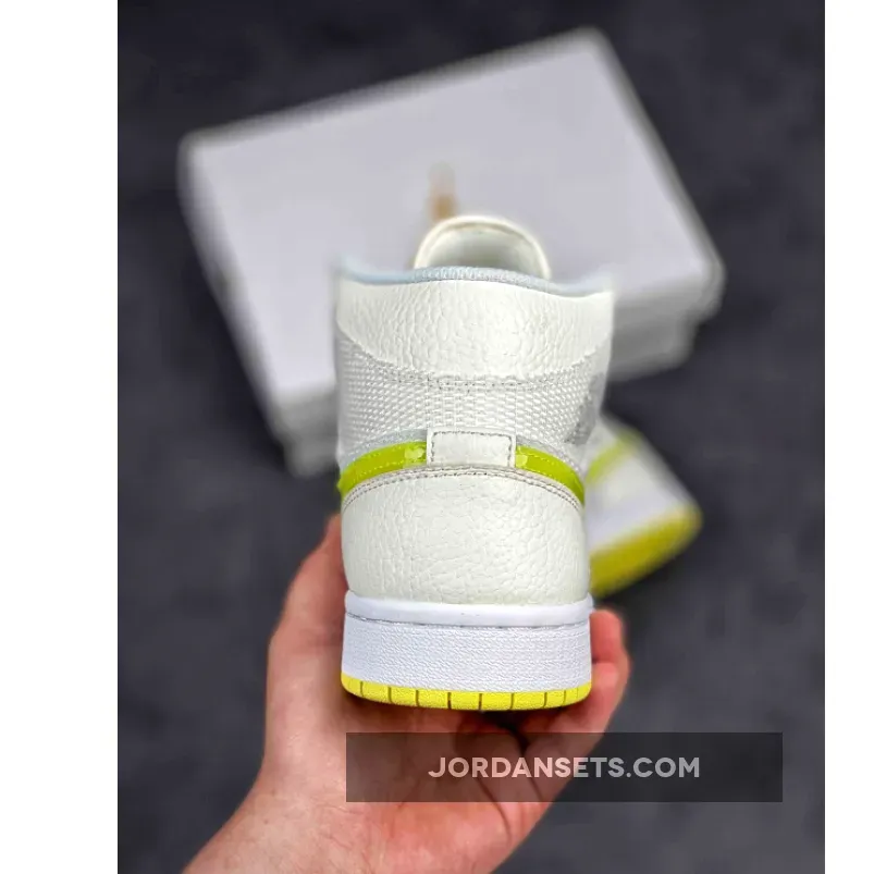 The Air Jordan 1 Mid SE Voltage Yellow in womens sizing uses an airy material reinforced with off-white tumbled leather overlays along the forefoot and heel. Branding elements include a glossy neon yellow Swoosh and a Jordan Wings logo printed on the mesh overlay that wraps around the collar. They are joined by a Jumpman icon on the semi-translucent tag affixed to the orange mesh tongue.