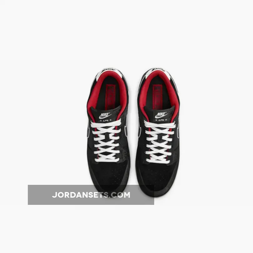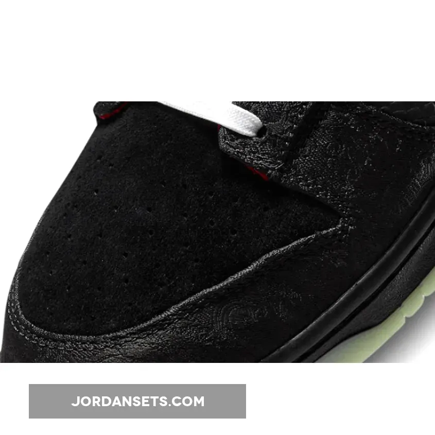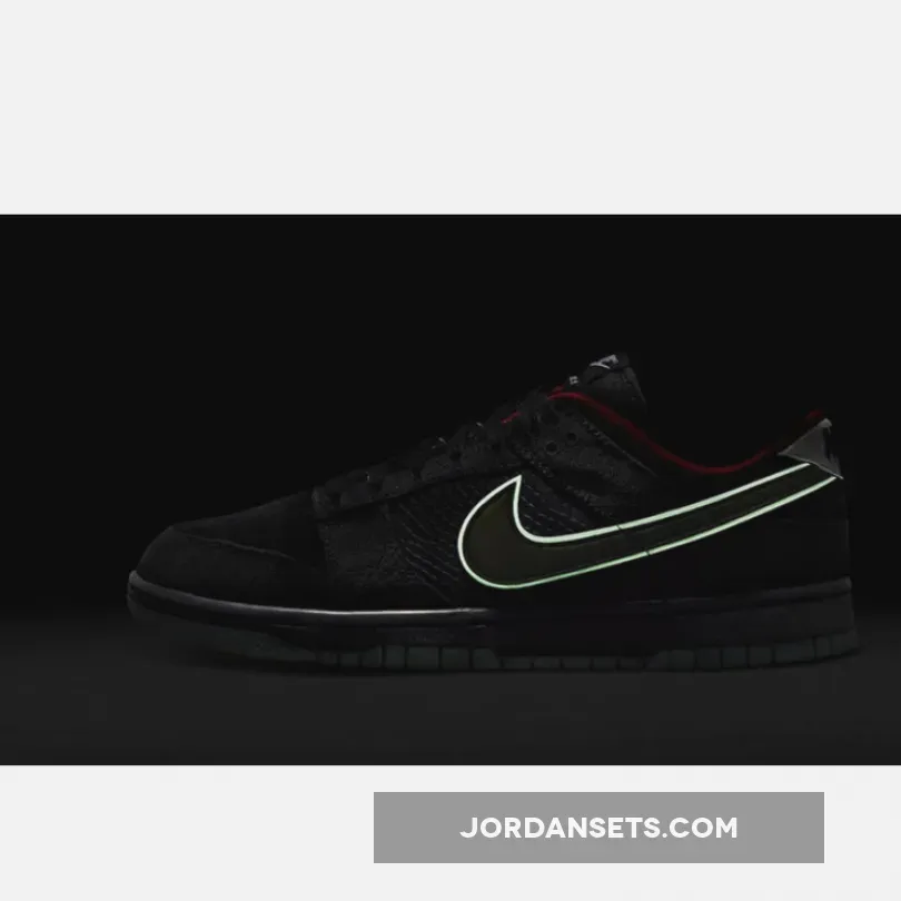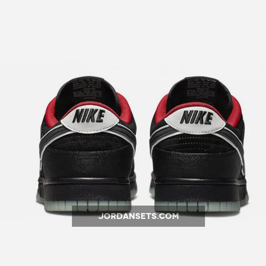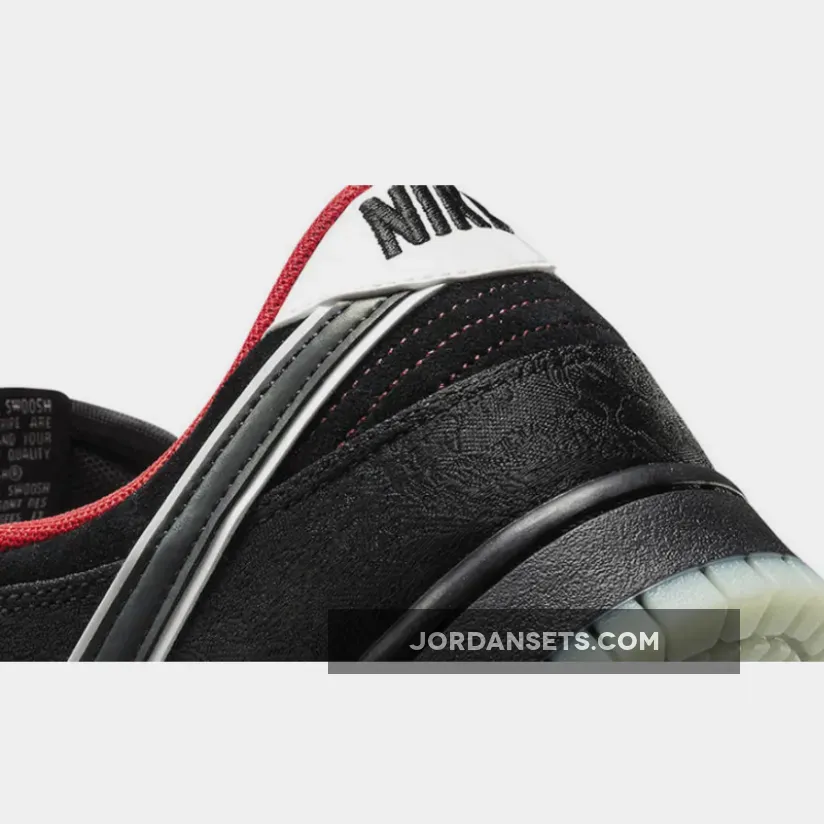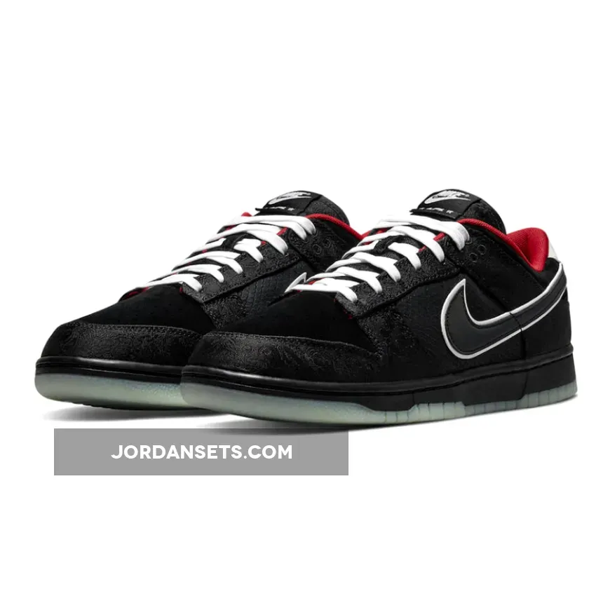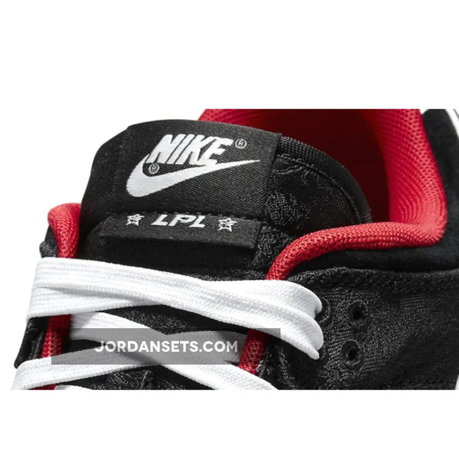 Dressed in a Black, White, and Bright Crimson color scheme. This Nike Dunk Low features a Black base covered in patterns and textures inspired by traditional Chinese iconography. Other details includes iridescent reflective Swooshes with glow-in-the-dark detailing on the Swoosh outline, heel panels, and outsole. A Red sockliner, pixel print on the heel, LPL branded tongue tags with star embroidery on the lateral heel and glow-in-the-dark details completes the design.