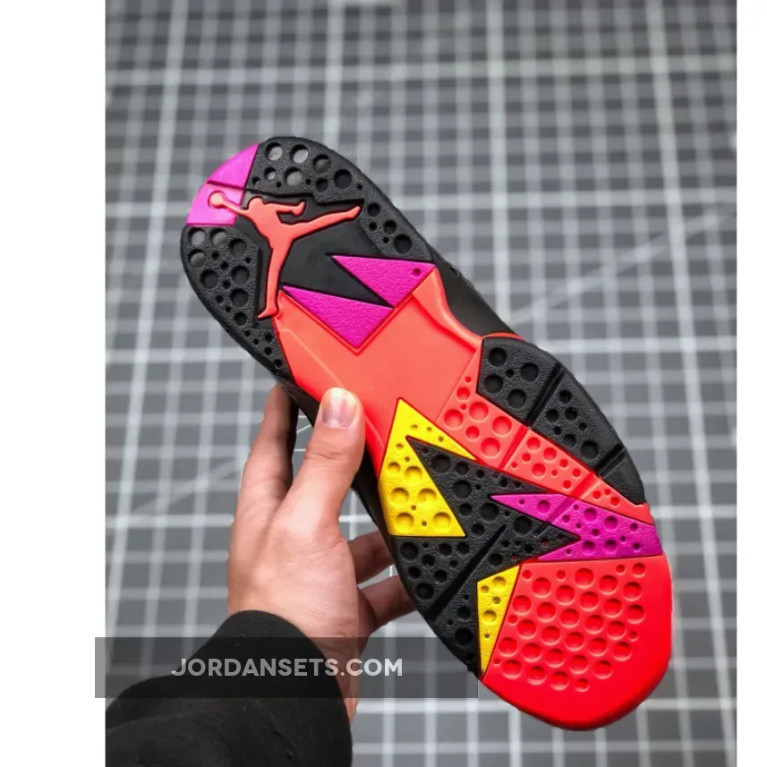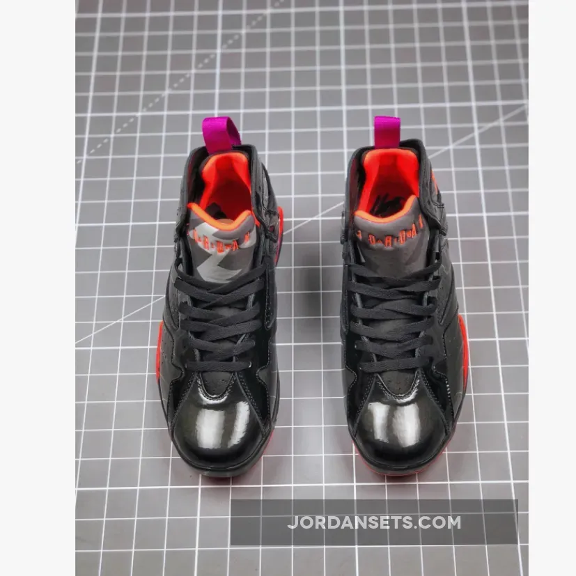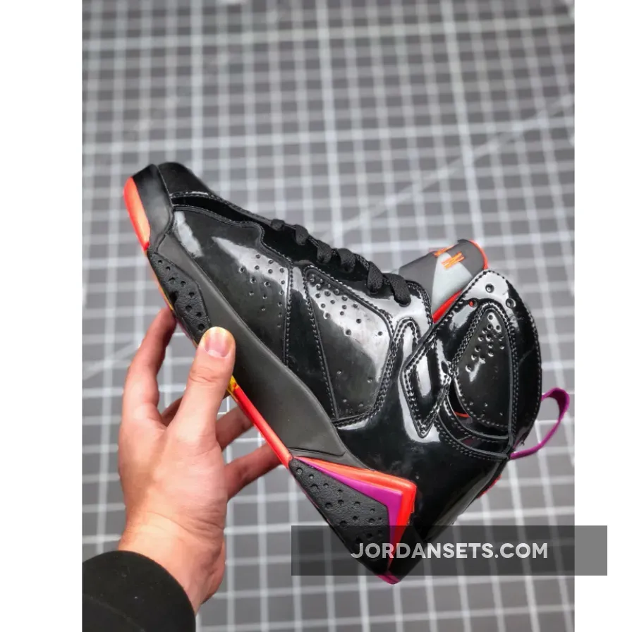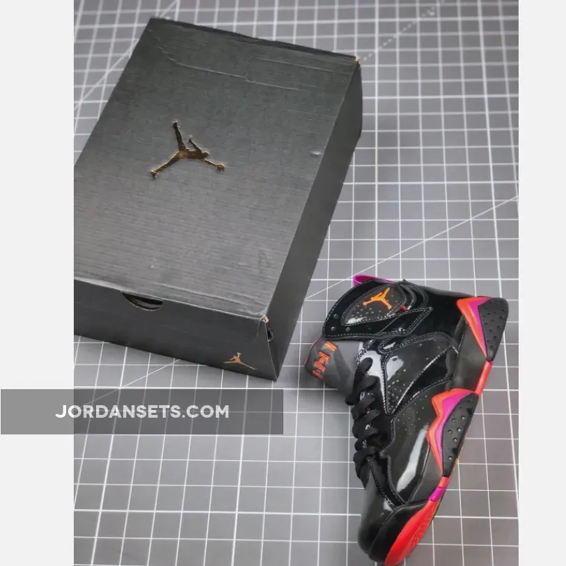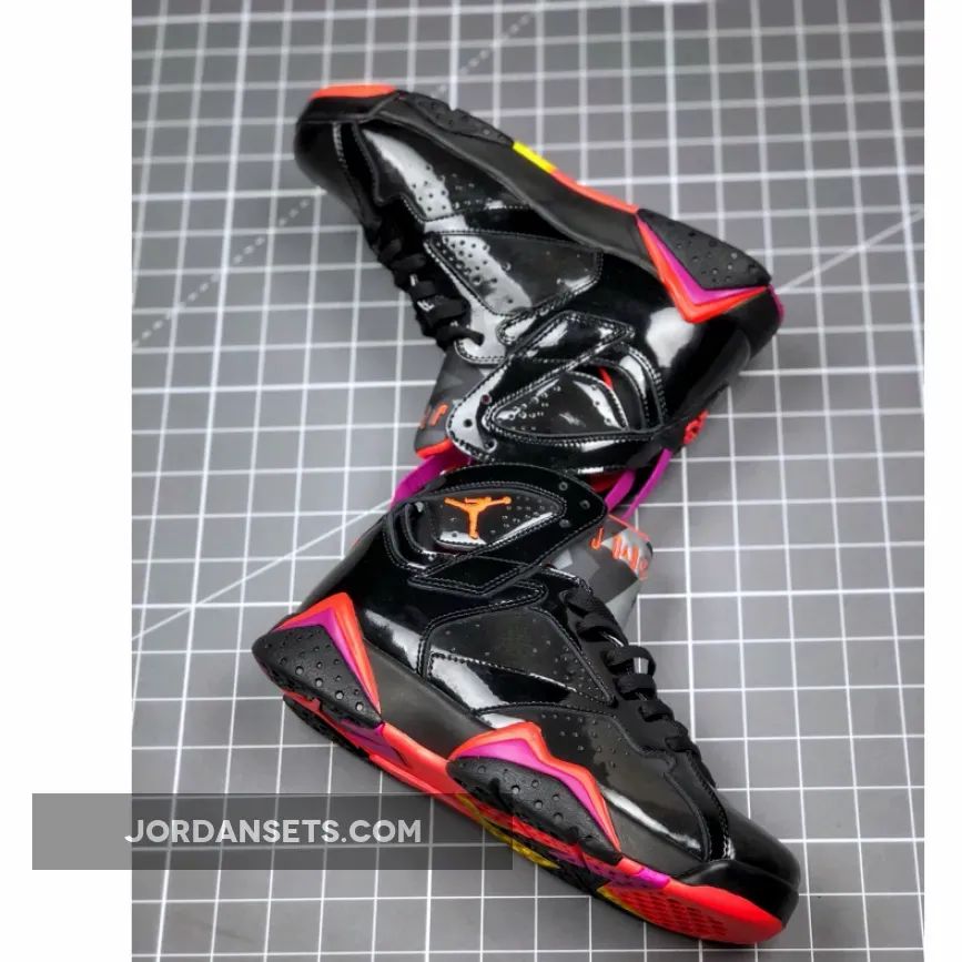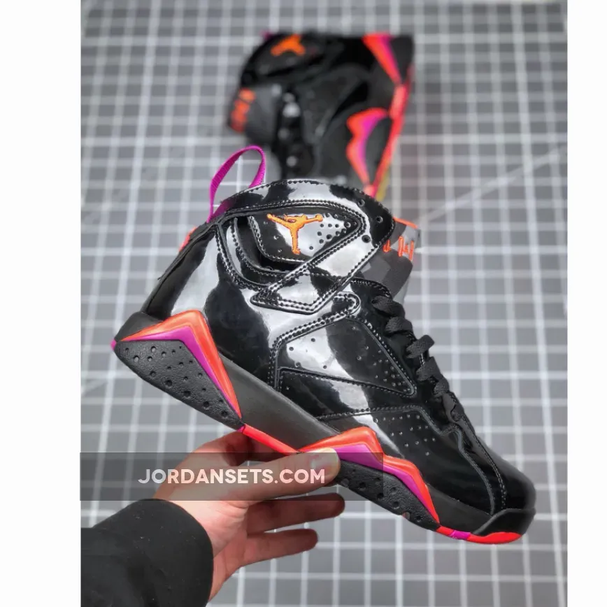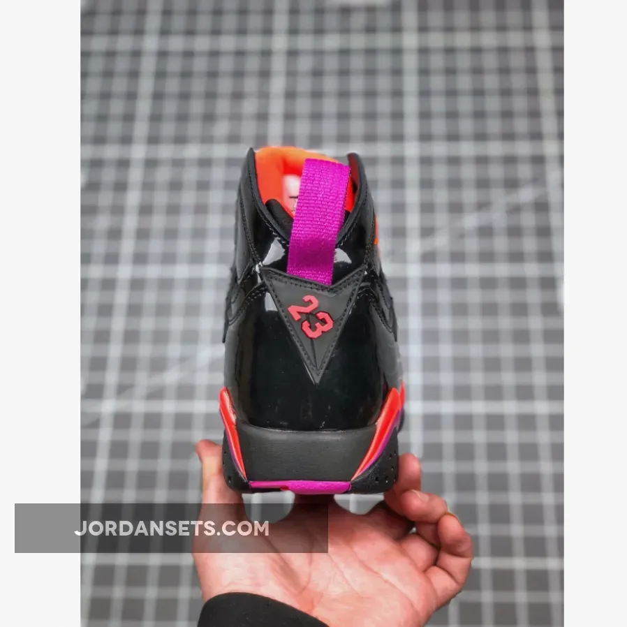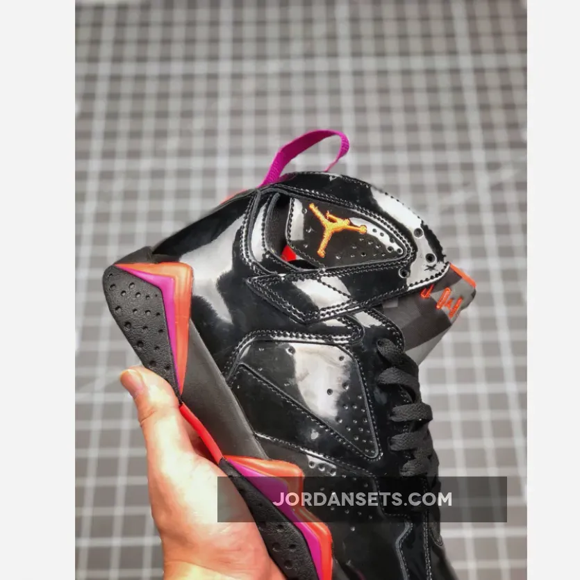 Looking closer this Air Jordan 7 comes highlighted with Black Patent leather across the upper while both Orange and Purple detailing is seen on the tongue branding, Jumpman on the ankle, midsole and heel. Completing the look is accents of Yellow on the outsole.