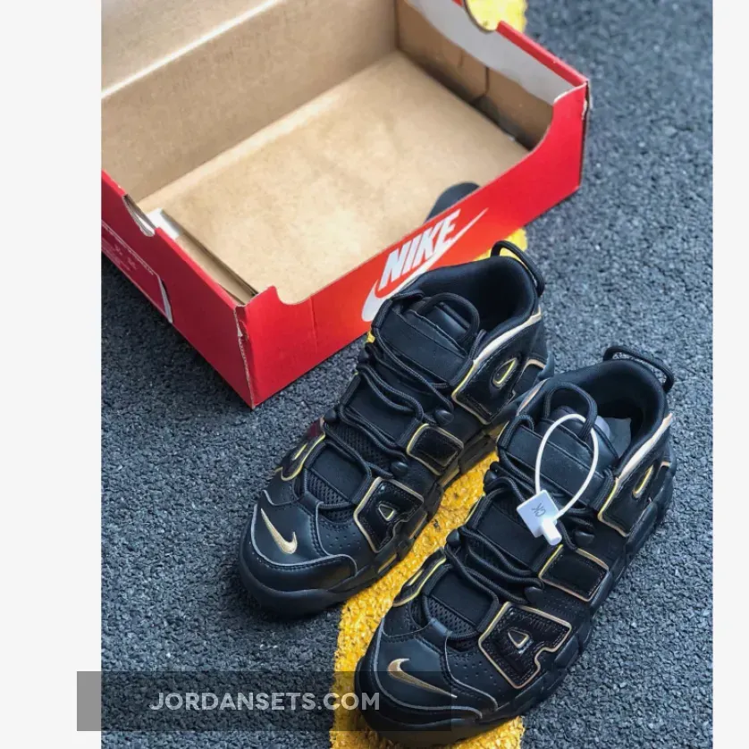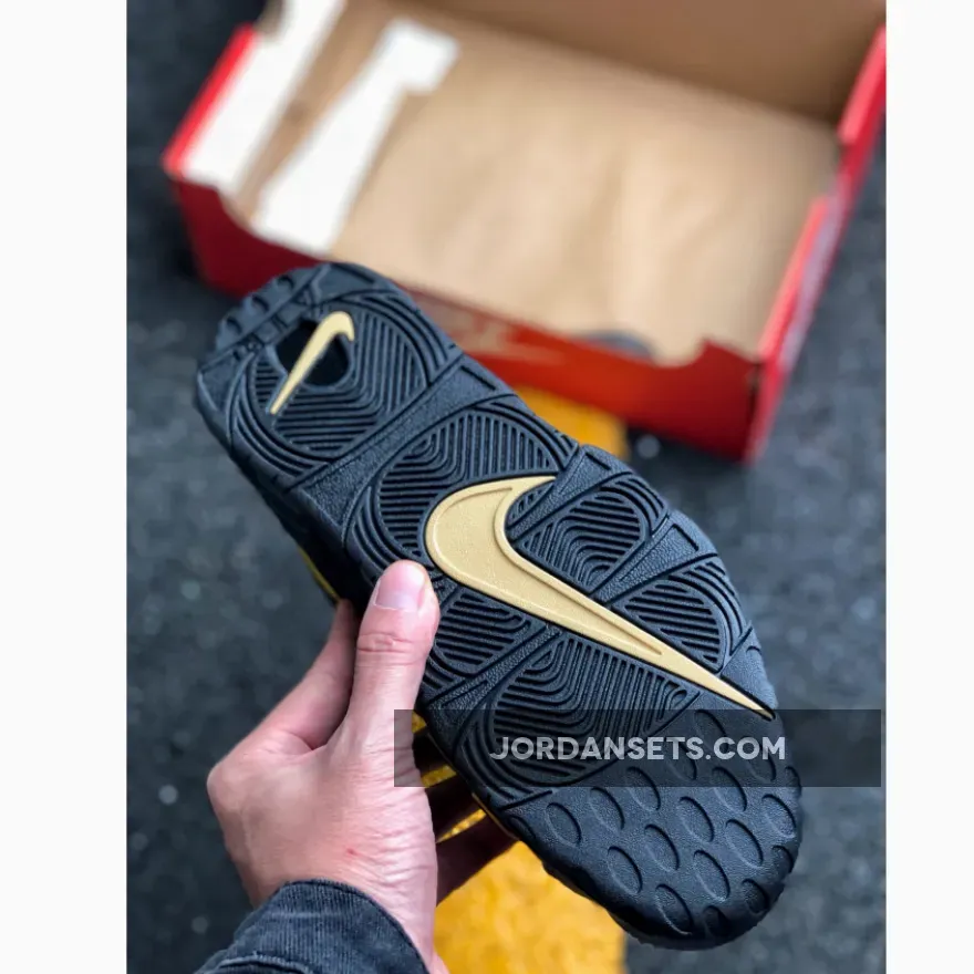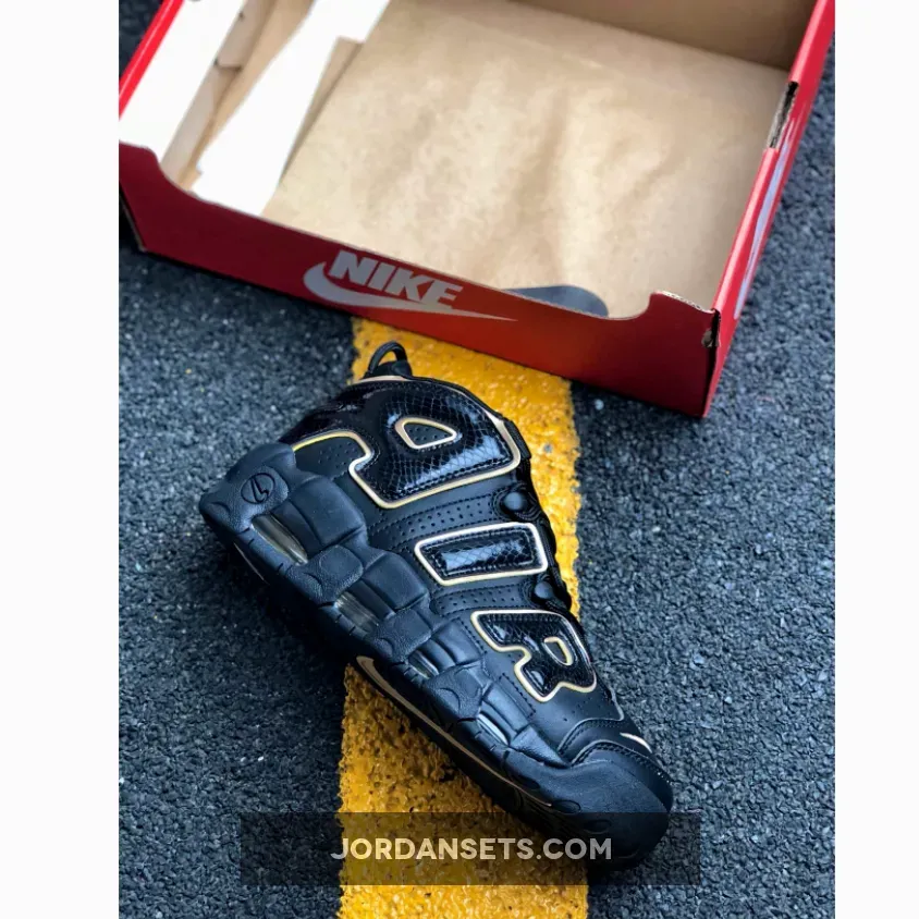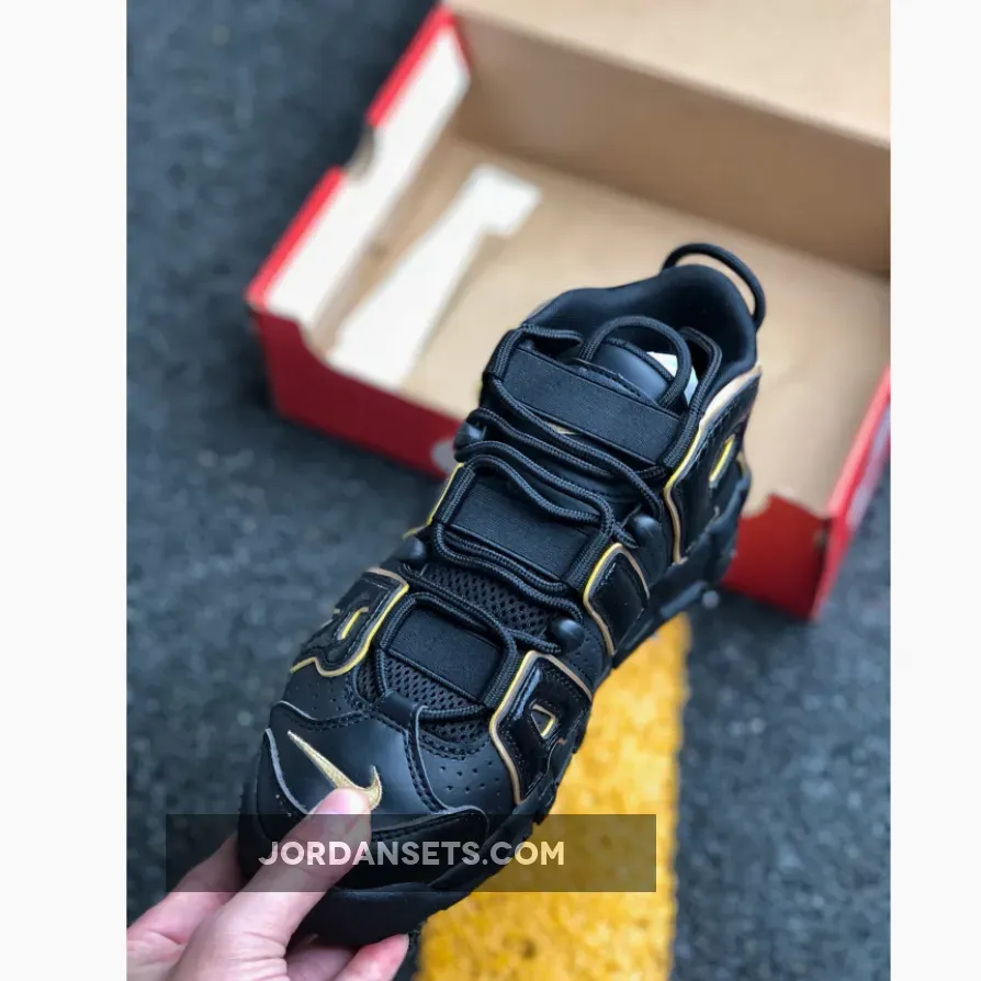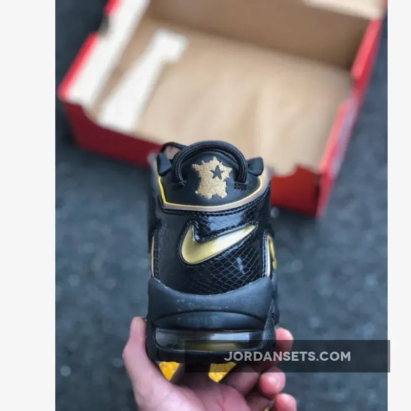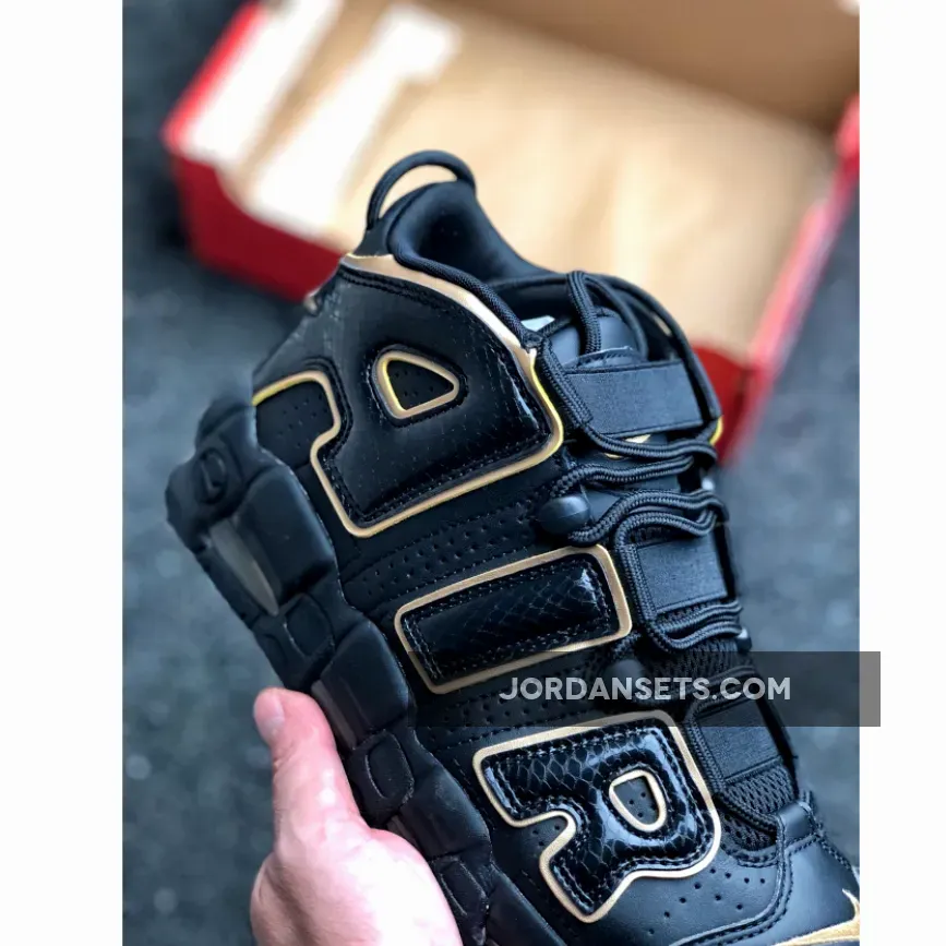 This Nike Uptempo features a Black leather upper with textured overlays on the oversized “AIR” lettering. Metallic Gold accents is used on as the outline as well as on the Nike Swoosh and countries logos on the heels. A Black midsole and rubber outsole completes the luxurious design.