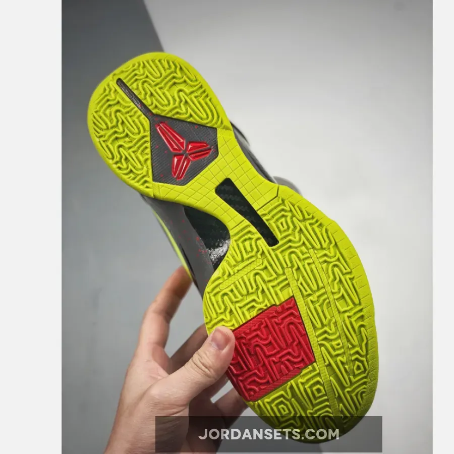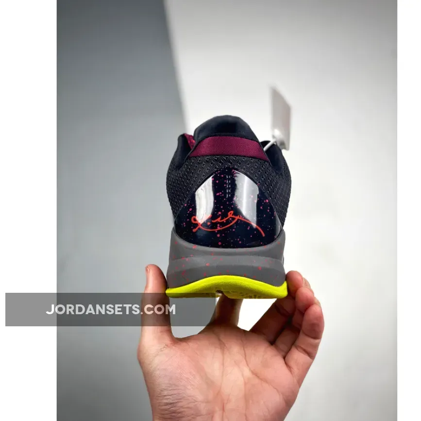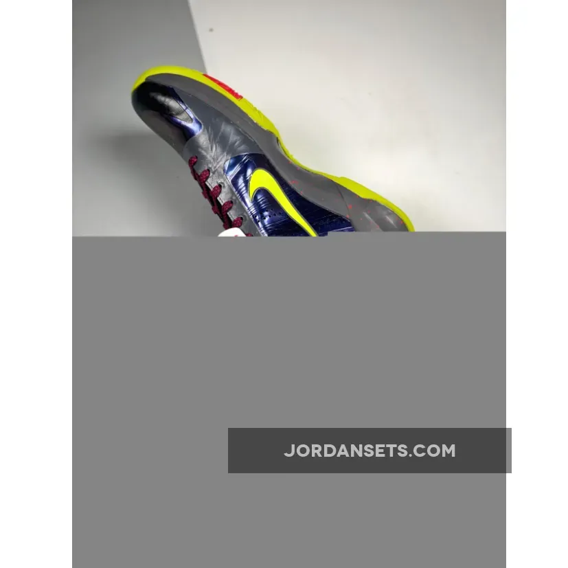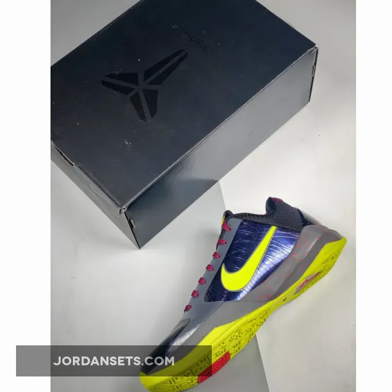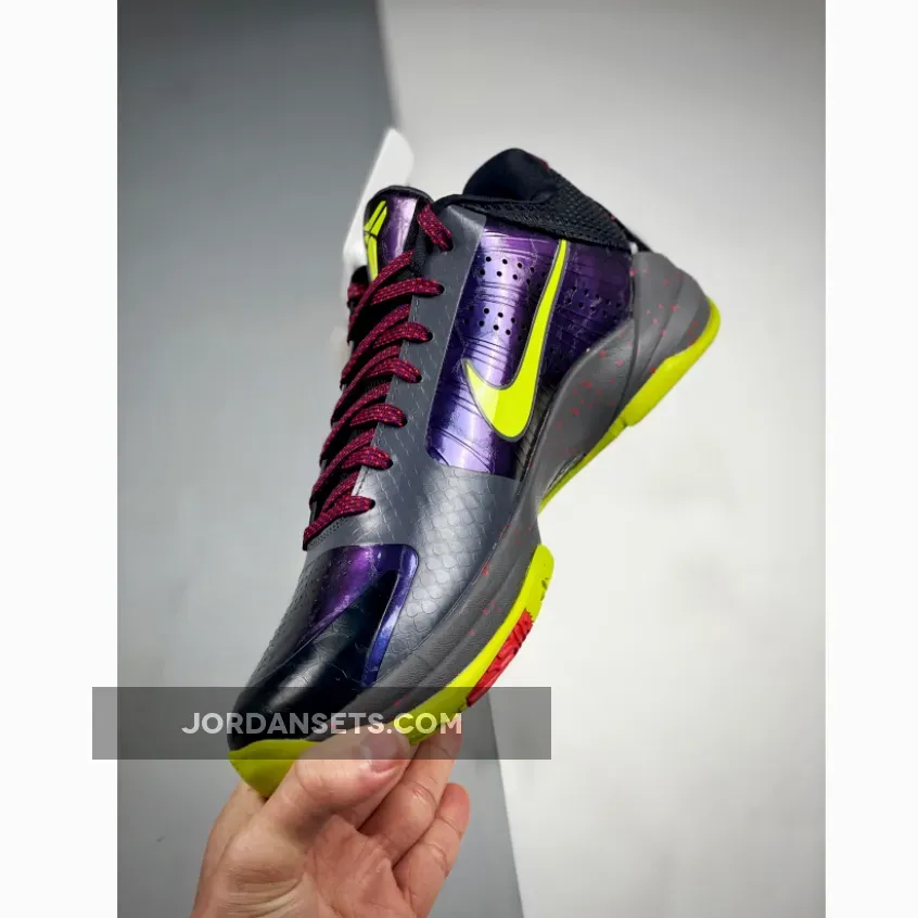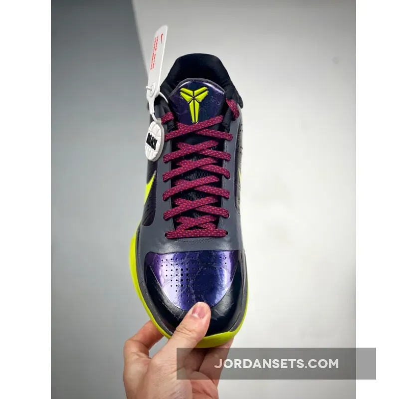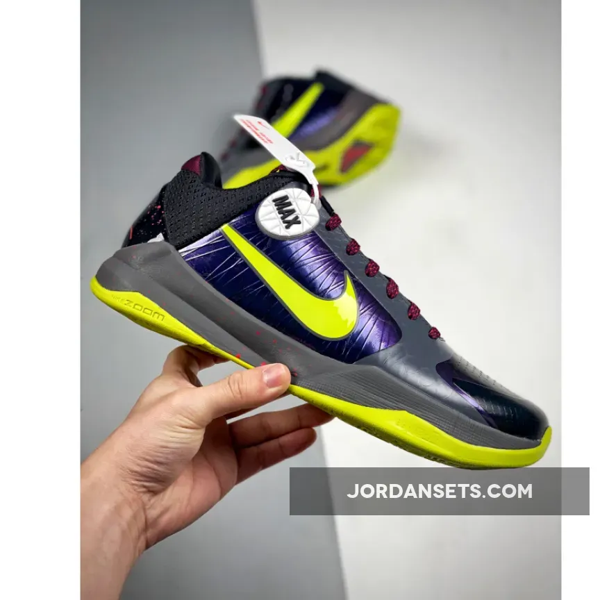 This rendition of the “Chaos” Kobe 5 Protro comes dressed in the same Joker-themed colors with iridescent panels and replaces the White overlays with a Charcoal snakeskin fabric. A darker shade of Grey is also added to its midsole, which is different from the original.