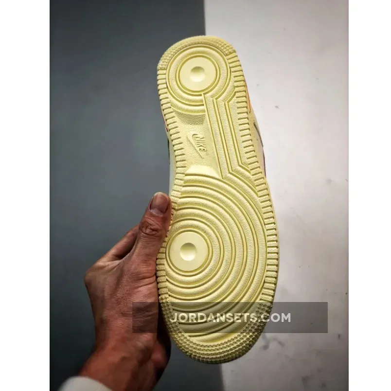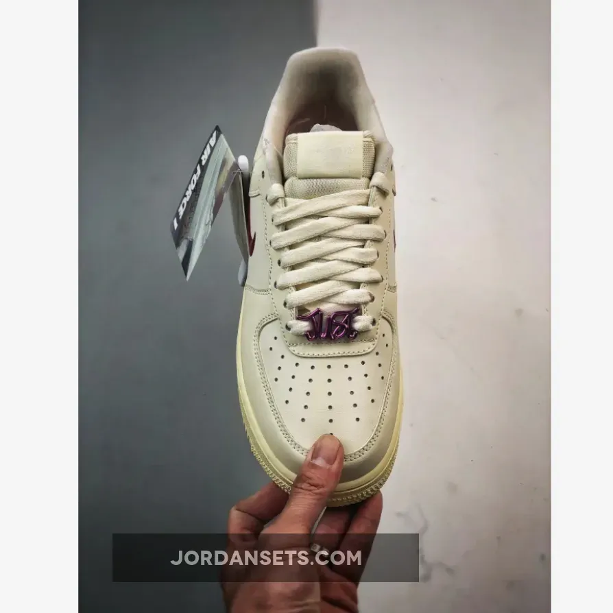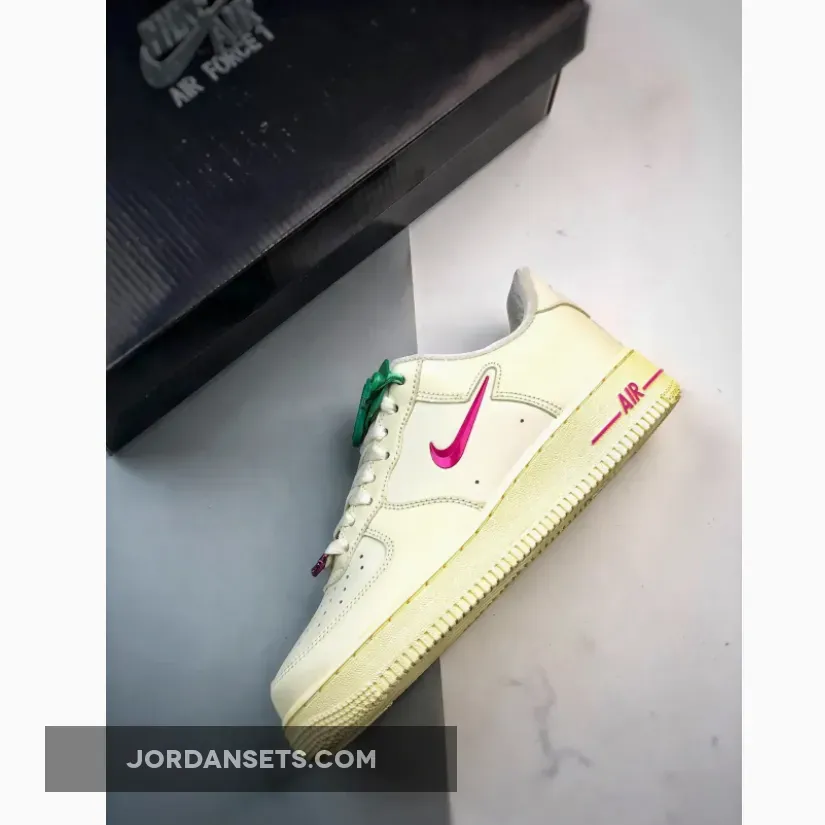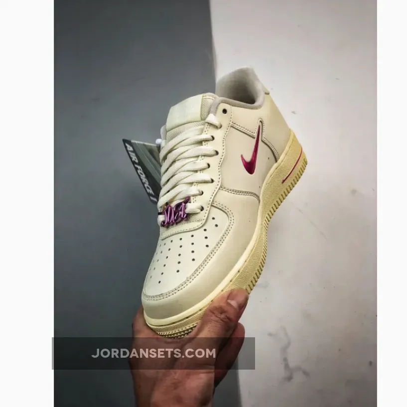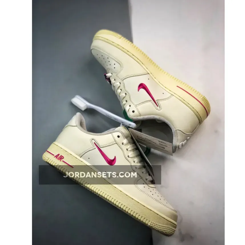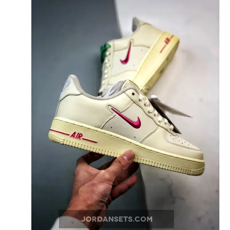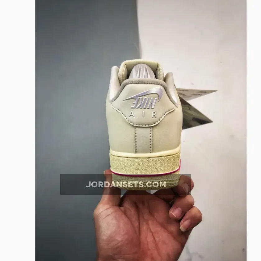The branding details are added with the upside down “Nike” and “Air” lettering upon the pink sock liners, tongue tags, and the heel tabs. A resilient Alabaster AF1 rubber sole adds the finishing touch to this stylish design.