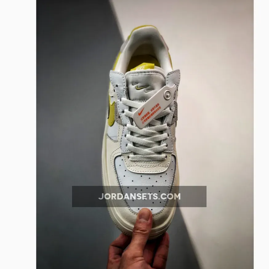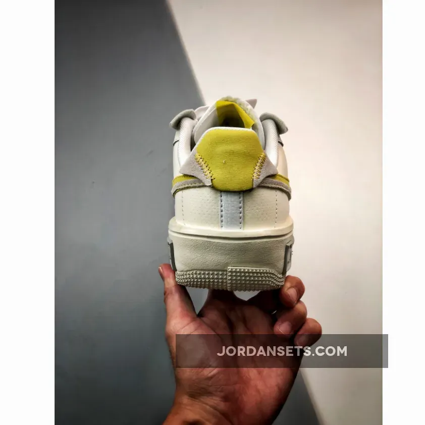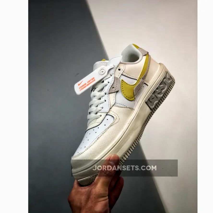 The Nike Air Force 1 Fontanka has just dropped in a new neutral iteration with a strong twist. Meet the Nike Air Force 1 Fontanka Lemon. The base of this AF1 Fontanka is plain white smooth leather. The overlays are Sail-coloured smooth leather with micro-perforations. In fact, you’ll need to take a closer look to see the little holes. Beige-coloured suede accents also pepper the shoe’s upper. The most distinctive details of the shoe are the bold Lemon Swooshes on both the medial and lateral quarters. Three mini embroidered Swooshes adorn the tongue, one grey, one Lemon and one white.