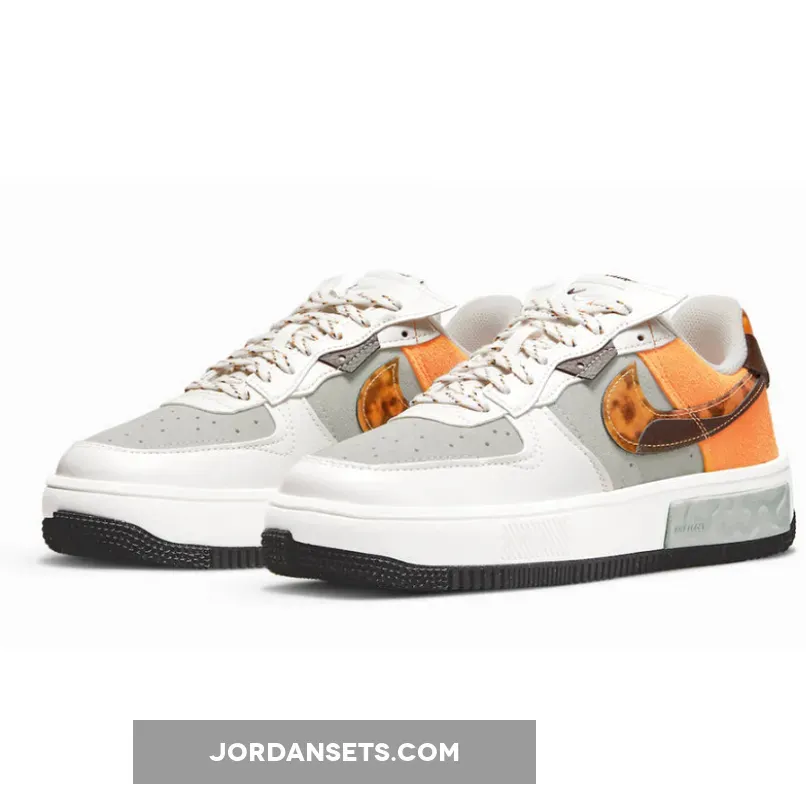 The Nike Air Force 1 Fontanka dons a nice mix of grey and orange with a touch of tortoiseshell. Check out the sherbet-looking Nike Air Force 1 Fontanka White Orange with a twist. A dove grey suede dresses up the base while smooth white leather takes over on the toe cap and the eyestay panel. A melon-coloured suede heel panel adds a touch of contrast to the upper. What gives this shoe a unique personality is the tortoiseshell Swooshes on the quarters with brown tumbled leather accents sewn over the bottom halves. The brandless heel tab follows the Swoosh treatment. The white laces feature brown and orange patterns.