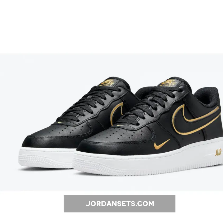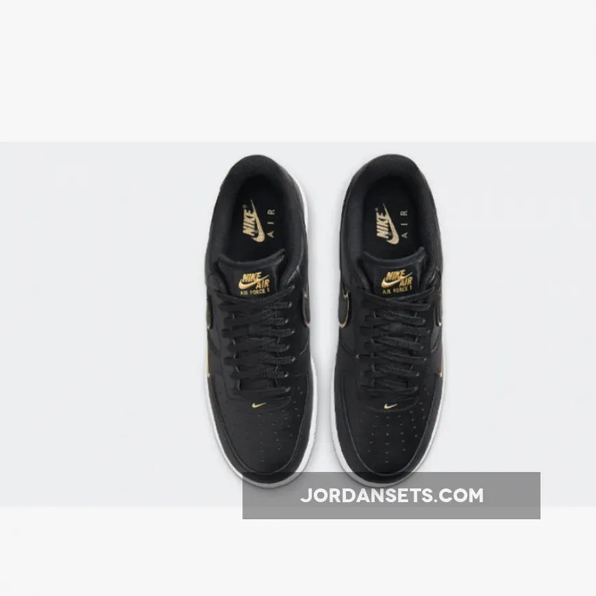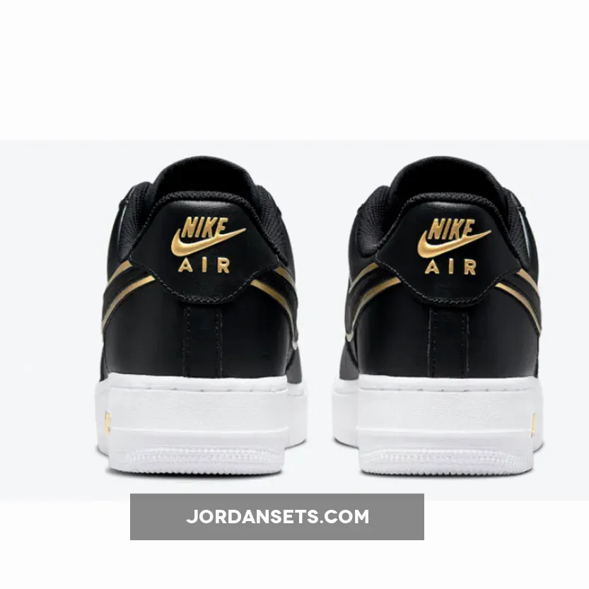 This offering of the Nike Air Force 1 Low features a Black leather upper with matching Swooshes on the sides paired with Metallic Gold layering underneath.