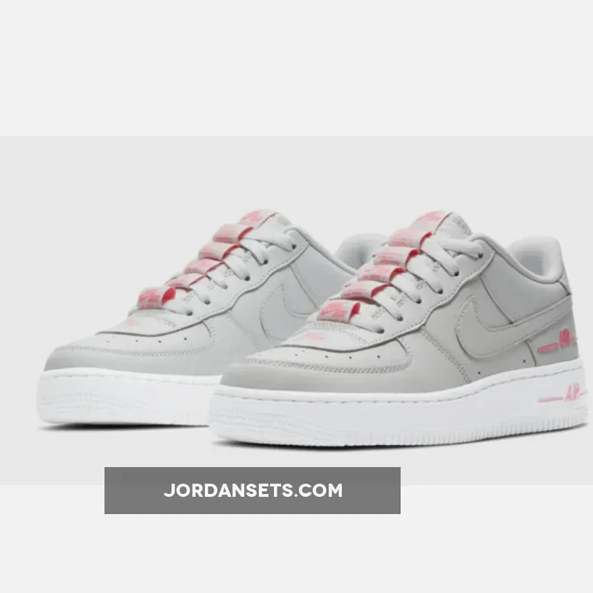 Smooth, light grey leather covers the upper of this grey and red Double Air Air Force 1, with the factory label that usually sits on the inside of the tongue repeatedly running down the centre of the lace unit. The perforation holes that usually appear scattered across the toebox have been replaced with a ‘Nike Air’ logo in bright pink. Light grey Swooshes sit stretched out across both side walls, blending in against the neutral coloured upper.