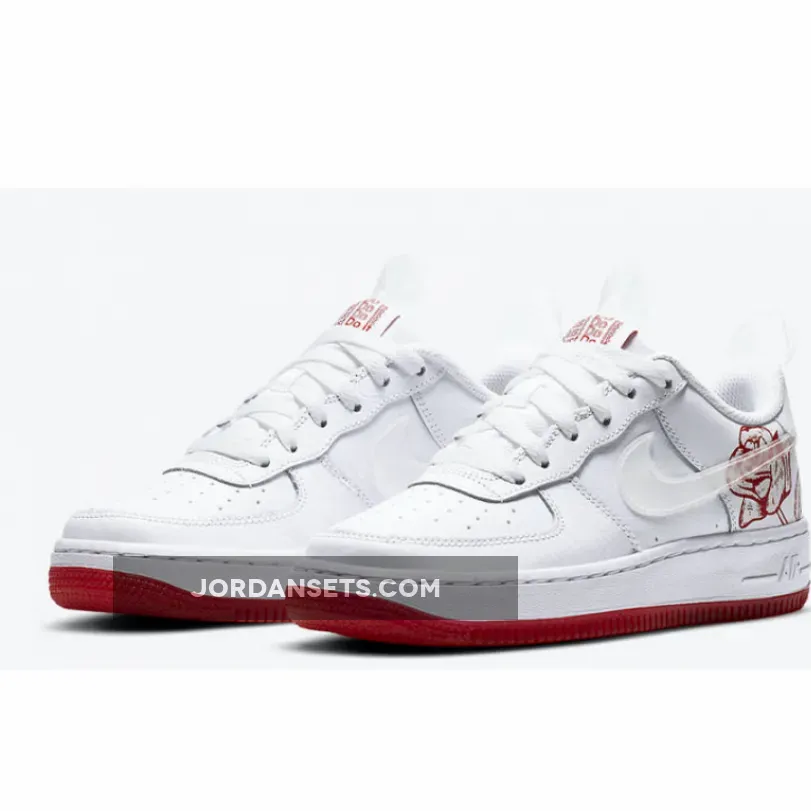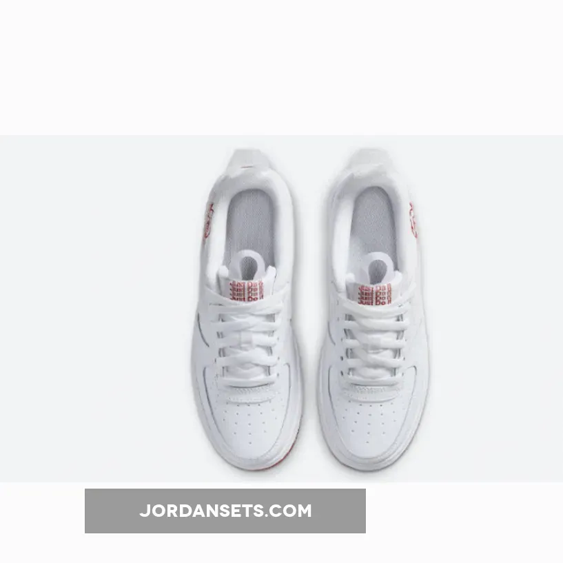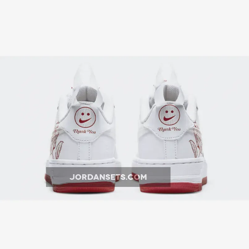 Dressed in a White and University Red color scheme. This Nike Air Force 1 Low features a White leather base with a large rose appearing on the lateral heel underneath its transparent Swooshes.