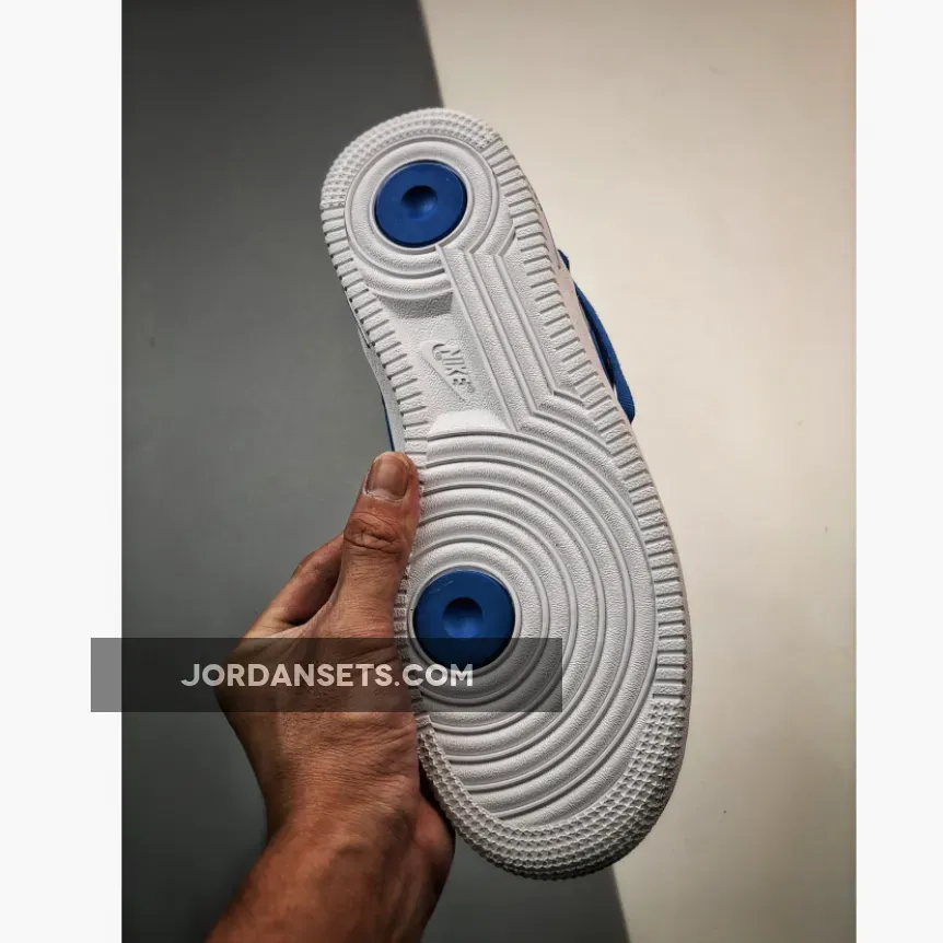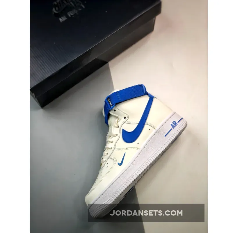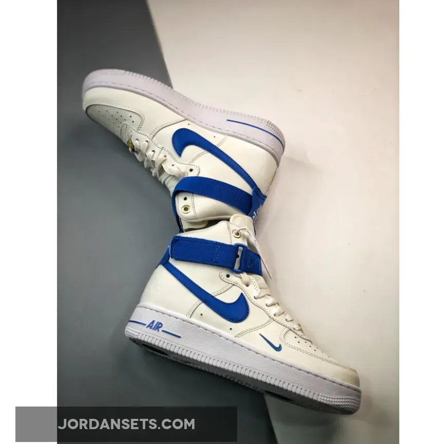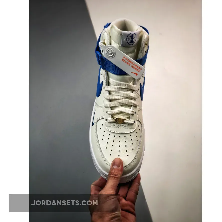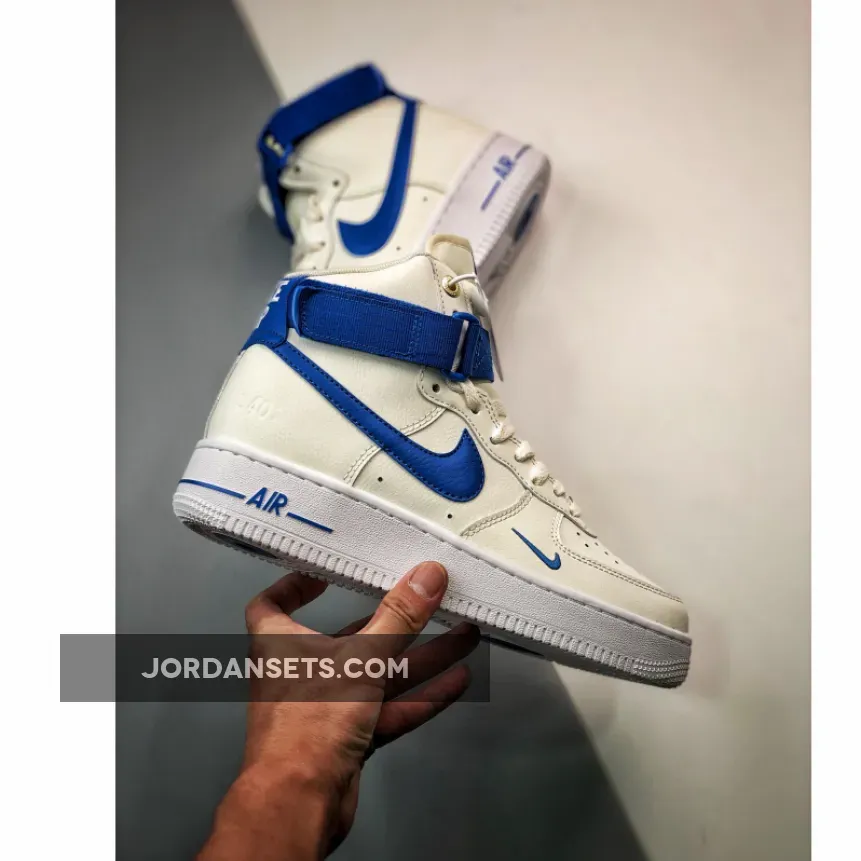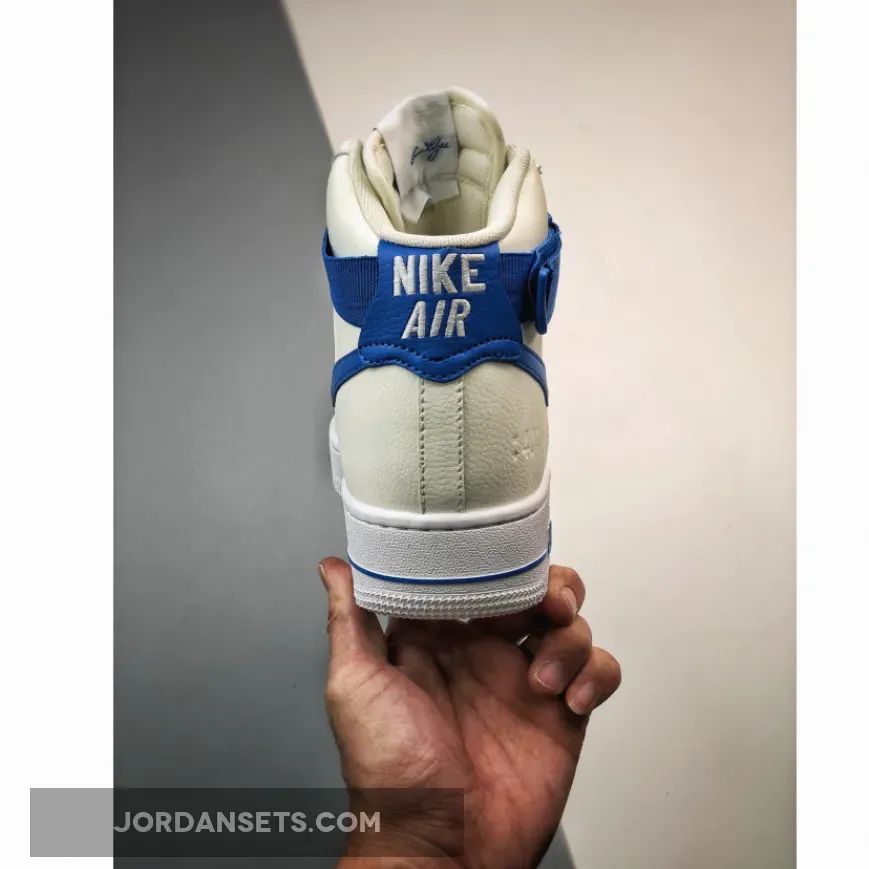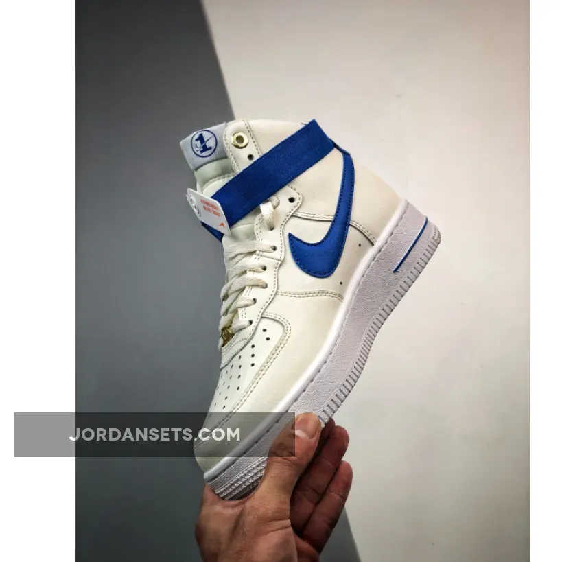 The classic Bruce Kilgore-designed Nike Air Force 1 highlights its birthday with a “Since 82” collection. Introducing one of its releases, the Nike Air Force 1 High Since 82 White Blue. This high-cut AF1 is nattily white tumbled leather from heel to toe. Eye-catching blue Swooshes stand out on both sides of the shoe as do the mini embroidered blue mini Swooshes on the lateral toe cap, the heel tab and the hook-and-loop Velcro ankle flaps. The white tongue tabs feature blue Nike Air Force branding with an outsized 1. Golden details can be found on the top eyelet and the metallic lace deubrés.