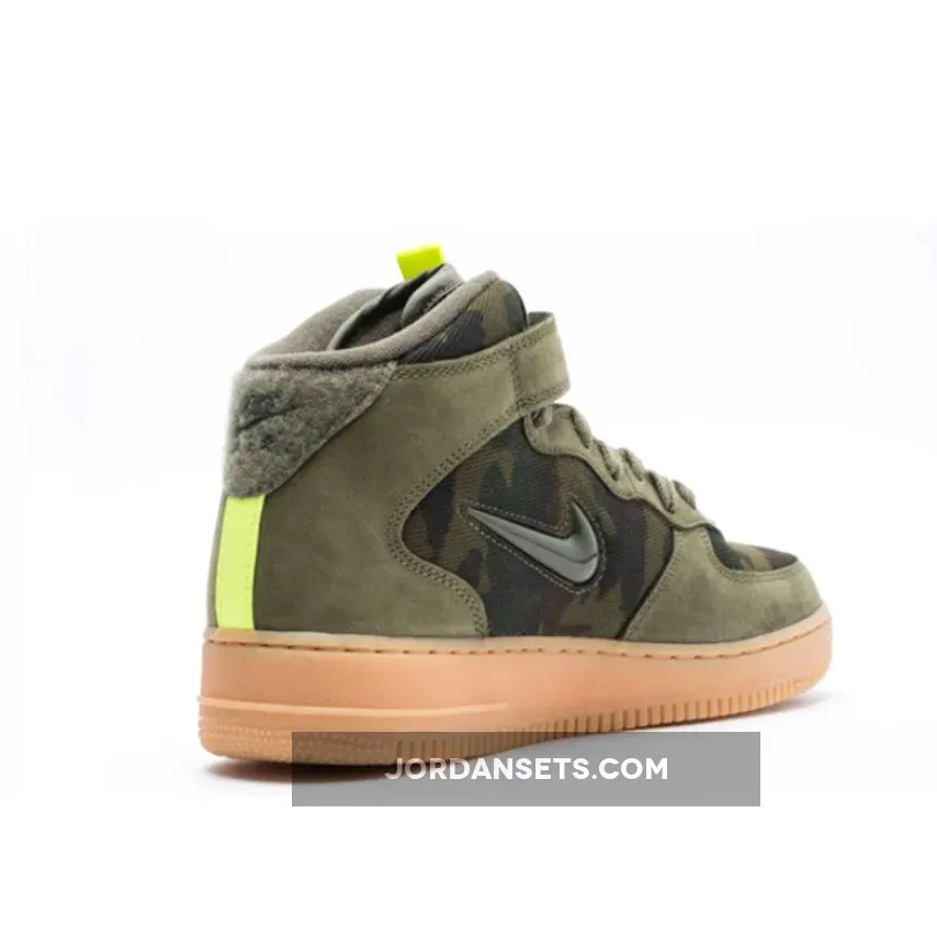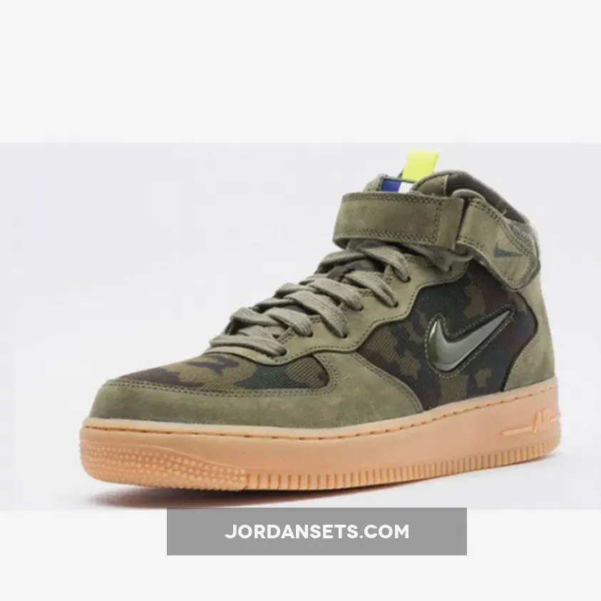 Dressed in a Medium Olive, Dark Army, and Volt color scheme. This Nike Air Force 1 Mid is highlighted with camouflage print, Volt accents and a removable French flag patches on the tongue.