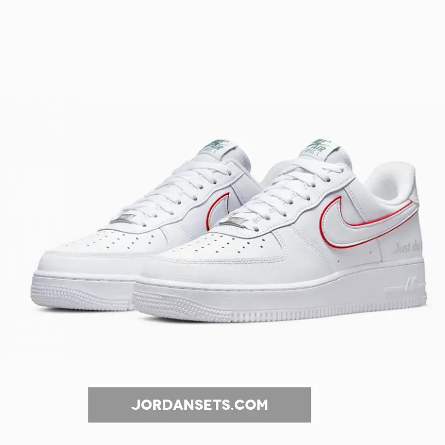 Clad in its signature white leather, the pair presents with other staple finishes like white nylon tongues, all-white sole units, and pure white liners. It’s jazzed-up by the titular slogan emblazoned on the lateral heel, as well as dual-layered red and white Swooshes, and deep green branding hits at the tongue, insole, and heel. The design is then completed by a special iridescent AF-1 branded dubrae.