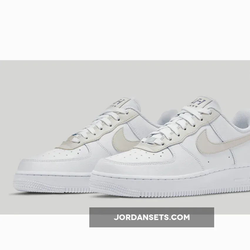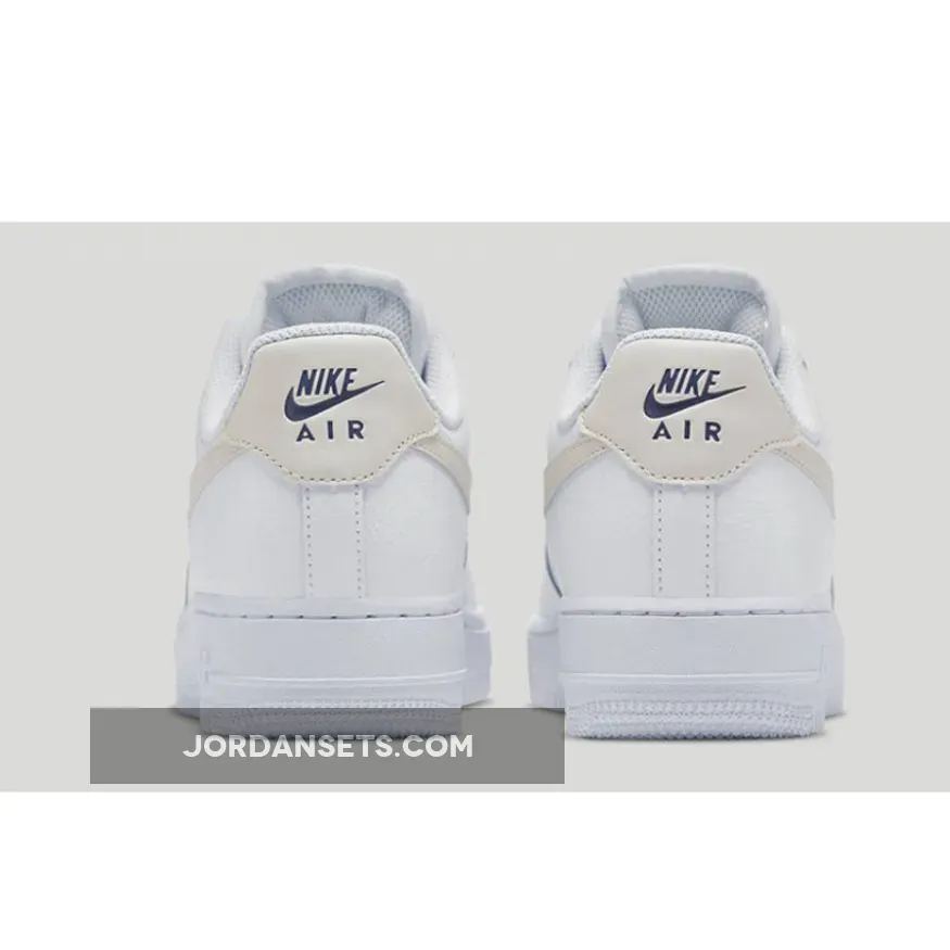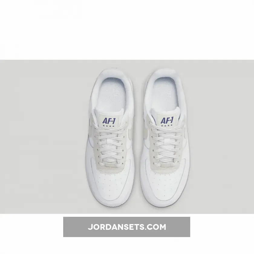 Dressed in a Summit White, Deep Royal, and Light Bone color scheme. This Nike Air Force 1 features a White tumbled leather upper paired with Light Bone accents on the eyestay, Swooshes, tongue tags, and heels along with matching laces. Royal Blue is used on the tongue and heel branding while the shoe is completed with a clean White AF1 rubber sole.