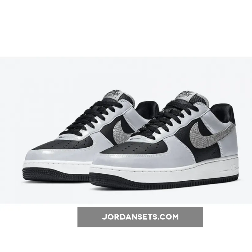The 2021 reissue of the Nike Air Force 1 ‘3M Snake’ brings back one of three CO.JP Air Force 1 ‘B’ styles that originally released in 2001. The low-top features a black leather upper with reflective matte silver overlays and a faux snakeskin Swoosh. Tonal Nike branding is embroidered on the the black leather heel tab, while a classic woven tongue tag adorns the black leather tongue. The sneaker sits atop an Air-infused midsole, supported underfoot by a pivot-point rubber outsole.