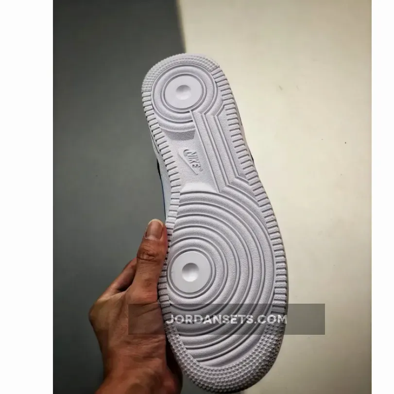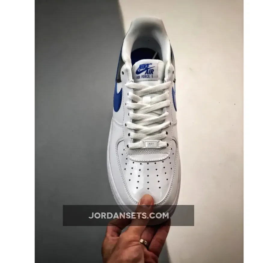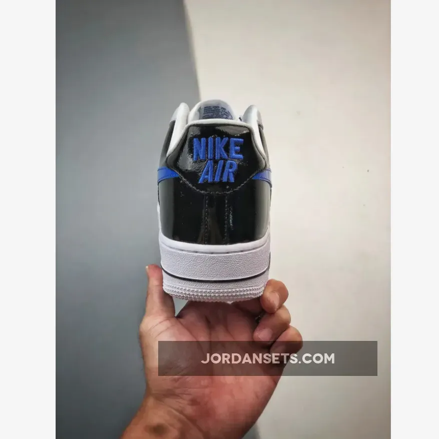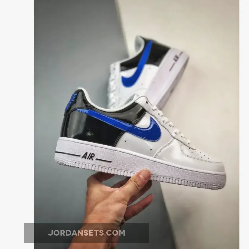 This offering of the Nike Air Force 1 Low features an all-White leather upper detailed with Blue and Black patent leather overlay on the Swooshes and heels, respectively. Mesh tongues and lining atop a White AF1 rubber sole completes the design.