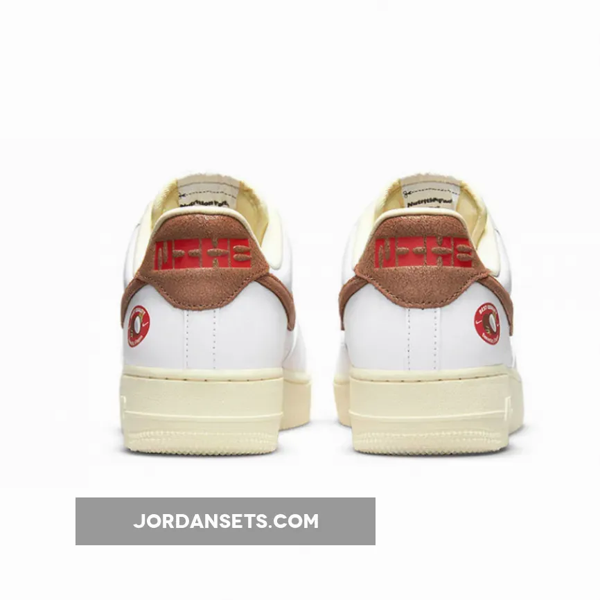 The beach-themed Air Force 1 features crisp white leather panels forming the toe boxes, toe caps, eyestays, sidewalls, and the rear section. What makes this pair truly special is the Swoosh logos and heel tabs in a brown textured finish mimicking the appearance of coconuts. This is emphasised by the coconut graphic printed on the lateral heels.