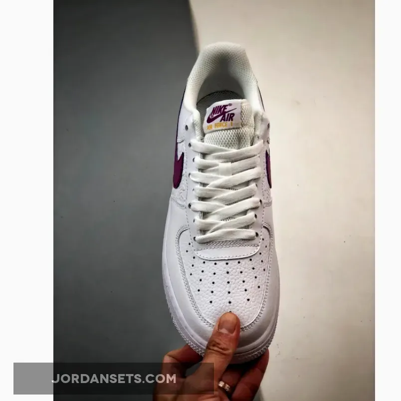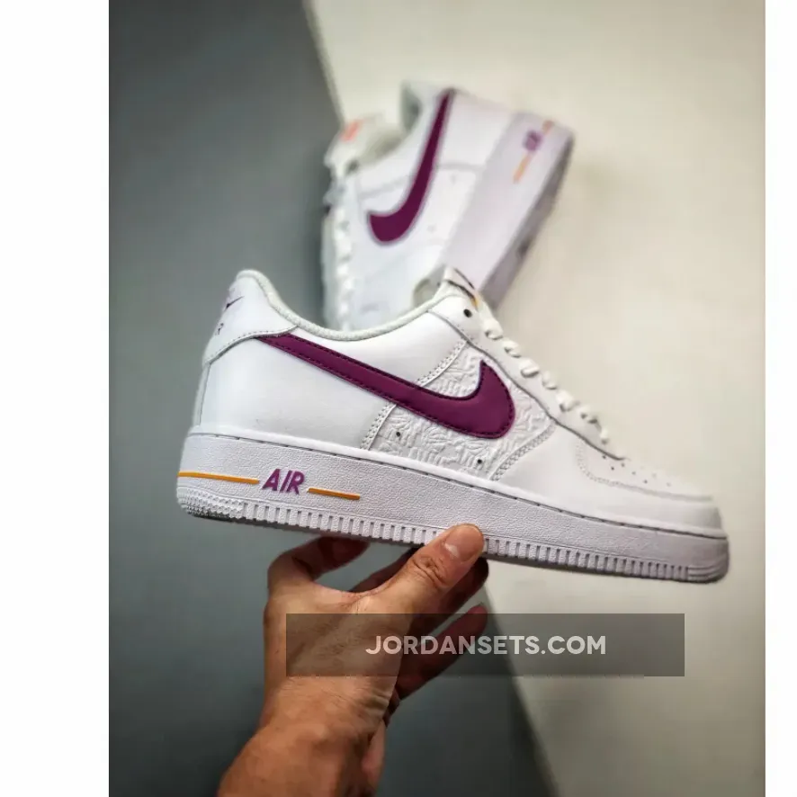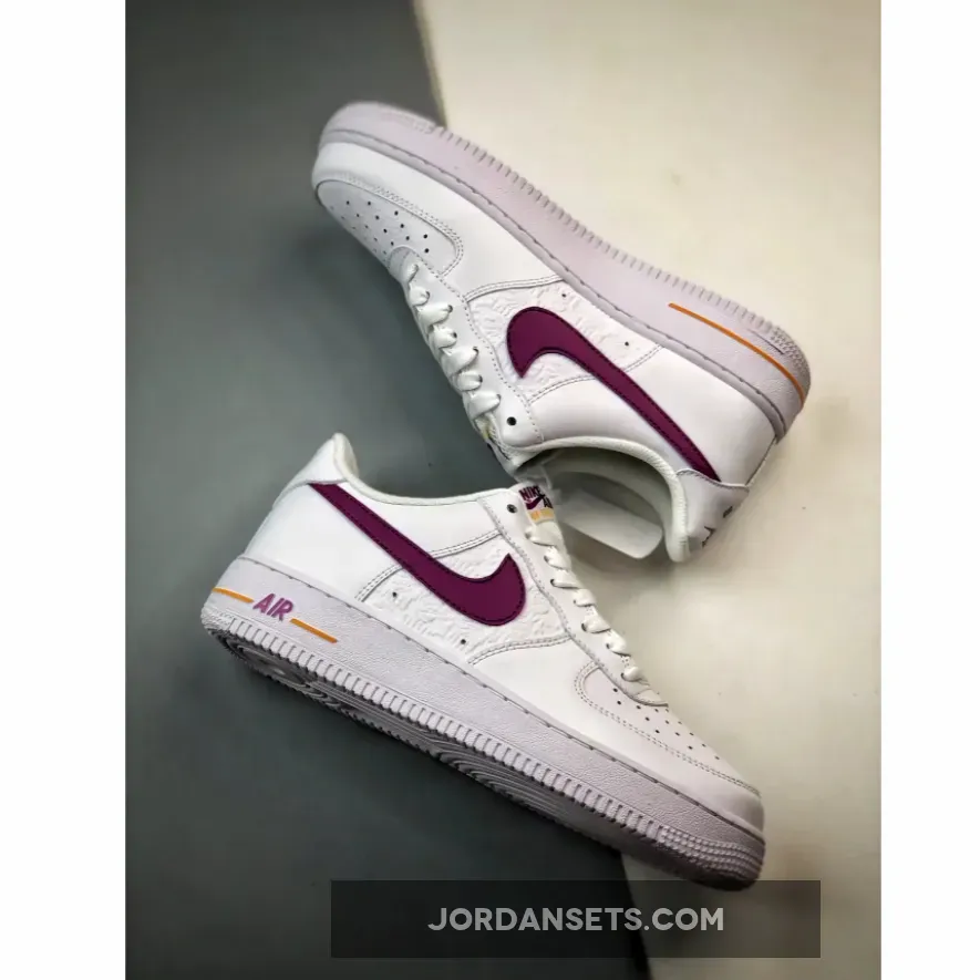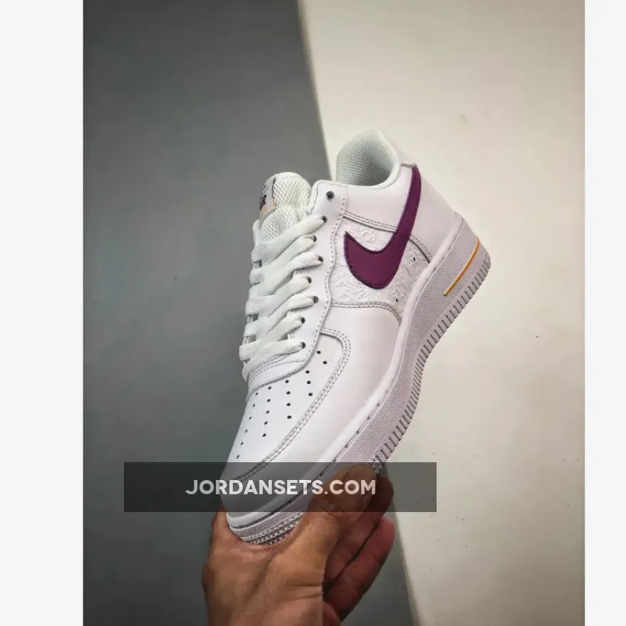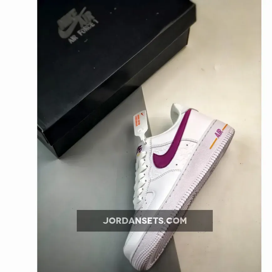 Dressed in a White, Bold Berry, and Speed Yellow color scheme. This offering of the Nike Air Force 1 Low features a White smooth and tumbled leather upper details with retro-inspired Nike Basketball motifs on the side panels. Berry branding, Yellow accents atop a White AF1 rubber sole completes the design.