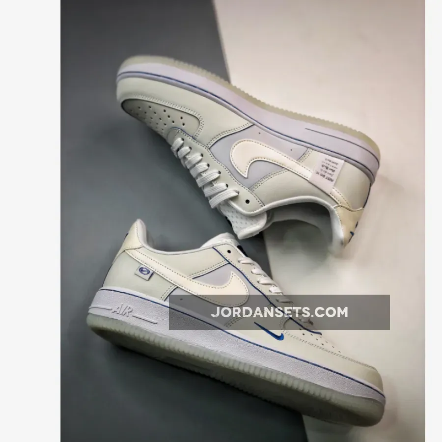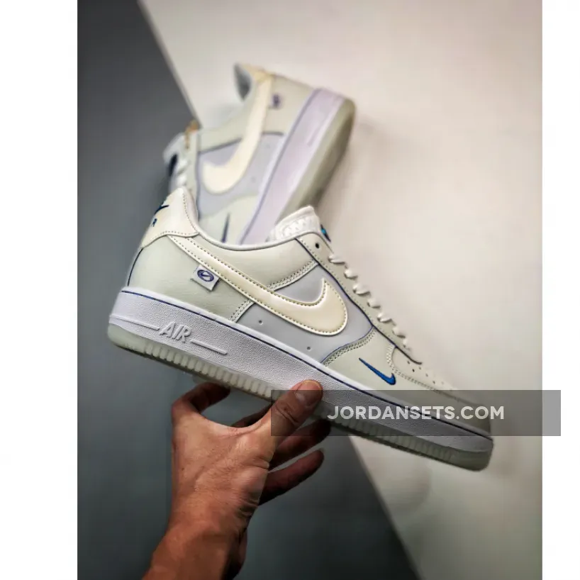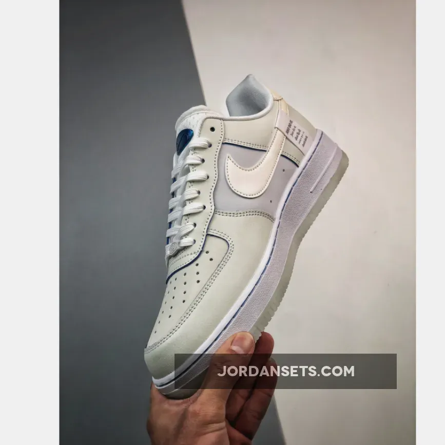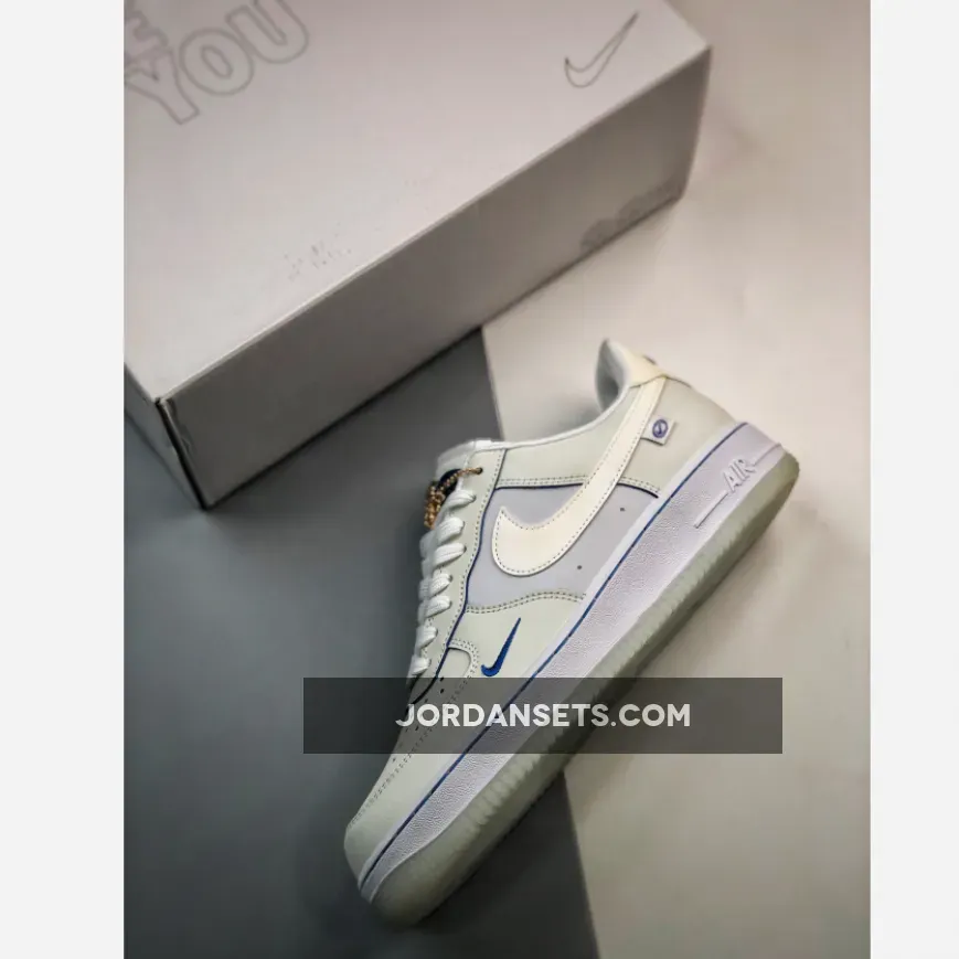 This AF1 has an entirely neutral look except for royal blue accents. The toe box is off-white in smooth leather while the tumbled leather toe cap, mudguard, the eye stay panel and foxing are in greyish white. The mid-panels are bright white smooth leather. The signature profile Swooshes on the medial and lateral sides of the shoe are smooth cream-coloured leather, matching the heel tab. Royal blue stands out in the form of the oval tongue tab with a metallic finish, the embroidered mini Swooshes on the lateral mudguard, the embroidered branding on the heel tab and the Swoosh, peace sign and global symbols on the white mesh insole.