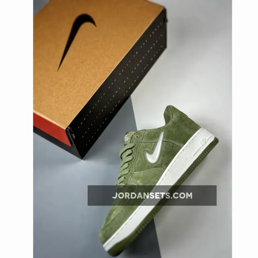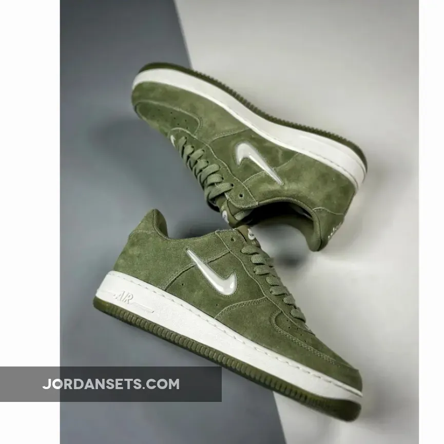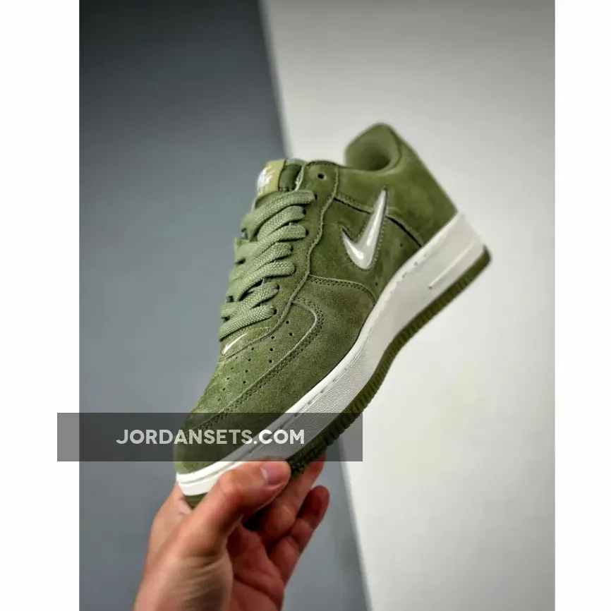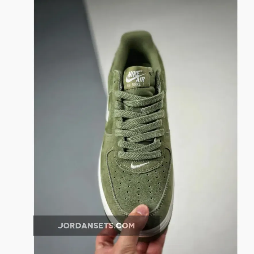 Dressed in an Oil Green and Summit White color scheme. This offering of the Nike Air Force 1 Low comes constructed in a full suede build with mesh tongues and lining.