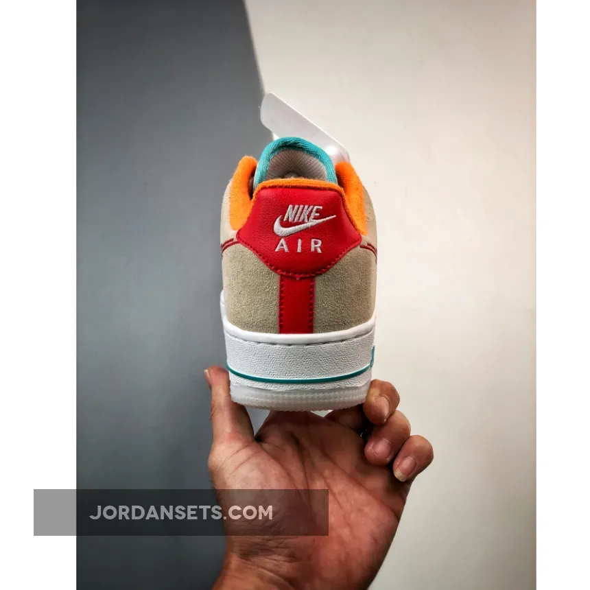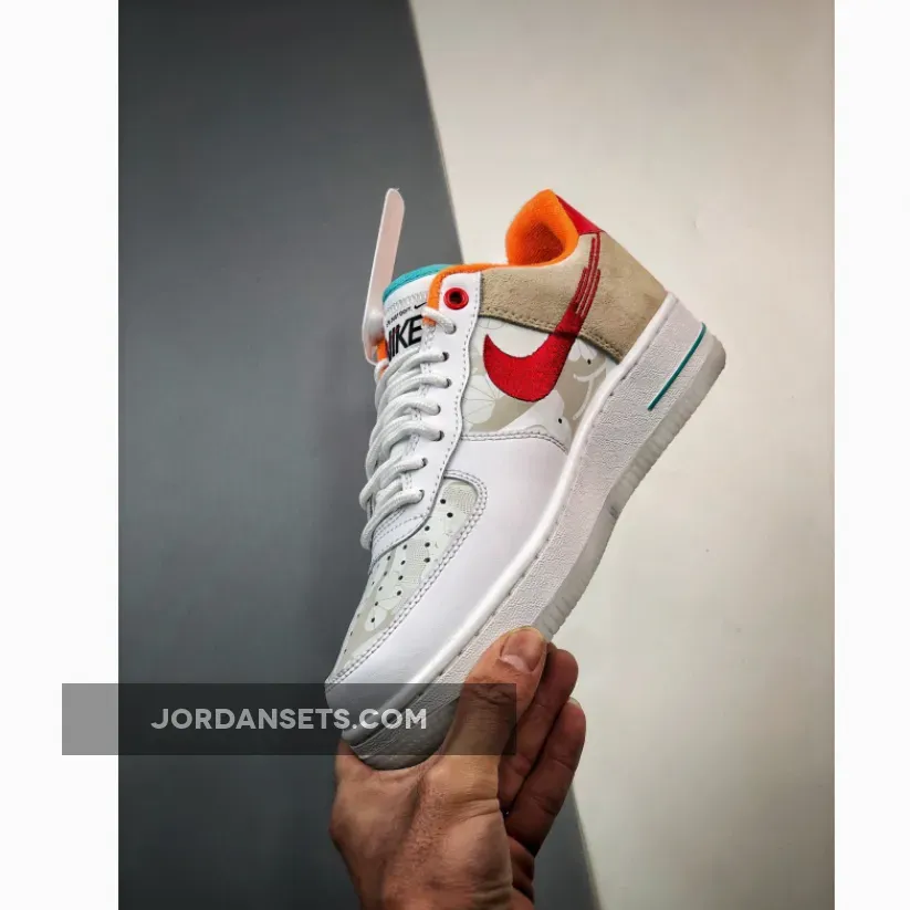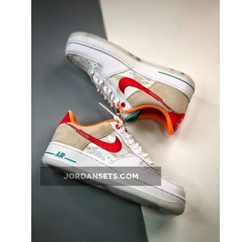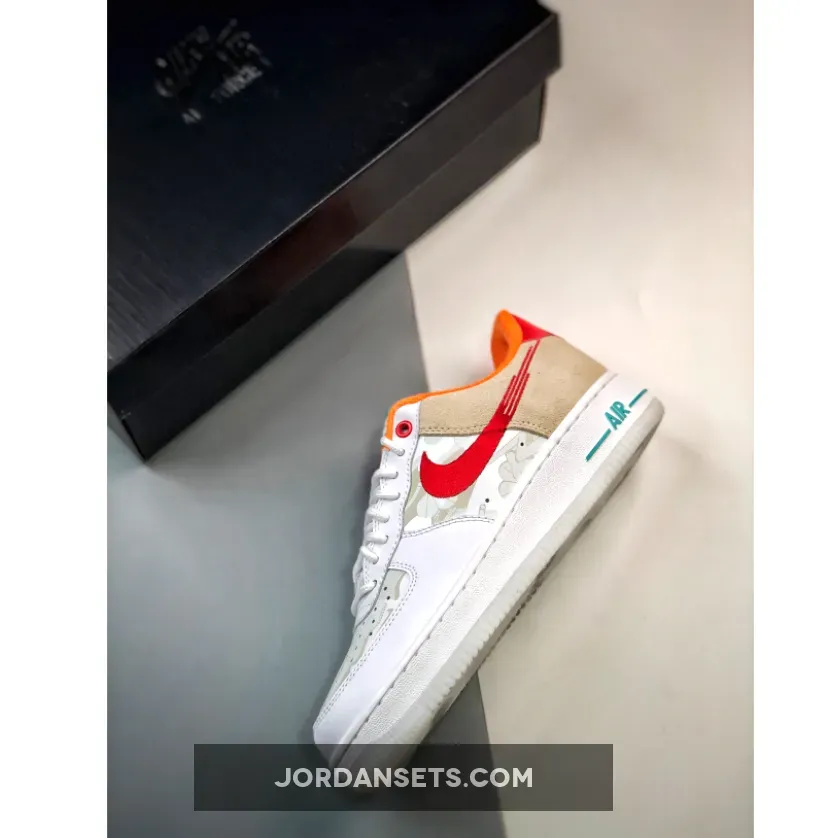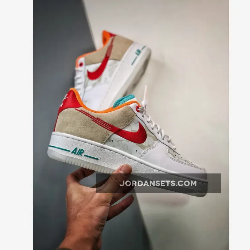 Part playful, part classic, the Nike Air Force 1 Low Just Do It White Red Teal will deliver the best of both worlds. At the forefoot, this AF1 features smooth white leather construction and a perforated toe. The look is applied to midfoot, however, it’s quickly spruced up with a flame-like embroidered Nike Swoosh. Meanwhile, the backside showcases a tan suede material that goes well with the bright red heel accent and orange collar lining. The touch of teal at the tongue also added another visual layer to this already fun Nike Air Force 1 Low iteration. This shoe closes with a chunky white sole unit with teal “AIR” branding and a semi-translucent milky white sole unit.