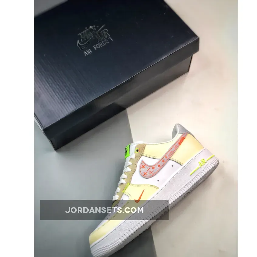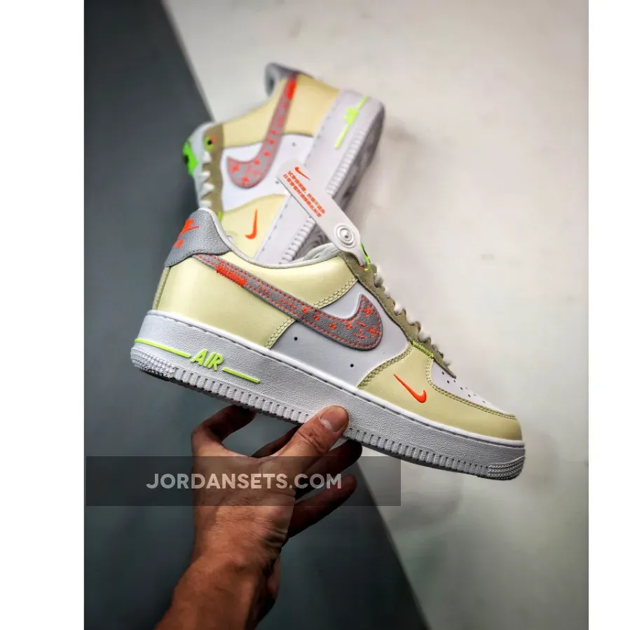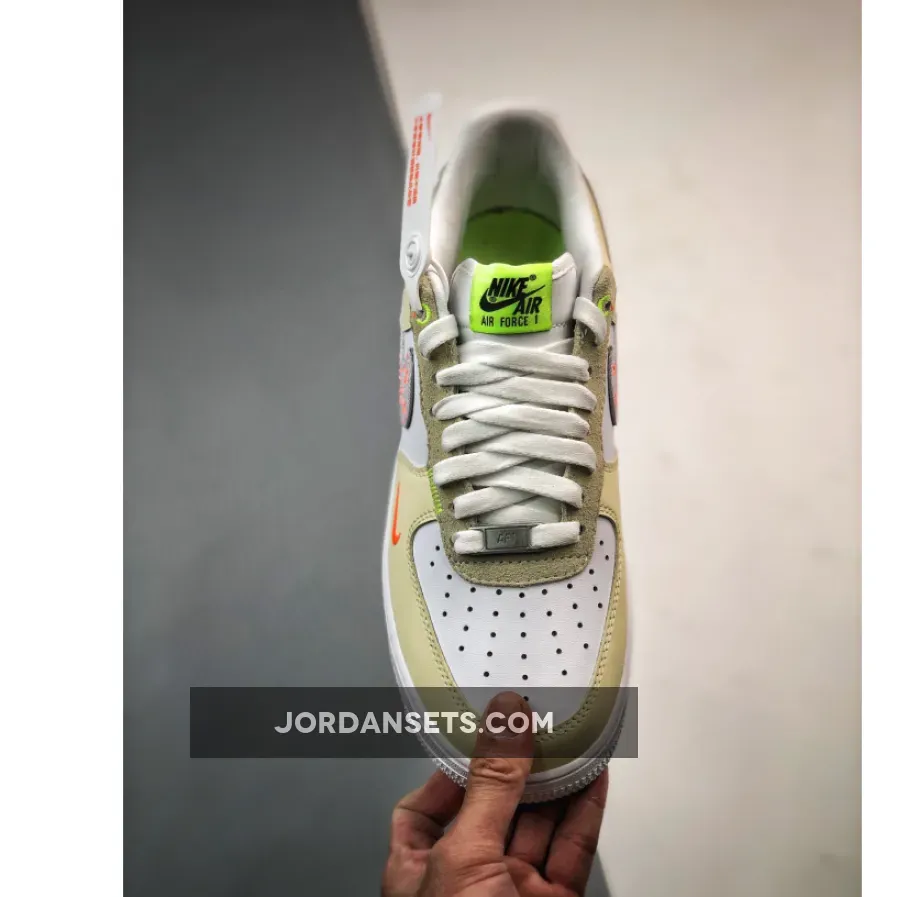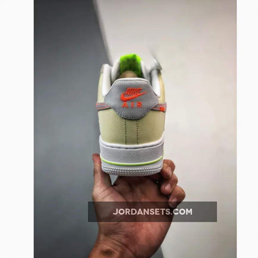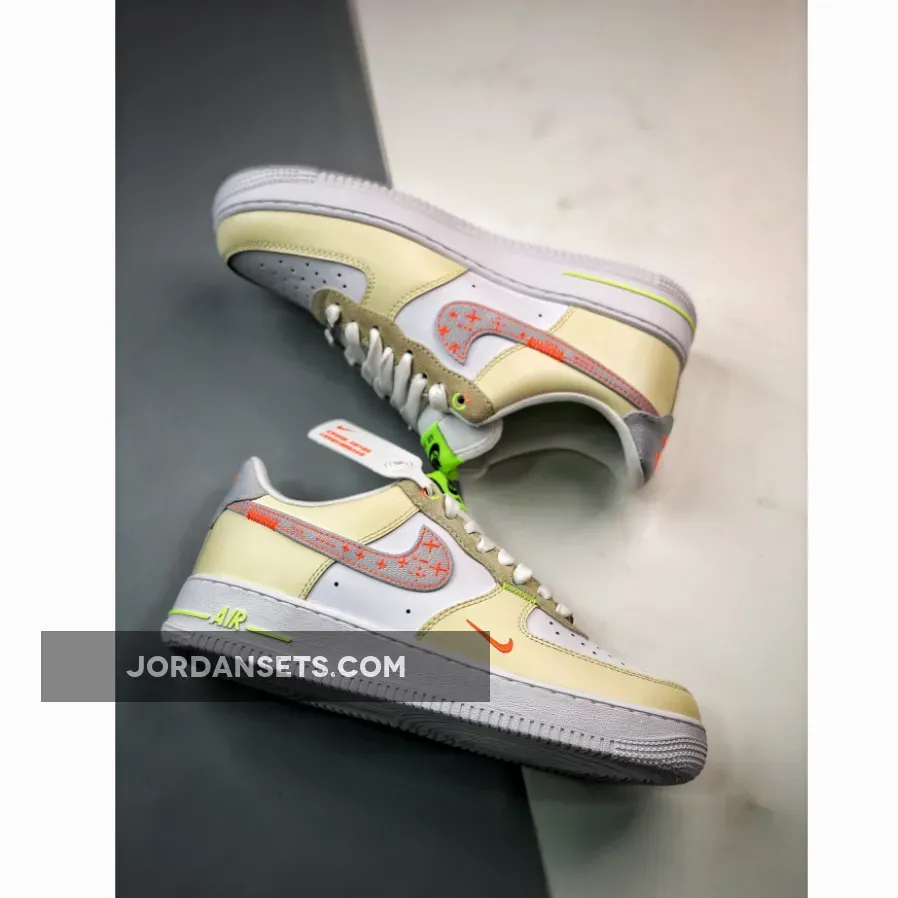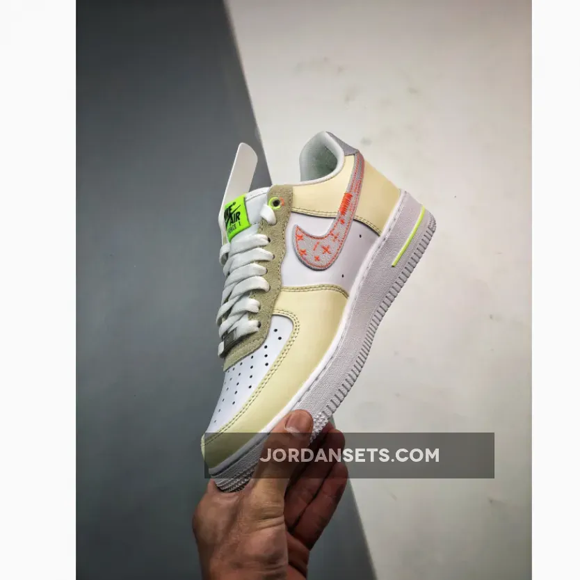 Said mending is applied to a base predominantly rendered in neutrals. White leathers, laces, and the like lay underneath and to the side of a series of suede/leather and textile overlays, which are dressed in shades of tan and grey, respectively. Neons, then, come in not just by way of the branding but also through the darning itself, whose threads are bold in their choice of Volt and an equally vivid orange.