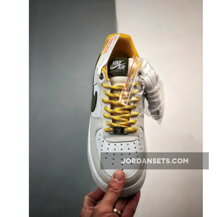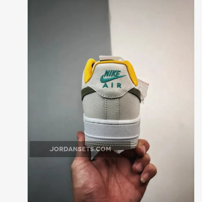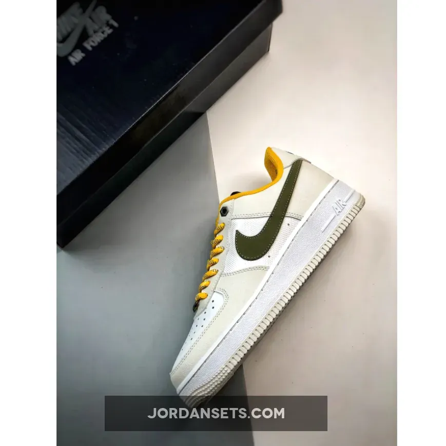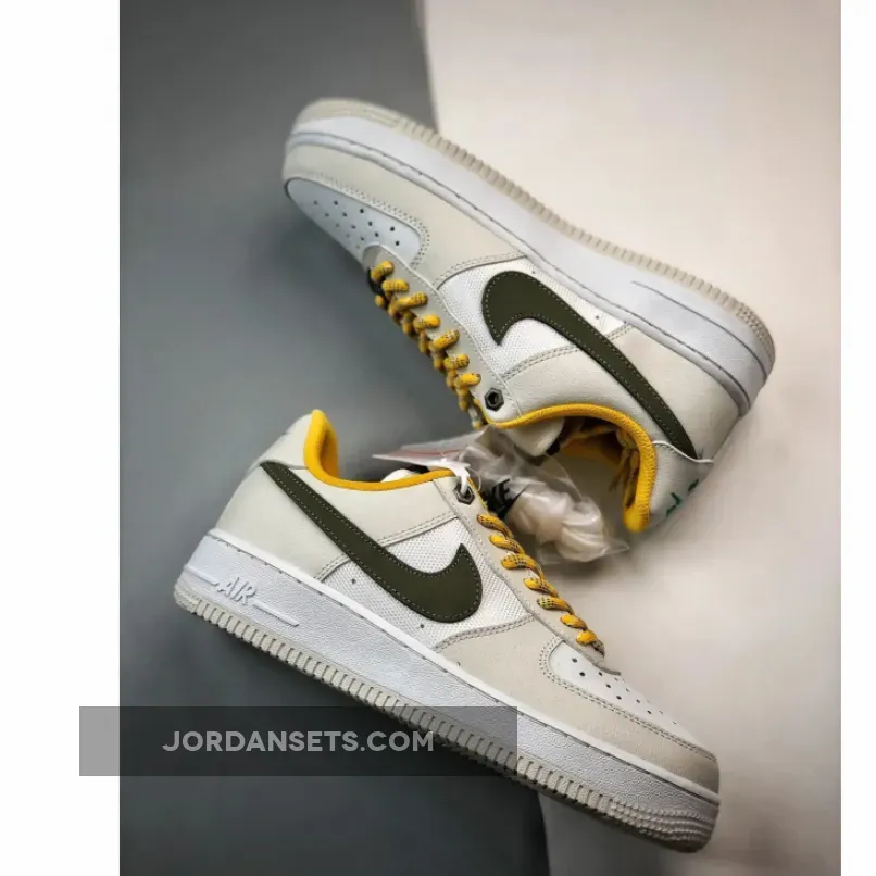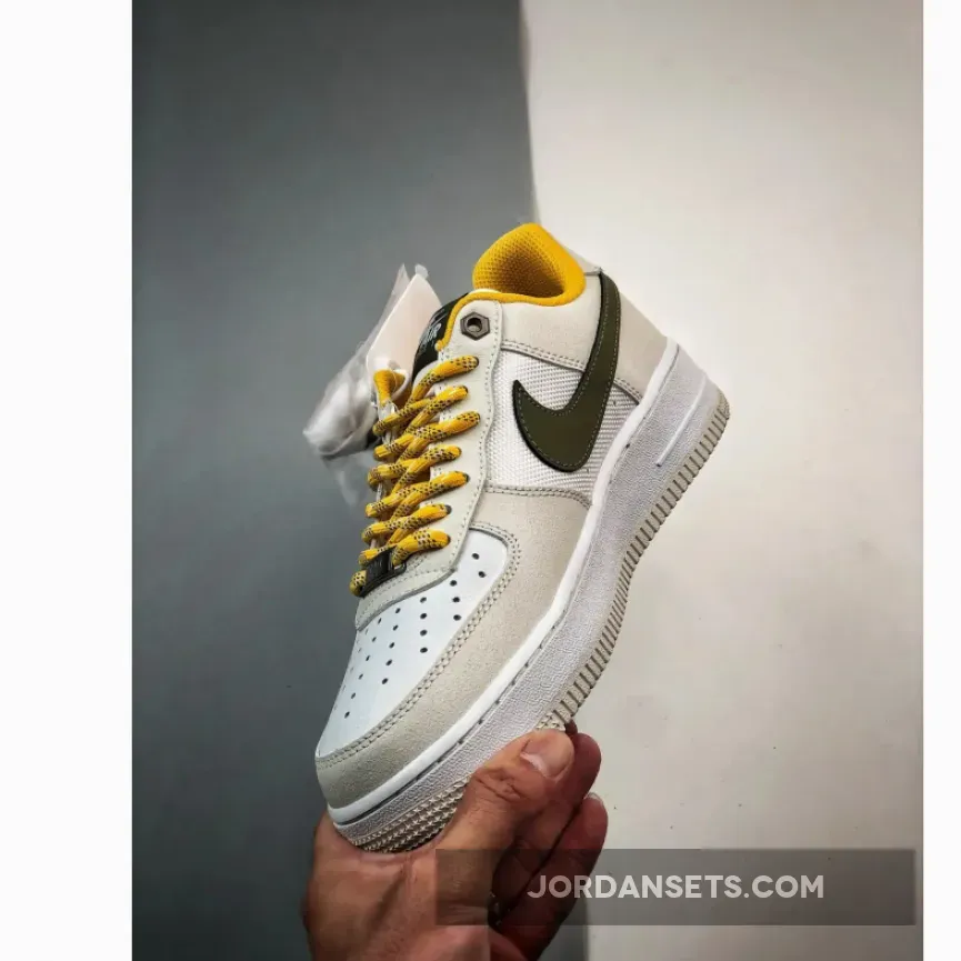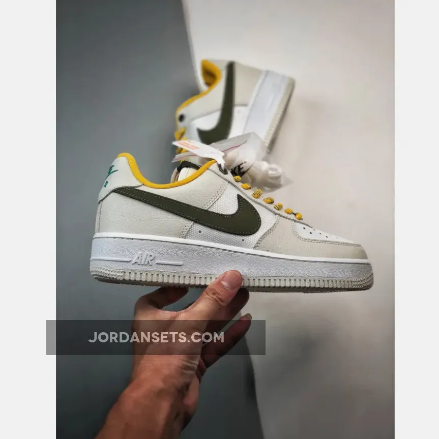 This shoe boasts a mix of high-quality materials like textured leather, suede, and mesh. The design showcases a Summit White base with Light Bone overlays, complemented by Cargo Khaki Swooshes and tongue labels, catching everyone’s attention. Notably, it includes Vivid Sulfur rope laces and inner lining, along with Clear Jade insoles and heel branding, adding a unique touch. The metal upper eyelets contribute to its premium look, while the White midsole and Grey rubber outsole complete the overall design.