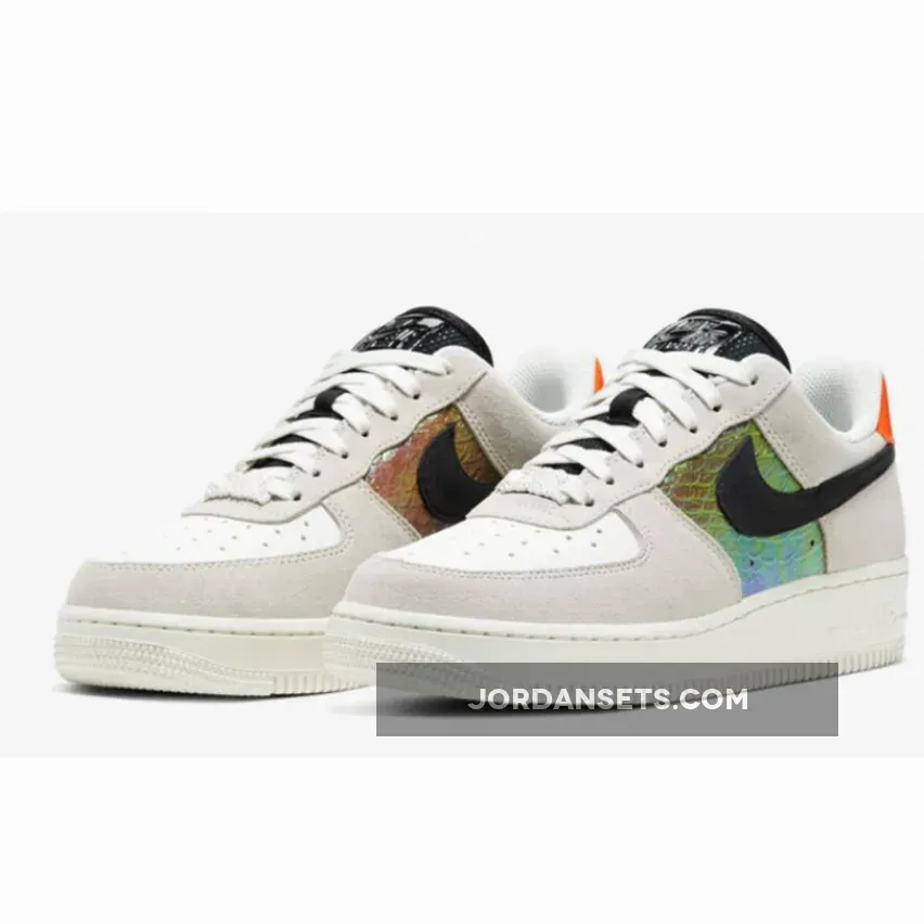 Dressed in a Light Bone, Sail, Hyper Crimson, and Black color scheme. This Nike Air Force 1 features a White leather toe, Grey suede overlays, Black suede Swooshes and mesh tongues with vibrant Orange heel overlays. Highlighting the shoe is its iridescent snakeskin side panels completed with Aqua insoles atop a Sail rubber sole.