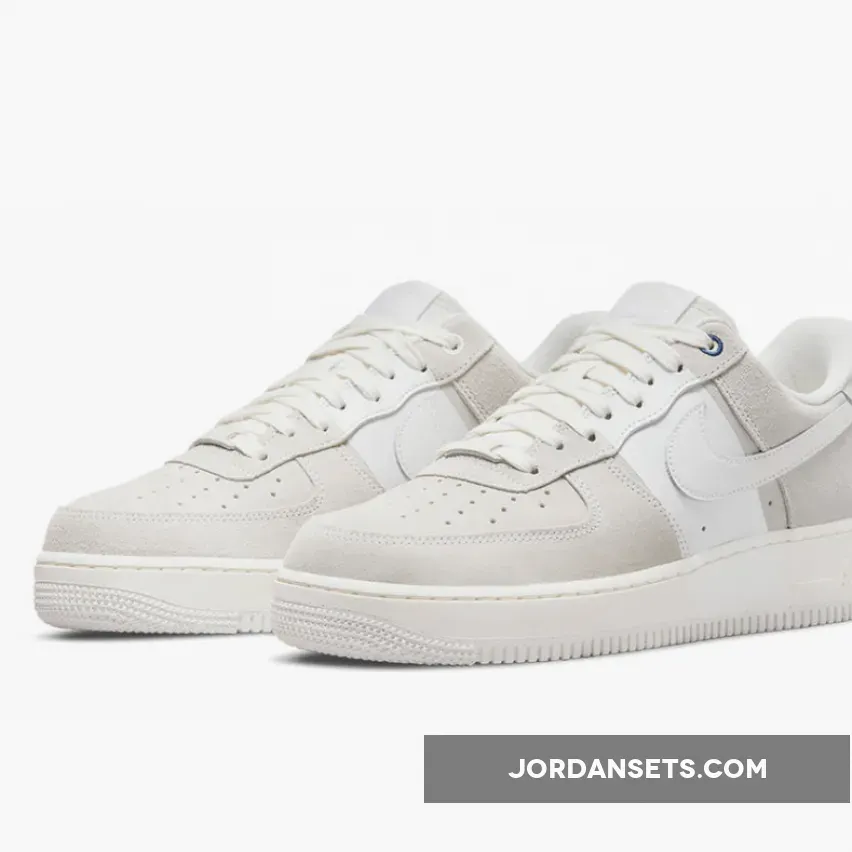Light grey suede completely wraps the vamp and the heel panel section leaving the mid-panel completely white. A white leather Swoosh on both the medial and lateral sides sweeps across the white mid-panel and continues on to the heel section. The white heel tab has the Chinese characters of “NAI-KE” embroidered in white.