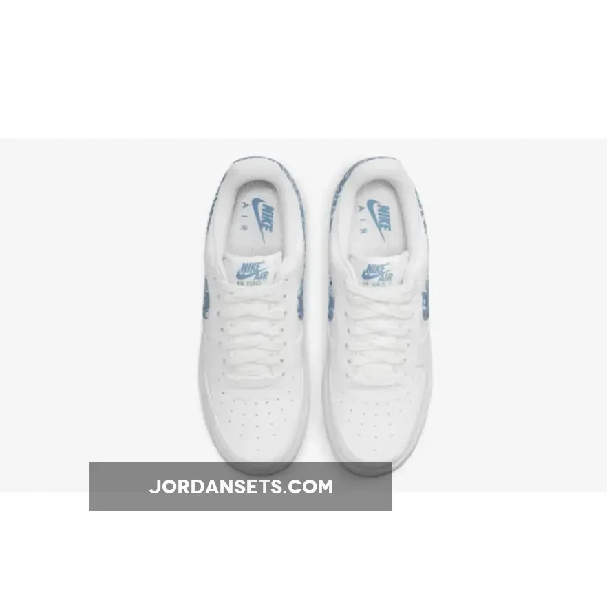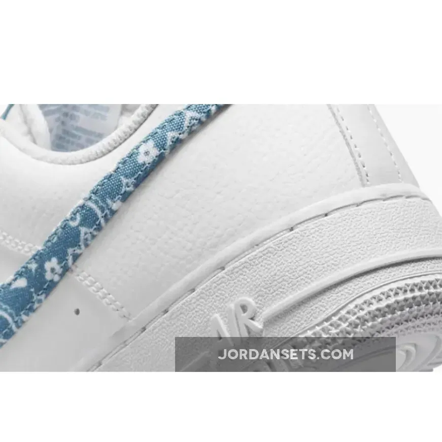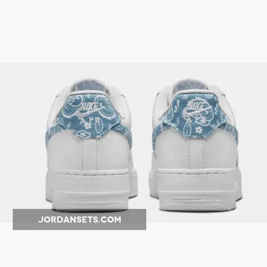 This undefined’s upper is white-on-white tumbled leather from heel to toe, matching the laces, the mesh sock liner, the midsole and the outsole. This makes the perfect backdrop for the profile Swooshes in “Worn Blue” twill, featuring the paisley bandana print. The “Worn Blue” paisley print is also on the heel panel with an embroidered Nike logo in white. The tongue tab features Nike AF1 branding in “Worn Blue” on white. This pair also comes in a black variant.