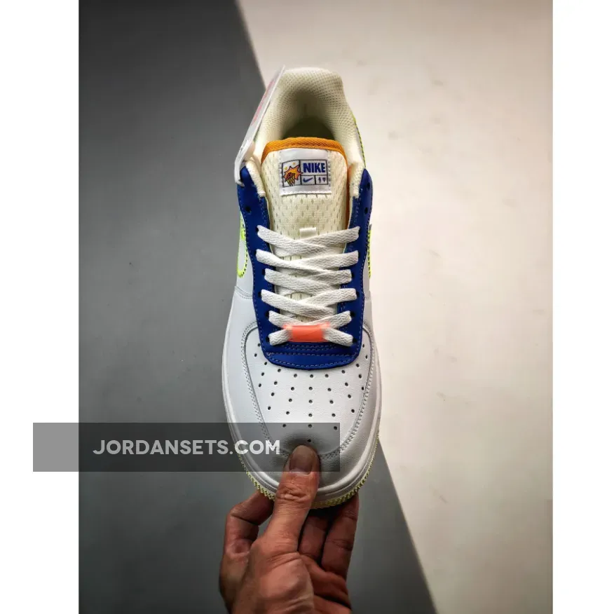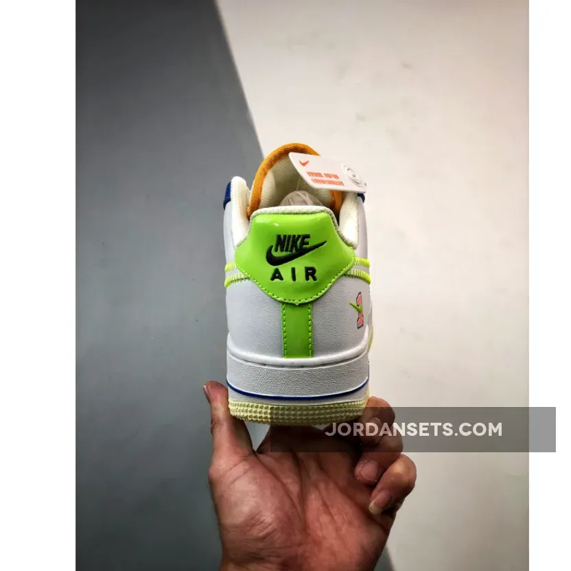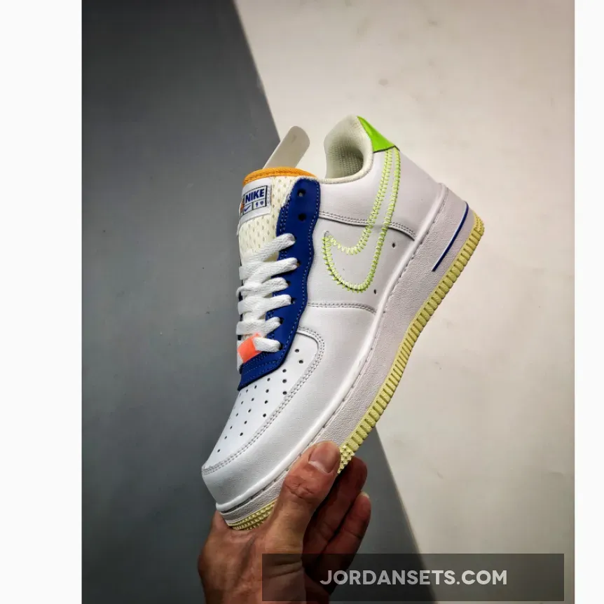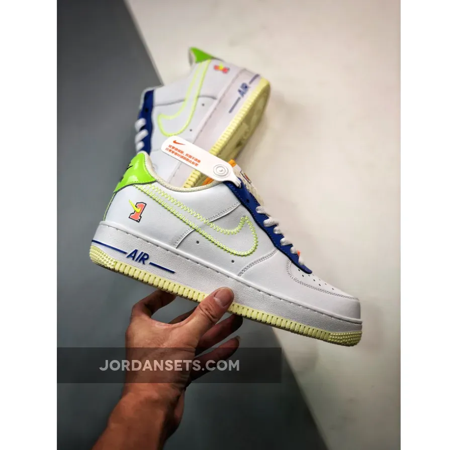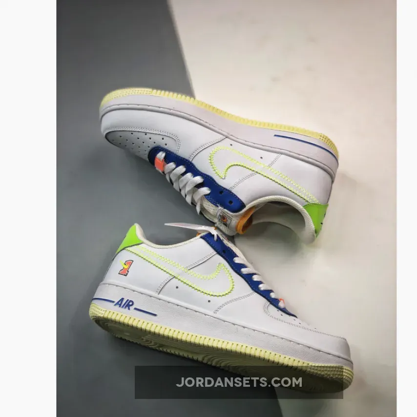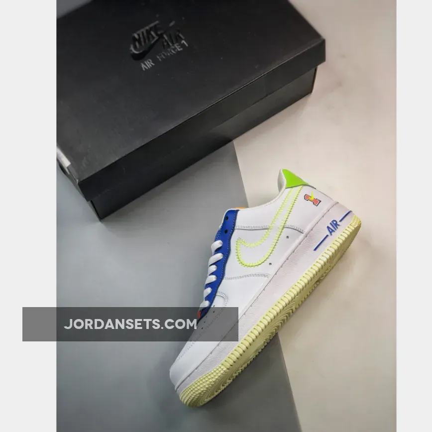 Nike’s first-ever basketball shoe that featured Air technology and revolutionised sneaker culture, the Nike Air Force 1, brand-new smaller-sized release that’s inspired by the online gaming world. Presenting the Nike Air Force 1 Low GS Player One White Blue.This AF1 has a clean and “colourless” smooth white leather upper, from heel to toe and base to overlays, creating a pristine backdrop for all the colourful, vibrant accents. Pops of Royal Blue come in the form of the Nike text branding on the tongue tab and the eye stay panel. The white signature profile Swooshes on both sides of the shoe feature neon Volt-coloured exposed stitching. The heel tab follows suit, featuring black Nike Air branding that matches the spine accent. The “Number 1” graphic on the lateral heel matches the salmon pink lace deubrés.