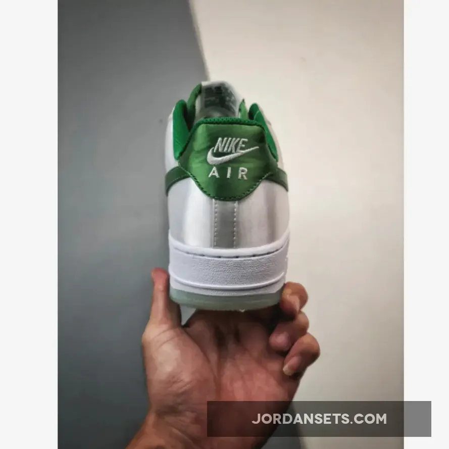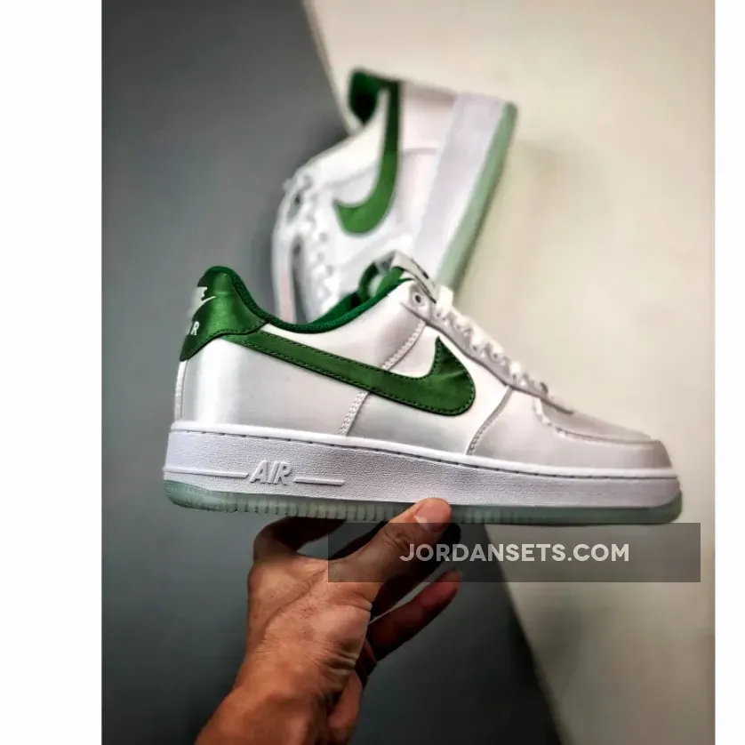 Nike’s Bruce Kilgore-designed b-ball sneaker that first featured the brand’s revolutionary Air technology, the Air Force 1, has a fresh edition featuring satin and refreshing swatches of green. Check out the Nike Air Force 1 Low Satin “White Green”.This low-cut AF1mirrors some elements of the silhouette’s “Triple-White” aesthetic. However, this model swaps out its usual leather upper with a lustrous satin construction that travels from the tongue to the heel. The signature profile Swooshes that sweep across both the medial and lateral mid-panels are in a deep pine green, matching the tongue lining, the mesh sock liners and the Nike branding on the white tongue labels and the white insoles.