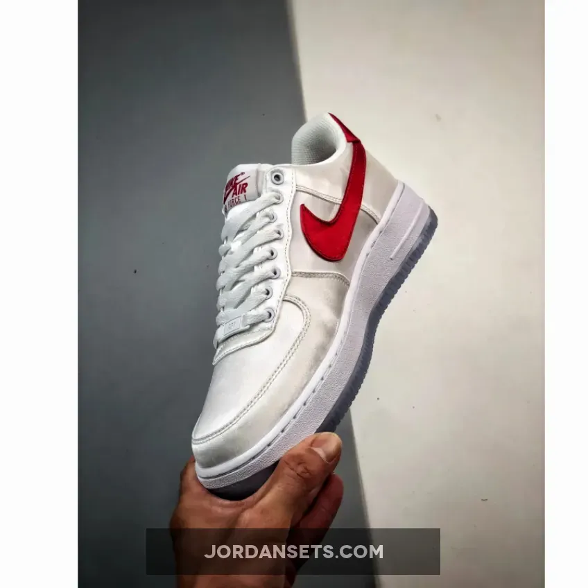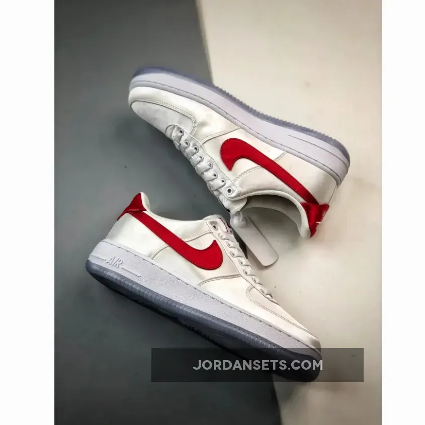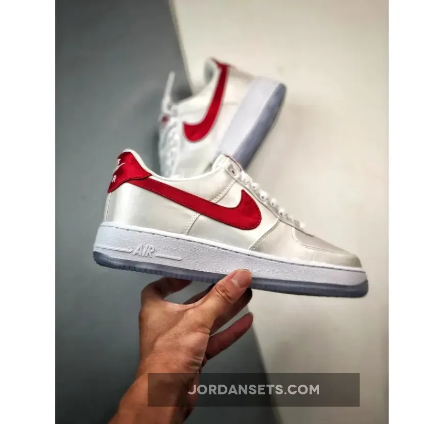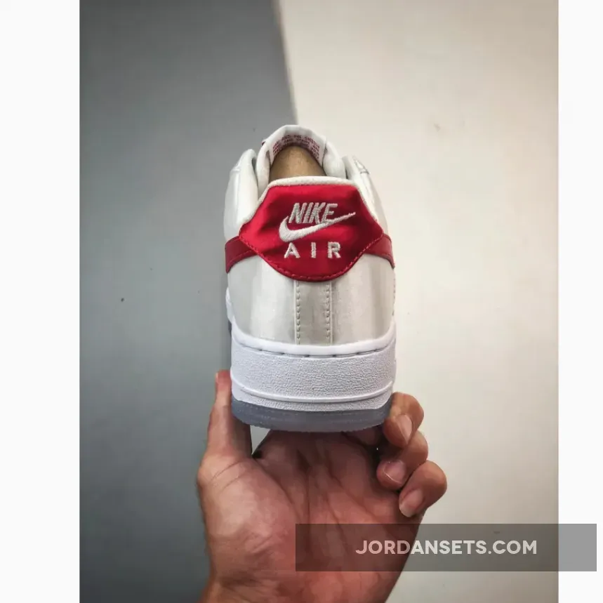 The lustrous weave has also been used aplenty with Nike’s basketball shoes from the 1980s. More commonly seen in the Vandal and Terminator, satin is now featured on this upcoming Air Force 1 Low. Clean white uppers are matched with a vibrant red on the Swoosh, heel, and tongue logo, while an attractive translucent outsole adds an emphatic flair.