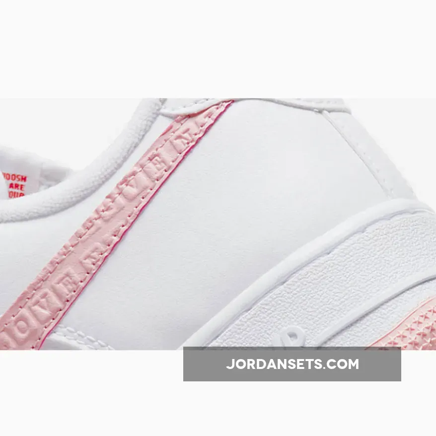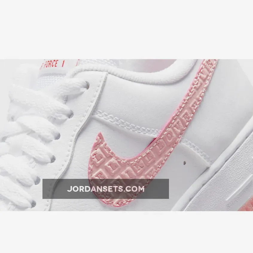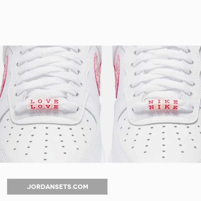 Another Nike Air Force 1 joins the brand’s Valentine collection with the Nike Air Force 1 Low Valentine White. The entire AF1 is dressed in white tumbled leather from heel to toe, making the signature profile Swooshes on both the medial and lateral sides of the shoe stand out in baby pink. Not only that, the words “NIKE” and “LOVE” are raised across the baby pink surface. The same words are repeated on the square charms across the vamp of the shoe, “LOVE” is spelled out in red letters on the left shoe while “NIKE” is spelled out on the right. Nike Air branding in red stands out on both the white tongue tab and the white heel tab.