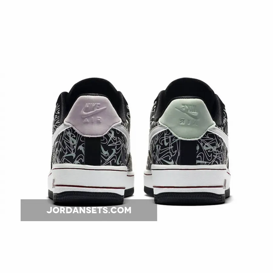 This offering of the Nike Air Force 1 Low features a Black leather upper covered in mini Swoosh logos with White leather Swooshes on the sides. Heart logos on the tongues, Mint and Pink heels and insoles that read, “U Complete Me” completes the design.