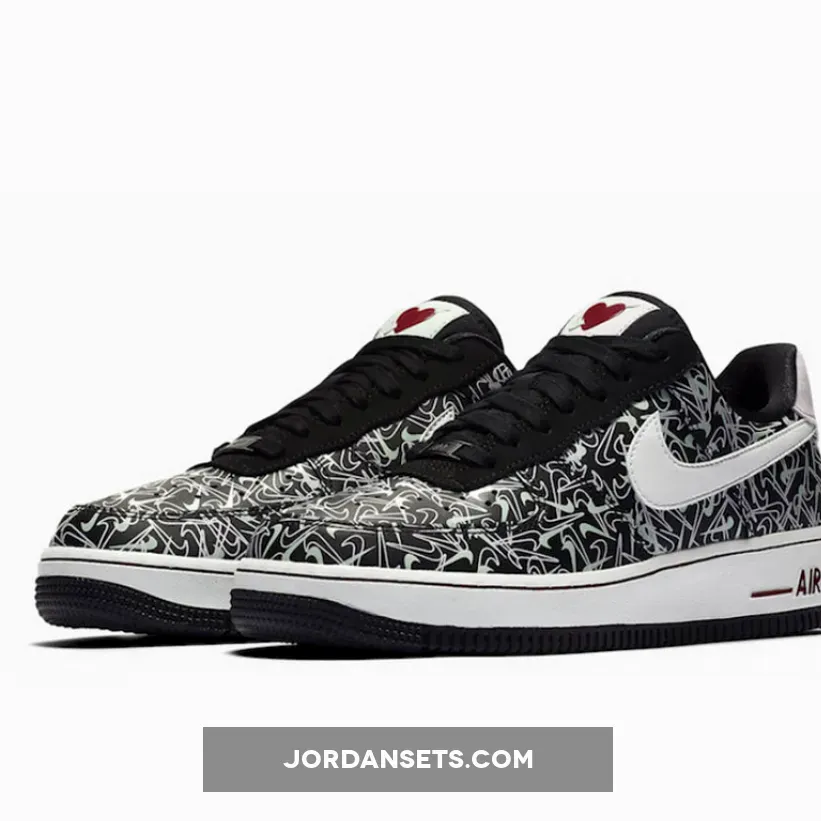 Loving the classic AF1 silhouette with a Valentine’s Day twist! ? Black leather upper with mini Swoosh & heart logos? ? White midsole & outsole just right. Perfect for sharing the love! ❤️ #NikeAF1 #ValentinesSneakers #ShoeGameStrong ??✨
