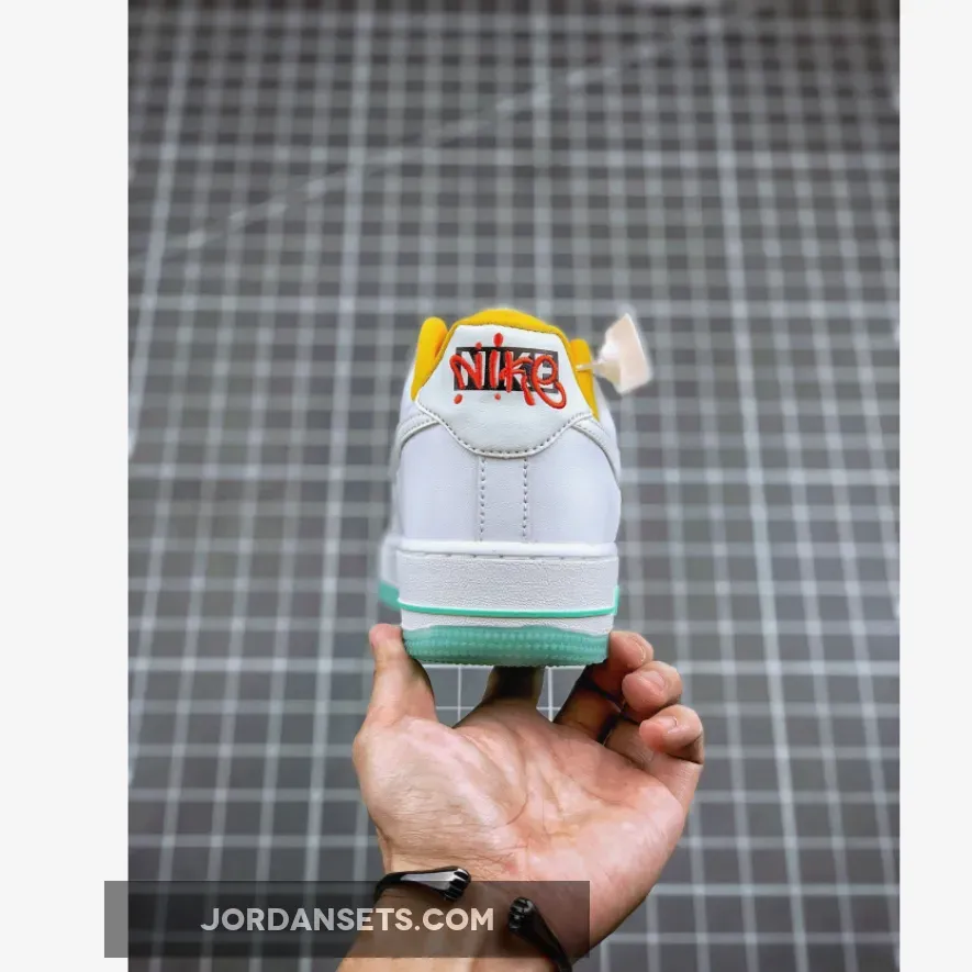 pictured above and below, starts out with a classic all-white base, but before too long the pair is transformed by-way-of Legend Blue-like outsoles, vibrant golden-yellow liners and flashes of pastel crimson on the ripstop-like tongue. But the latter isn’t the only noticeable material switch-up, with slatted mid panels and pre-cracked leather Swooshes and heel overlays. The latter is finished off with dual black and scribed branding; the script weaves its way in and out of the underlying logo that truly shows Nike’s attention to detail.