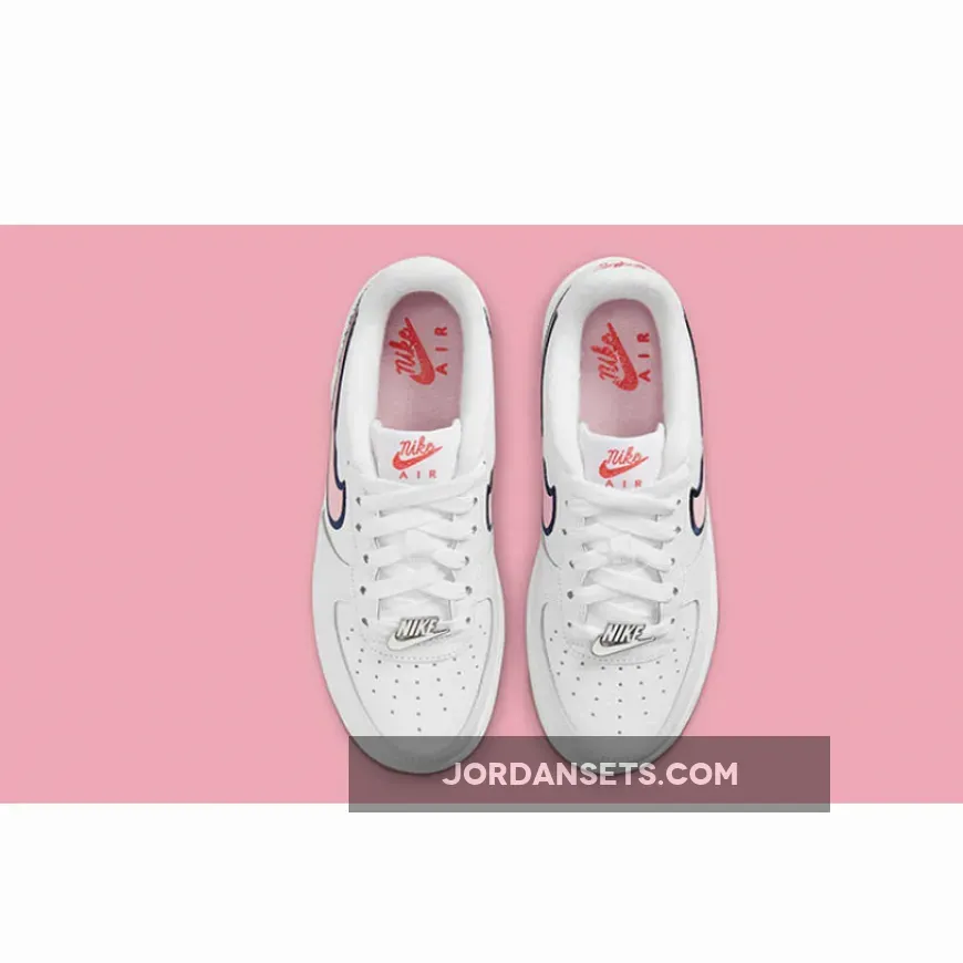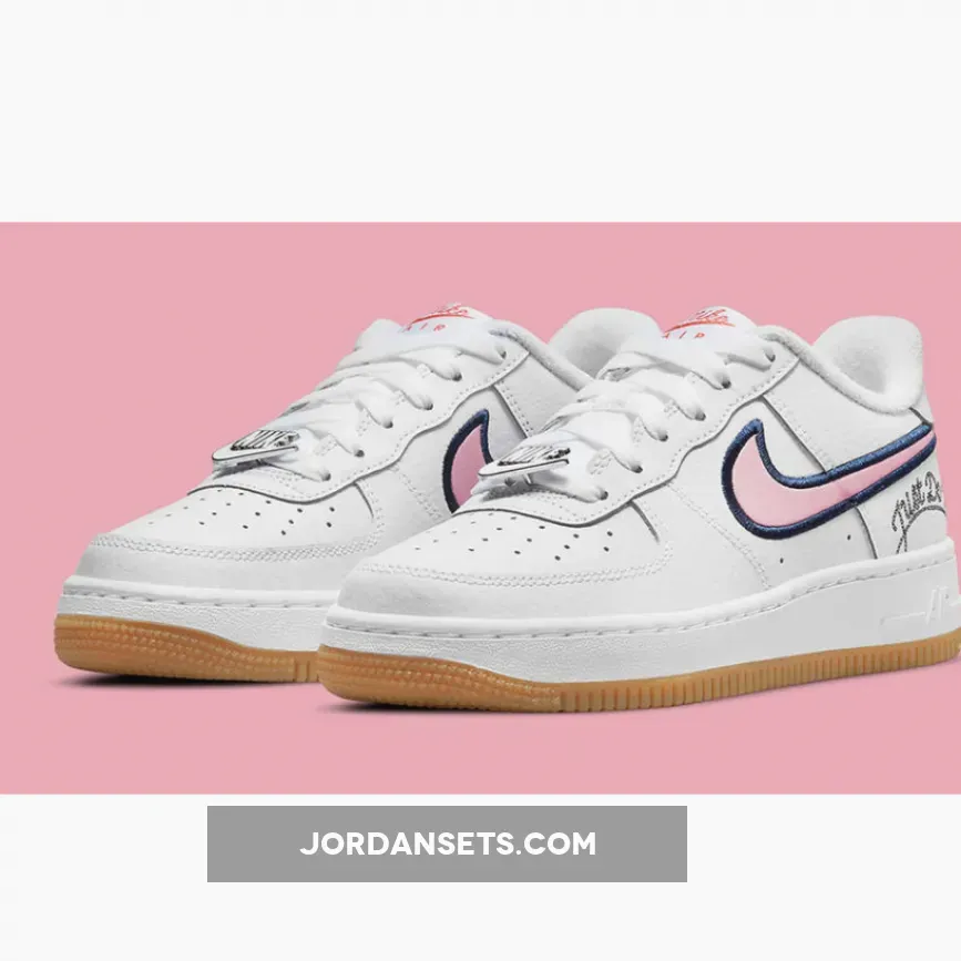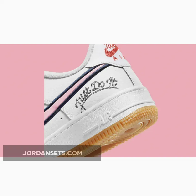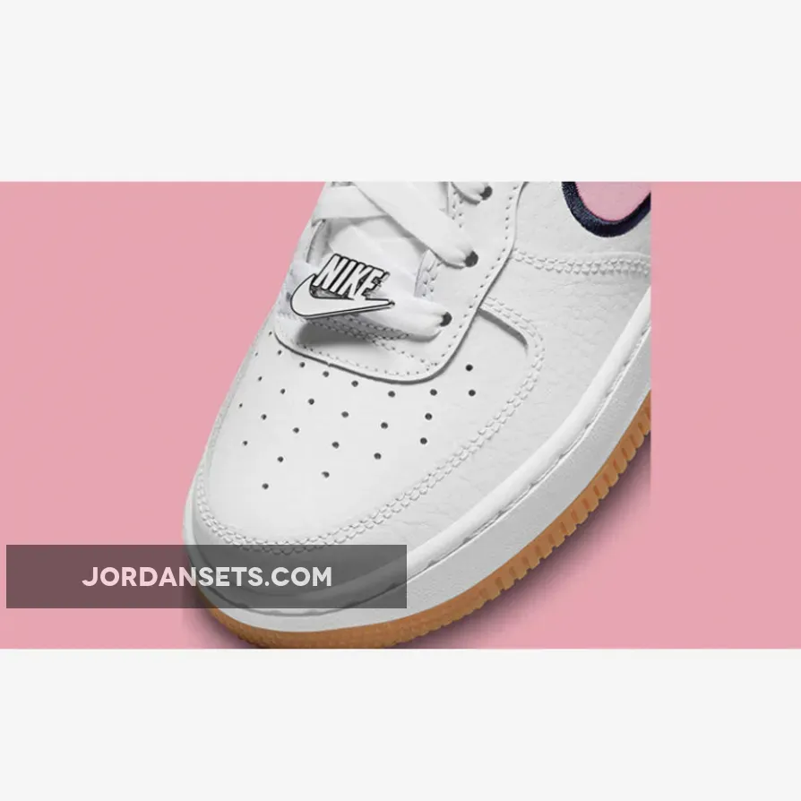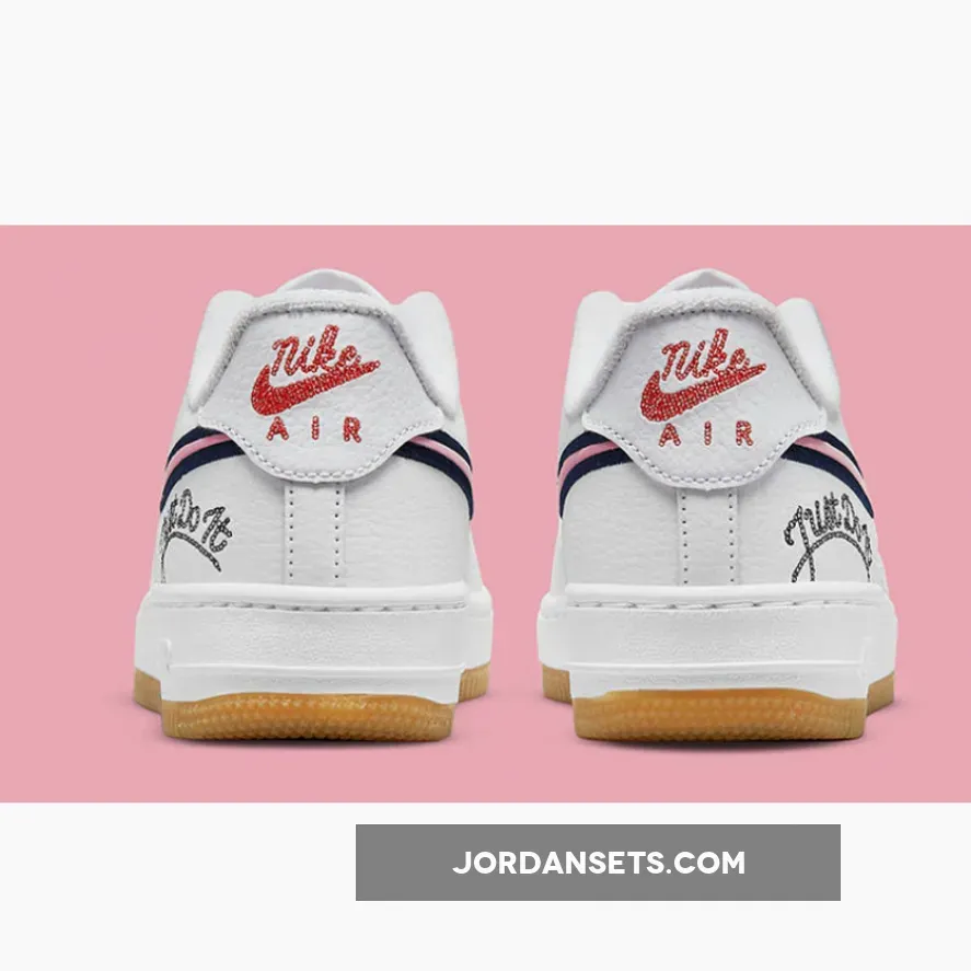 White tumbled leather dominates the base for a near triple-white aesthetic. Similar to the lettering found on a letterman’s jacket, the pink profile Swooshes are animated by navy embroidered outlines. Varsity themes continue with “Just Do It” printed on the lateral side of the heel in a cursive font that mimics the look of embroidery. Even the red Nike logos on the tongue and heel tab are stylized similarly to maintain the letterman’s jacket aesthetic.