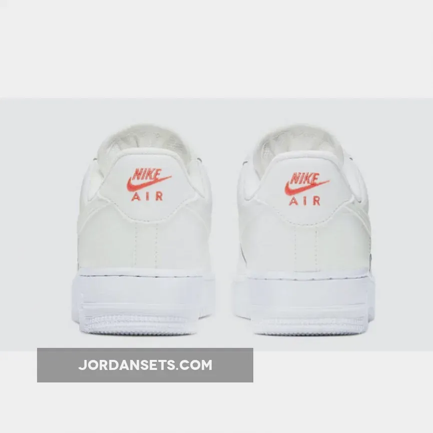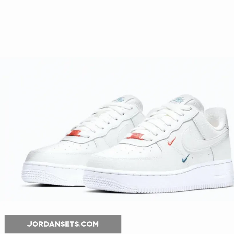 Firstly, this Nike Air Force 1 Low comes dressed in a Summit White and Solar Red color combination. Highlighted with White tumbled leather on the upper while smooth leather covers the Swoosh. In addition, mesh lands on the tongue while mini Swooshes hits the panels in Orange and Teal.