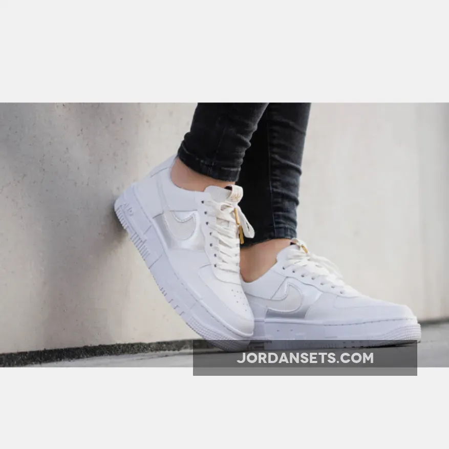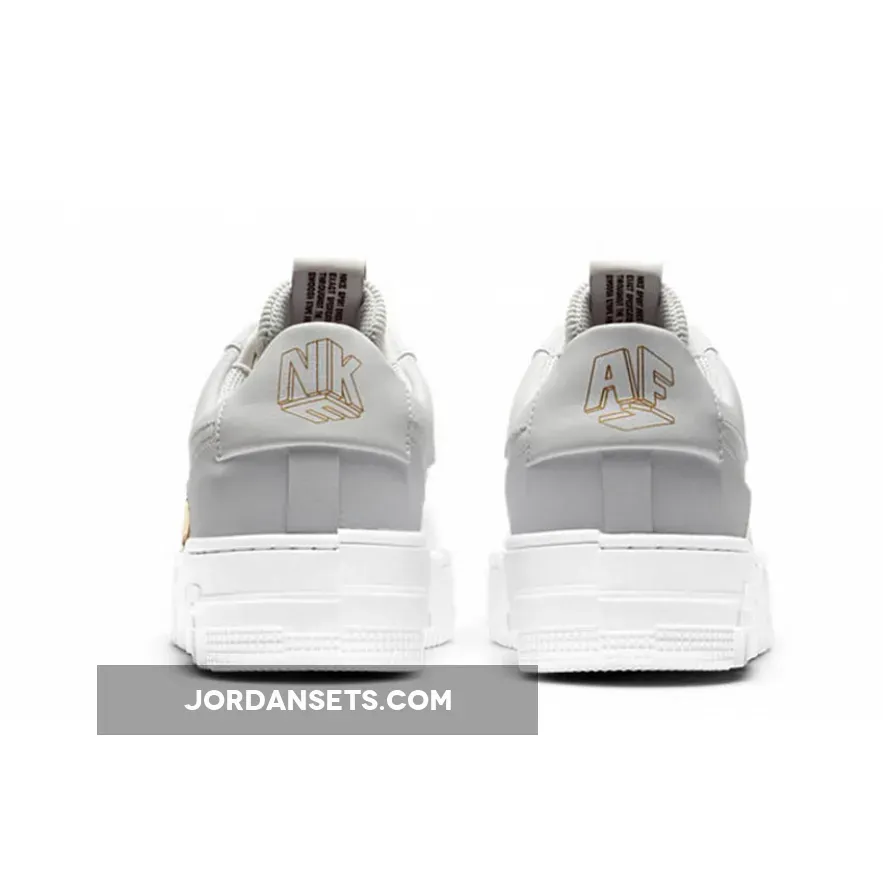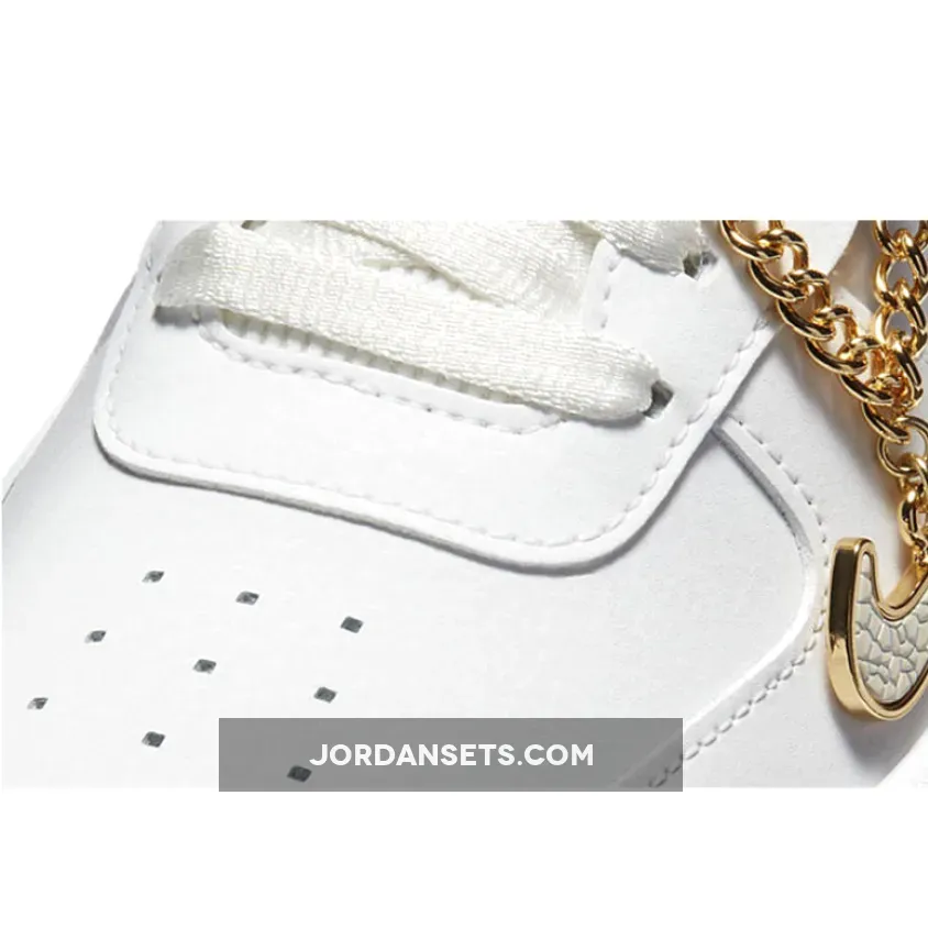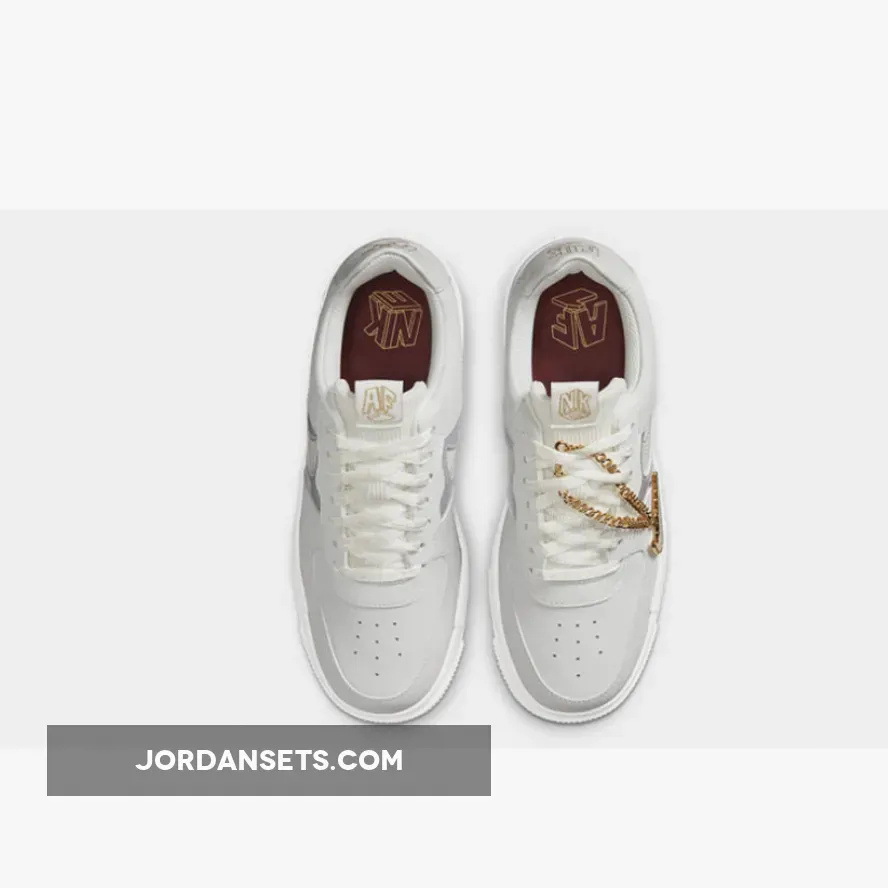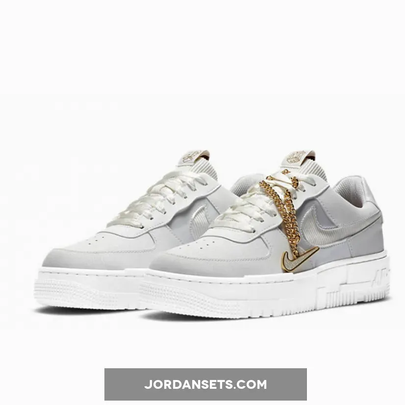 The Nike Air Force 1 Pixel Grey Gold Chain is a brand new exclusive model of the timeless silhouette that has been a fan-favourite by basketball players, sneakerheads, and hip-hop artists throughout its year. The latest Air Force arrives in a blinged-out version that will be a sure head-turner everywhere you go.First released in 1982, Bruce Kilgore’s AF1 silhouette has gone through countless reiterations. From high heat collaborations, deconstructed models and even jewellery-inspired pairs, the shoe has always been a staple piece for fashion enthusiasts across the globe. If first look at the pair instantly nods to your sneaker collection, keep reading on for a closer look.Decked out in a clean light grey and white metallic colorway, gold accents highlight core components of the shoe, this includes the additional branding on the tongue tab and insoles. This is followed by a Swoosh pendant in the form of a gold-tone chain link attached to the forefront, making it the eye-catching feature of this model.While Swoosh cutouts make their way across the quarter panels, they are then filled in with premium pleated fabric for a textural contrast thus adding great value to them for the cutting edge look.