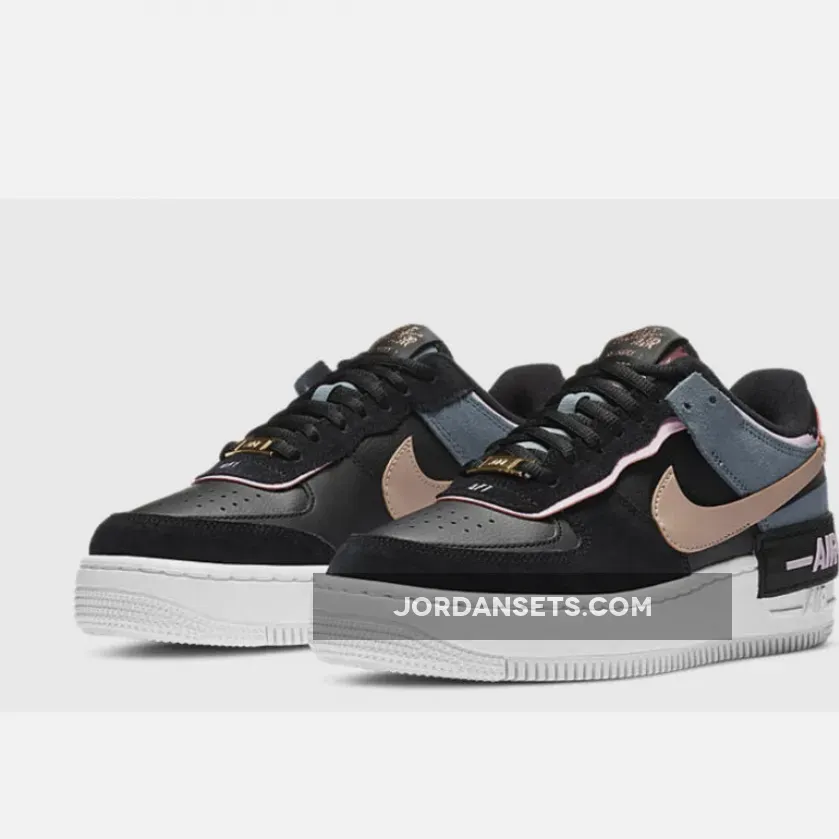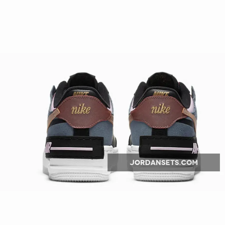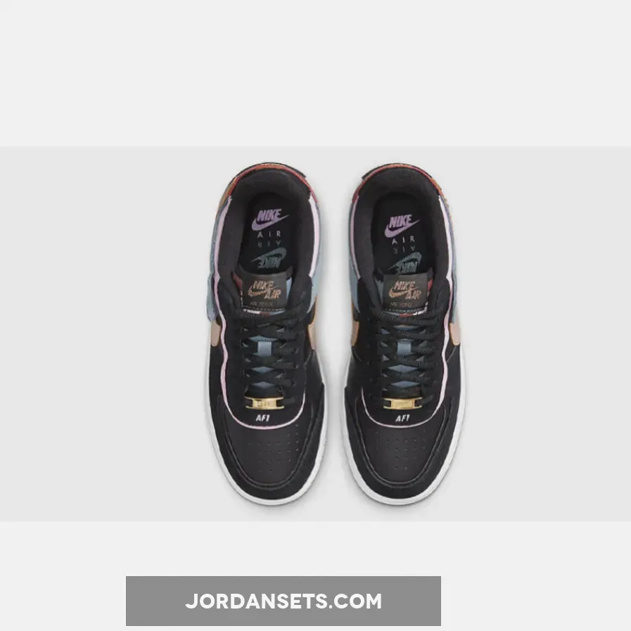 A colourblocked, multitextured upper is crafted from a leather base with suede and metallic overlays. Black laces down the throat contrast with the dusty-blue tongue and golden lacelock leading down to the delicate AF1 logo embroidered at the toe box. Baby pink velvet piping surrounds the eyelet area and the Swoosh arrives in a beige hue to tone down the darker colour palette. The retro Nike logo is embroidered in gold atop the metallic red heel.