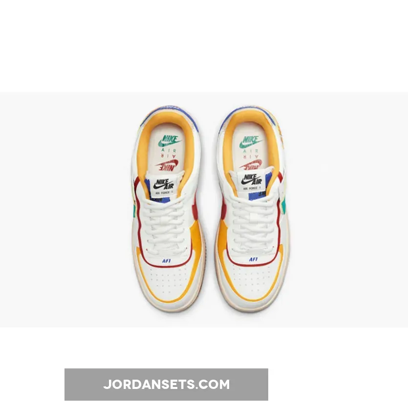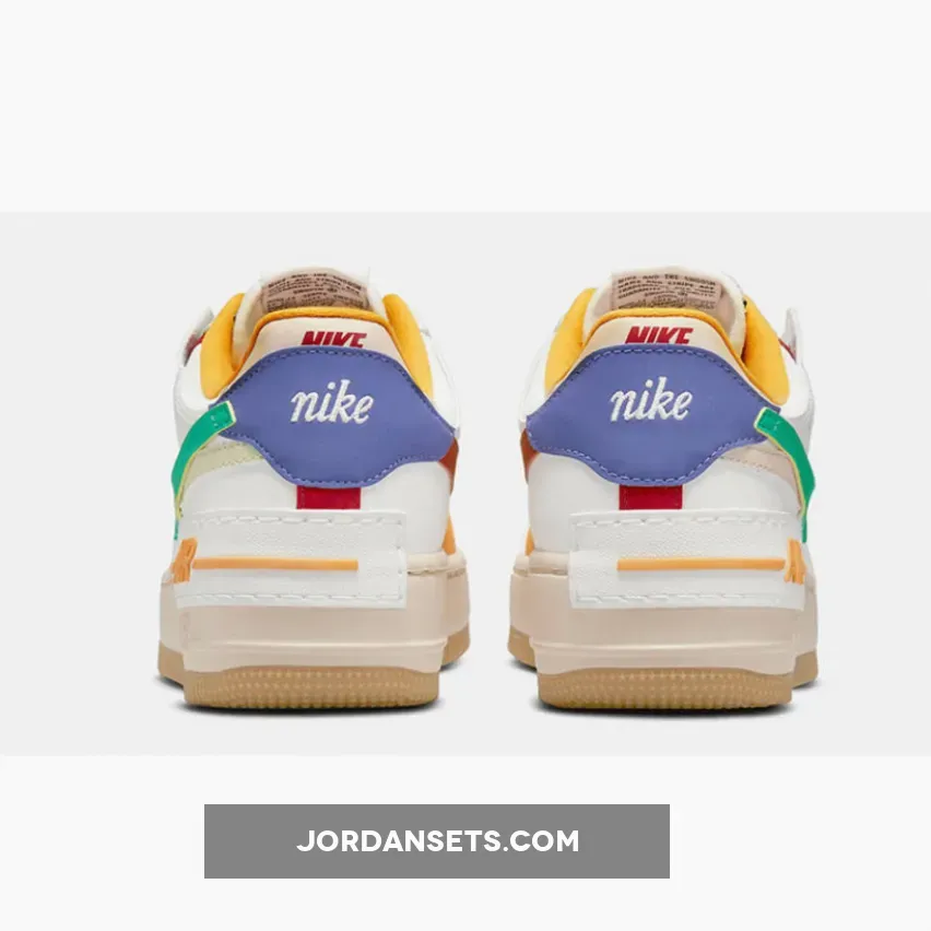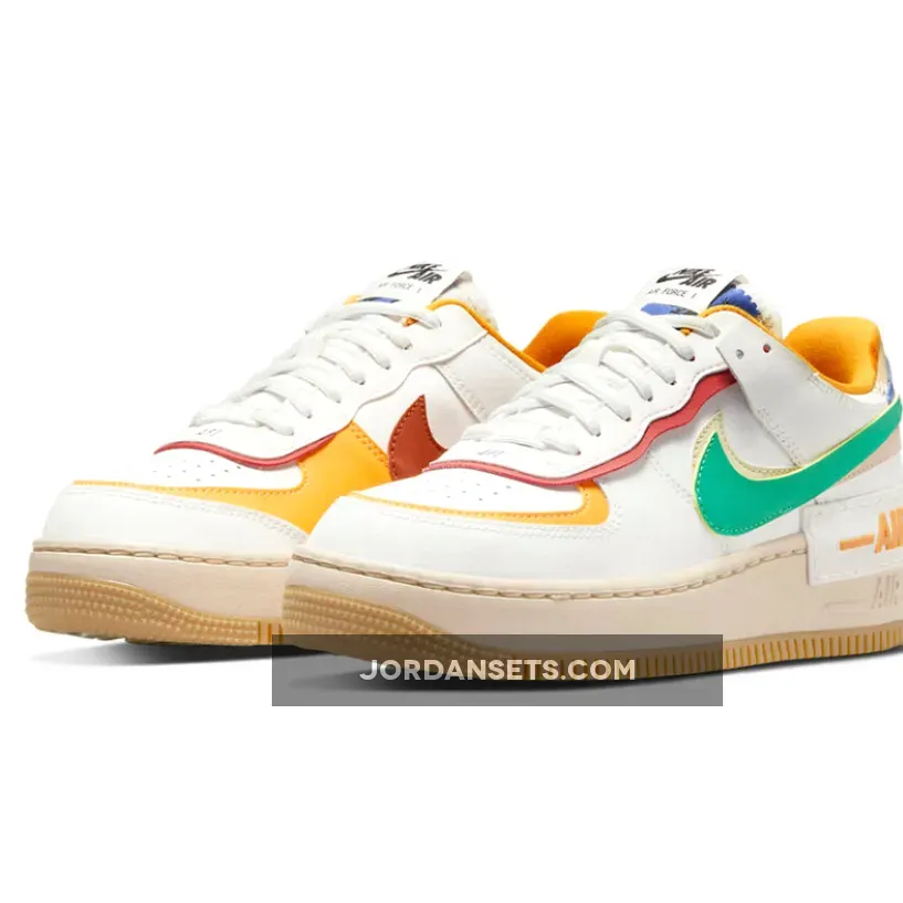 The double-themed Nike Air Force 1 Shadow has a playful and colourful new iteration. Introducing the Nike Air Force 1 Shadow White Multi. The most eye-catching details of this AF1 are the two eye stays in white and red, two mudguards in white and bright yellow, two heel tabs in a creamy Sail colour and vivid blue and two profile Swooshes on the lateral side in Sail and Malachite green. The rest of the upper features a smooth white leather base, white laces, a white mesh tongue and a bright yellow sock liner. Branding comes in the form of double Nike tongue tabs and a Nike text logo embroidered in white on the blue heel tab.