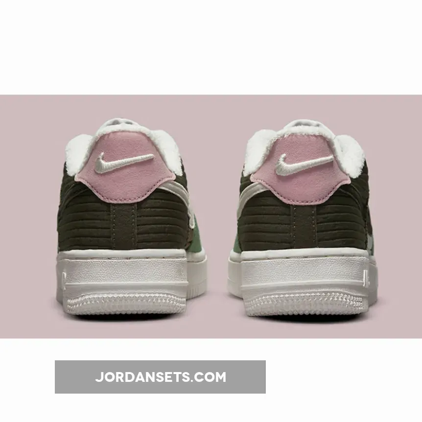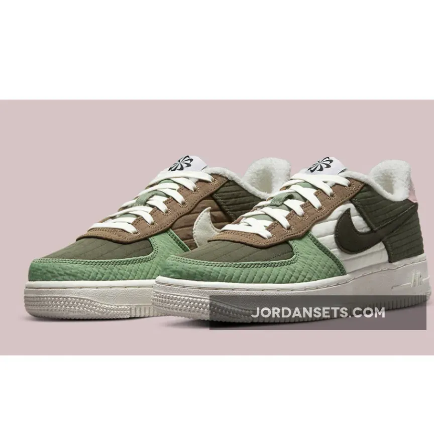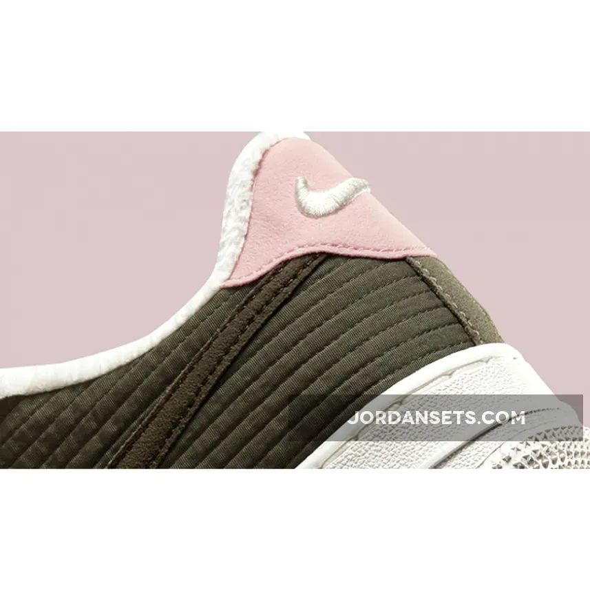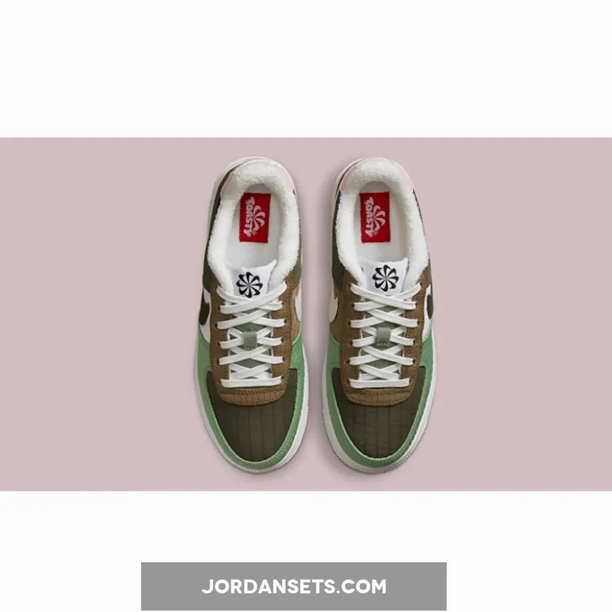 The “Toasty” collection which is part of Nike’s “Move to Zero” campaign has a new edition in the Nike Air Force 1 silhouette, the Nike Air Force 1 Toasty Oil Green Sail. Oil Green in a quilted fabric dresses up the toe cap, whilst olive green, in the same fabric, comes out on the toe box as well as the heel panel. The eye stay panel is a chocolate brown. The signature Swooshes in a fleecy olive green material stands out against the Sail mid-panel. Baby pink pops out on the heel tab with embroidered white Swooshes.