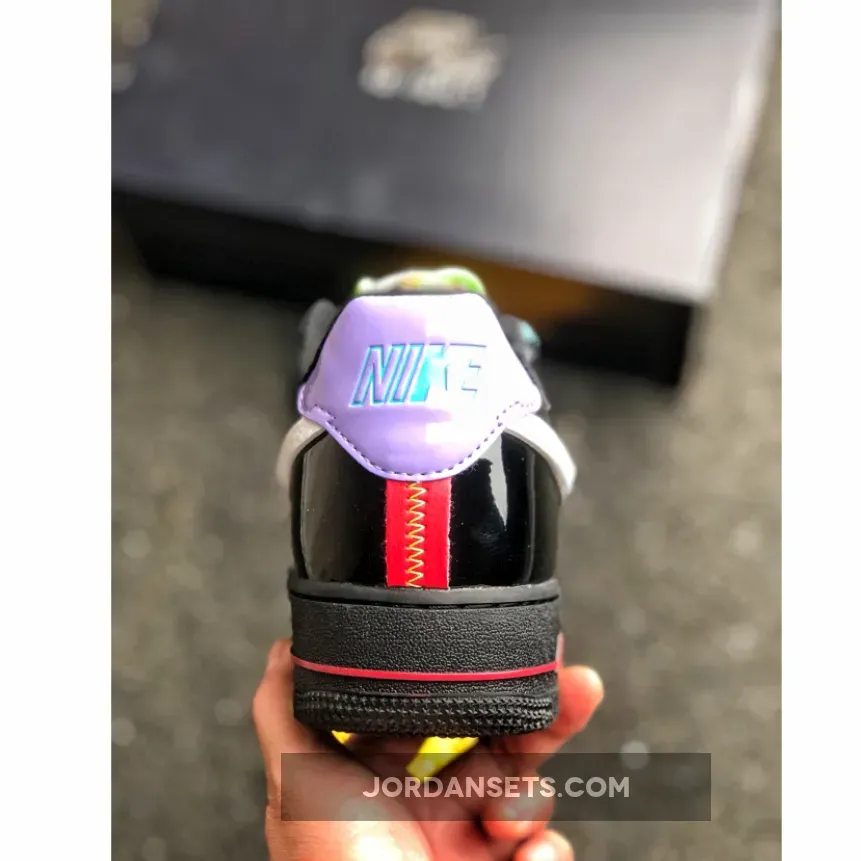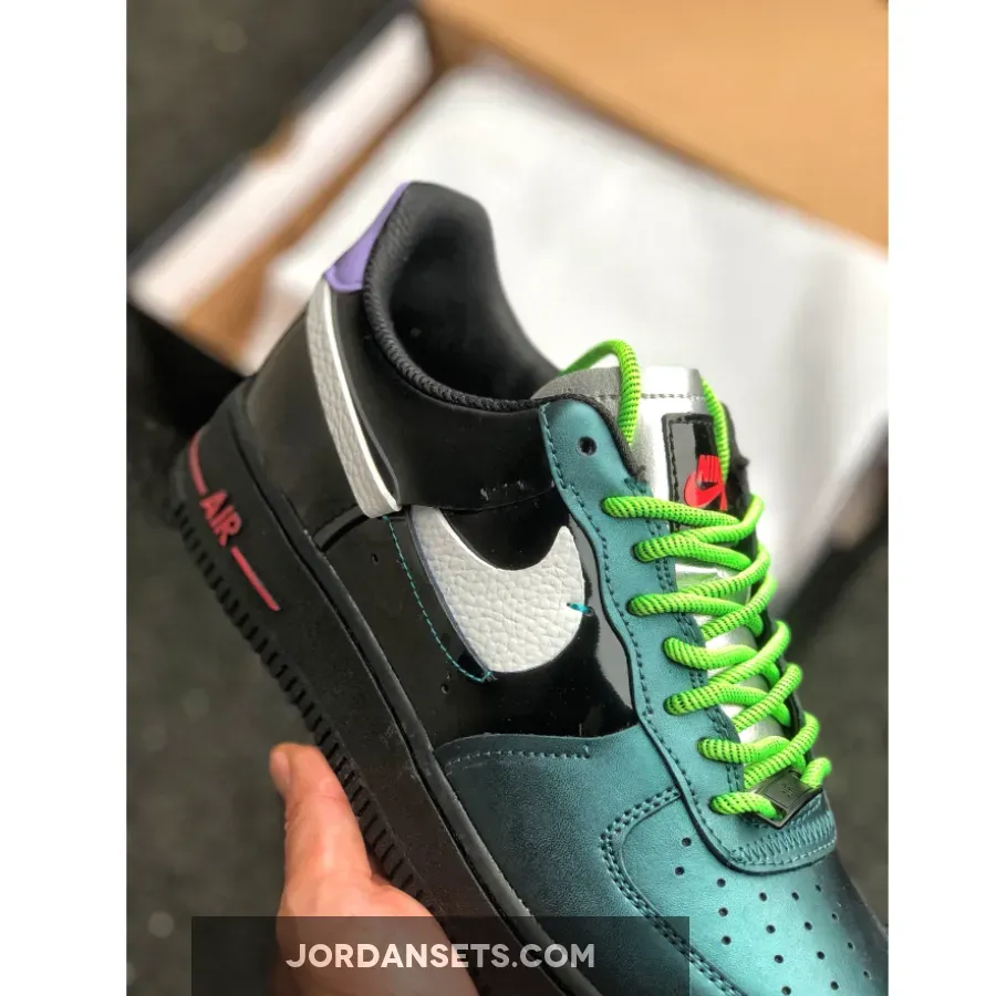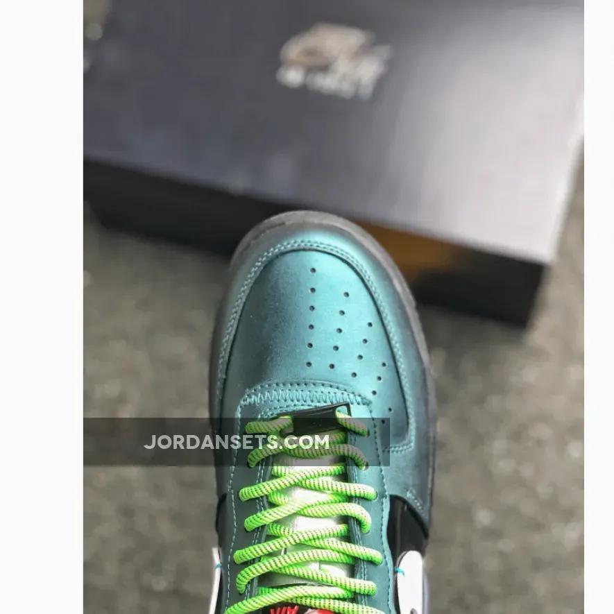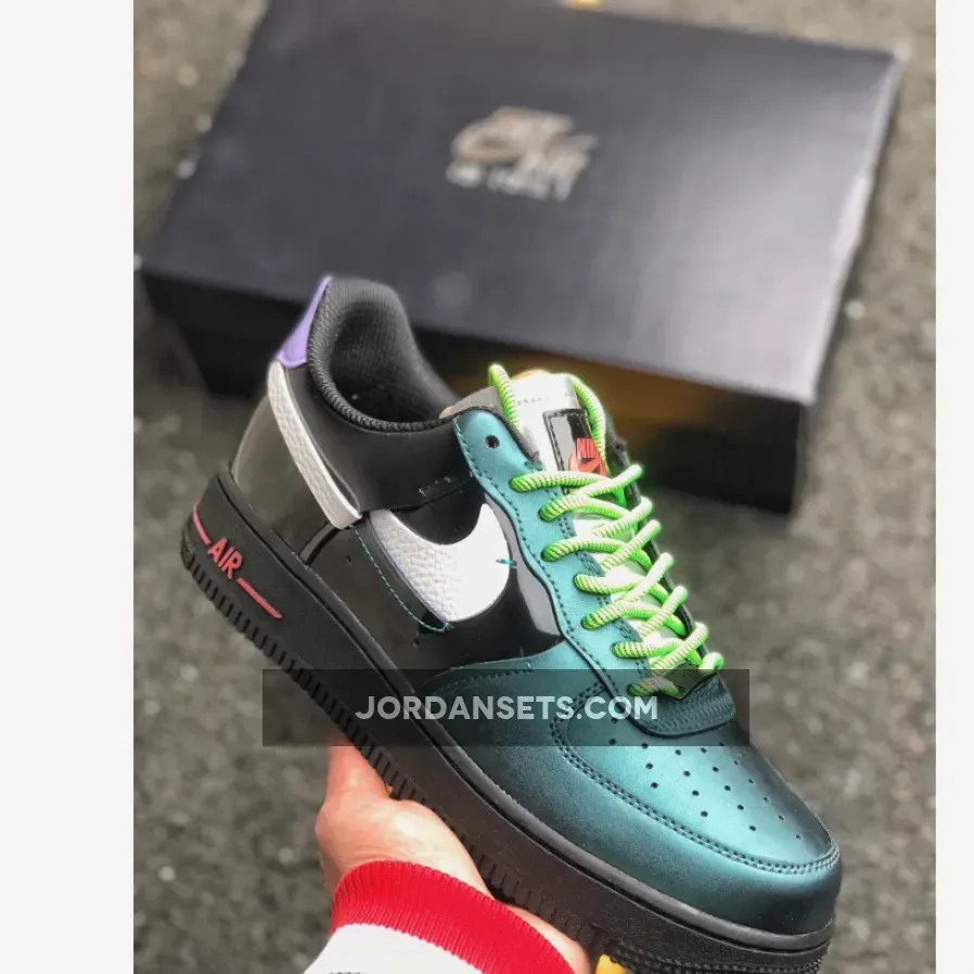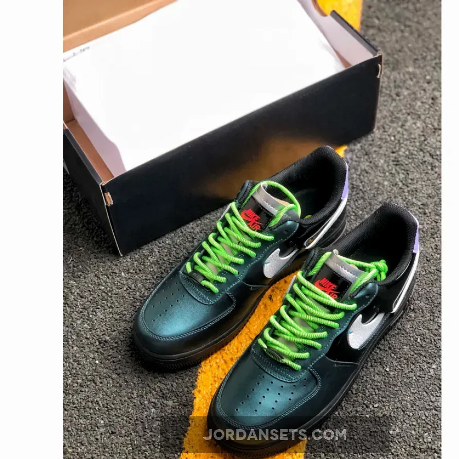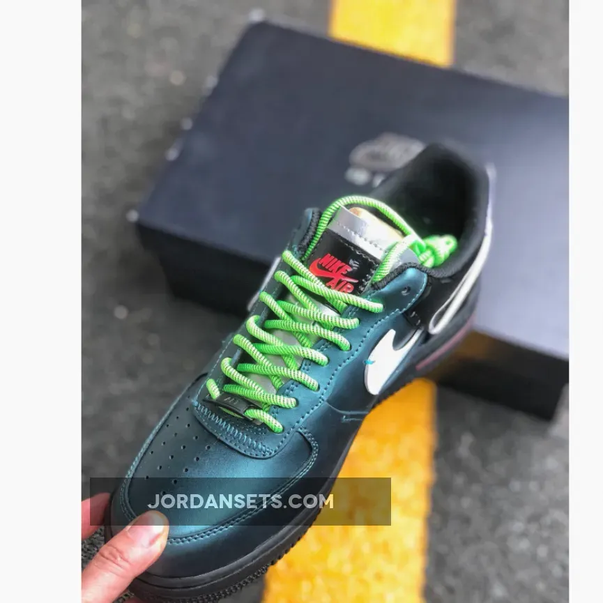 This reconstructed release of the Nike Air Force 1 features a metallic and iridescent upper with vibrant neon accents on the laces, heel tab, and AIR mark on the sole. A White tumbled leather broken Swoosh on the sides, Green rope laces and Purple patent leather heels completes the design.