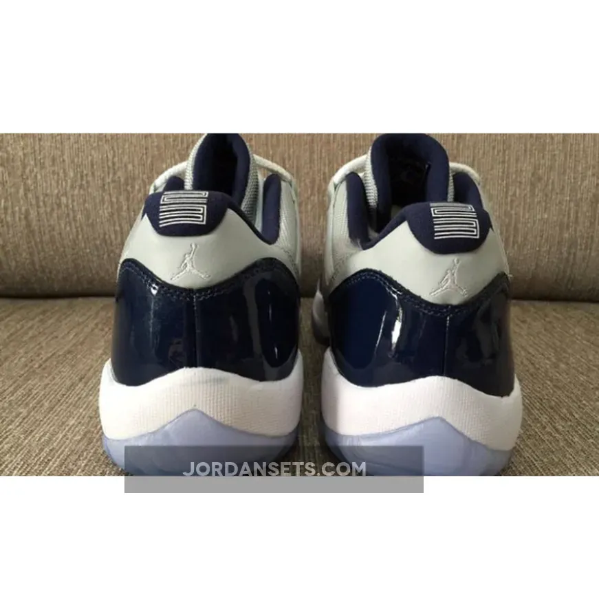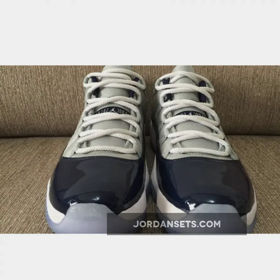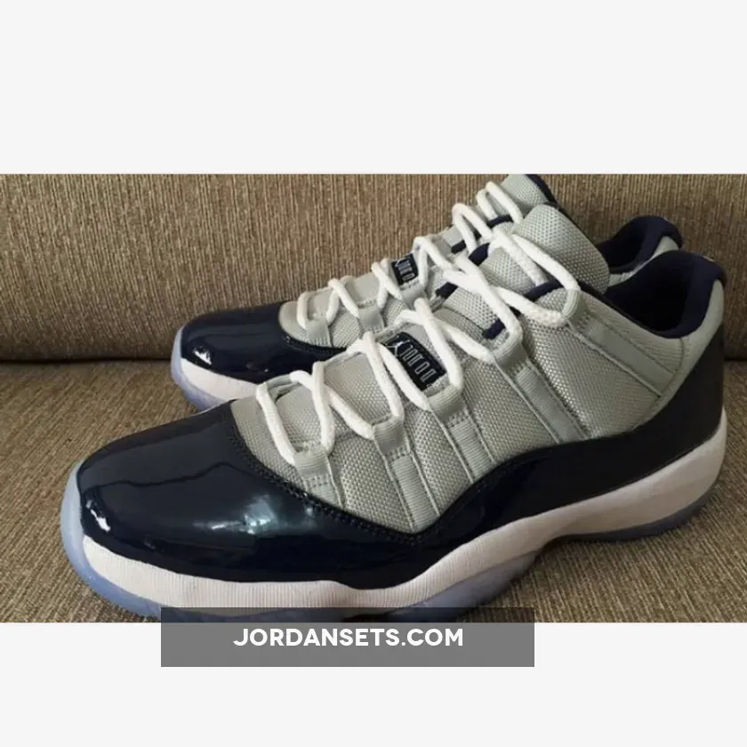This Air Jordan 11 Low is dressed in a Low Grey Mist, White and Midnight Navy color scheme. Featuring a full Grey mesh upper with Midnight Navy patent leather overlay.