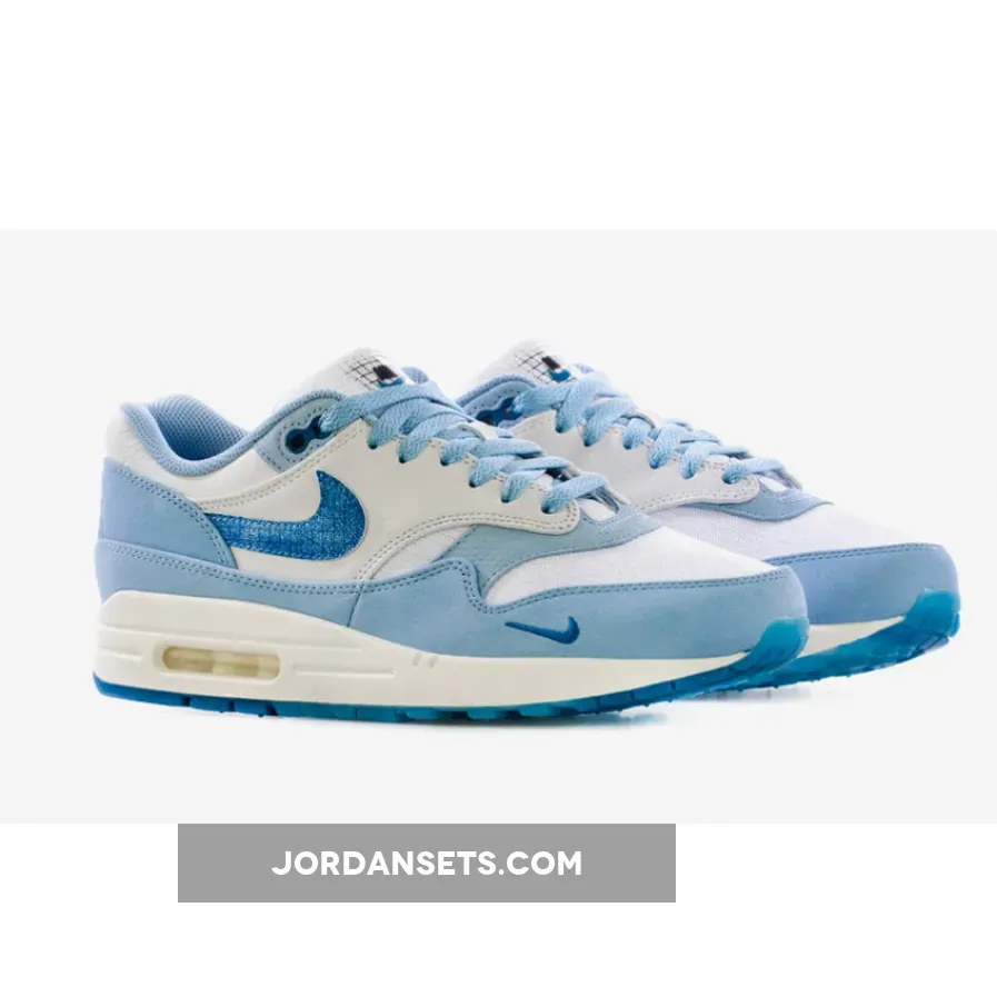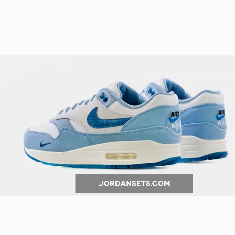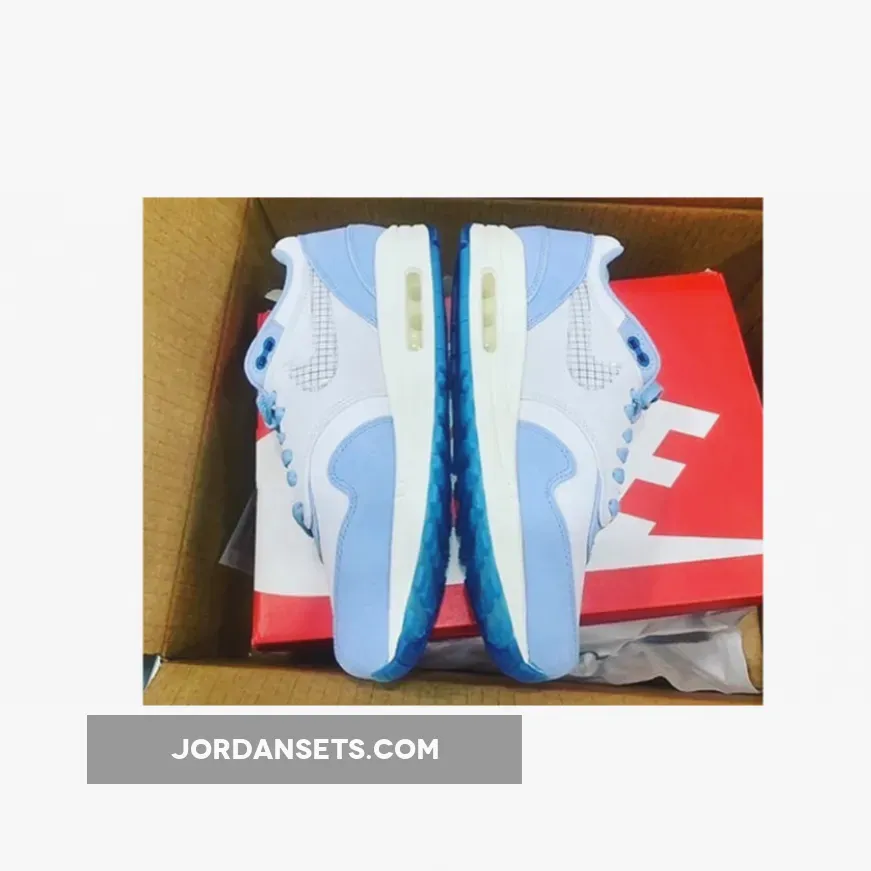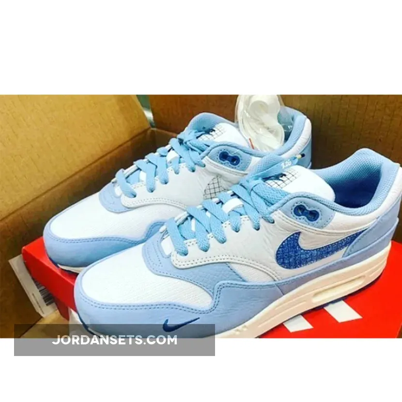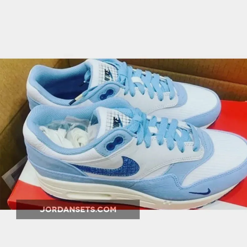 Azure blue Swooshes with geometric patterns adorn the side panels, while baby blue animates the mudguard and heel tab of this Nike Air Max 1.