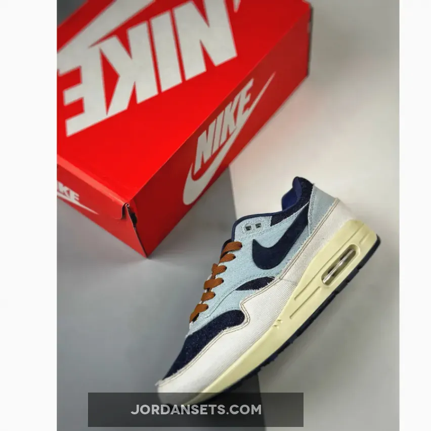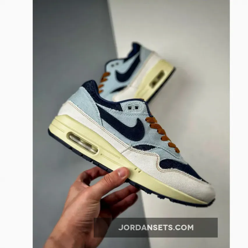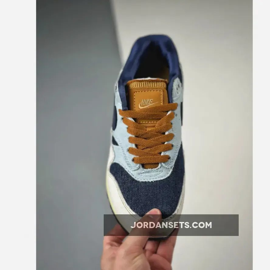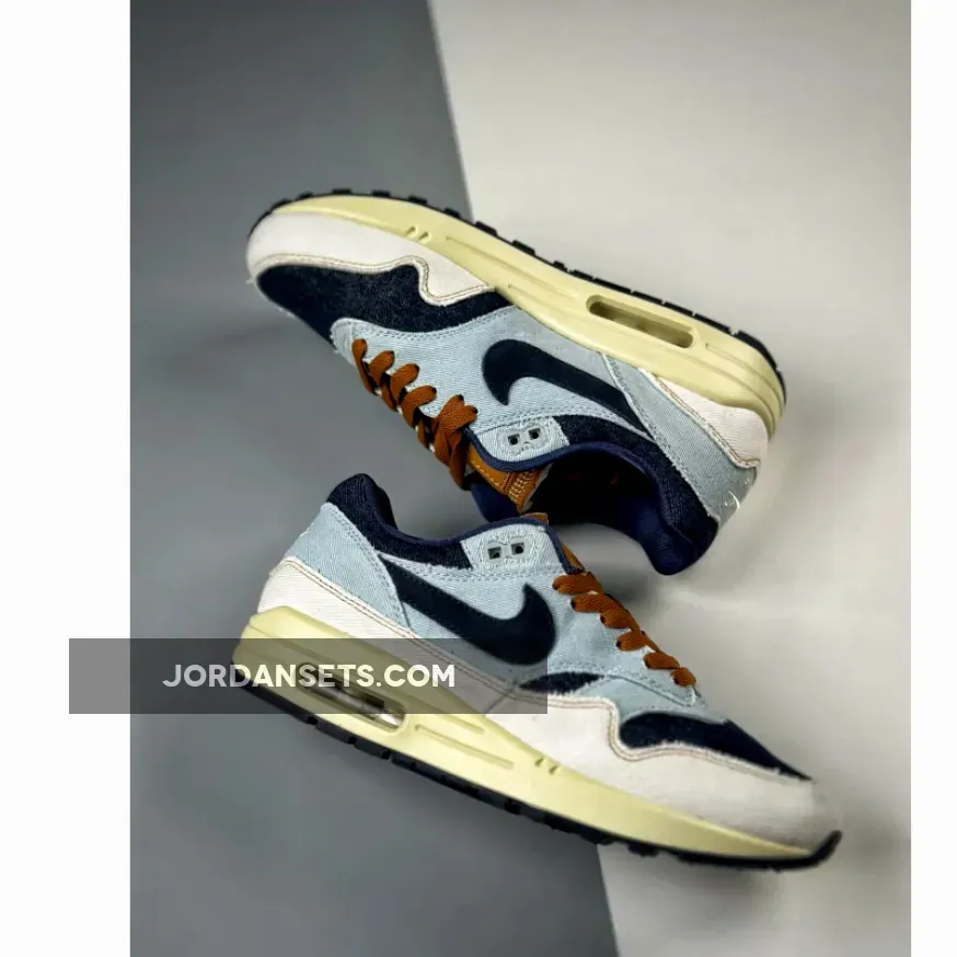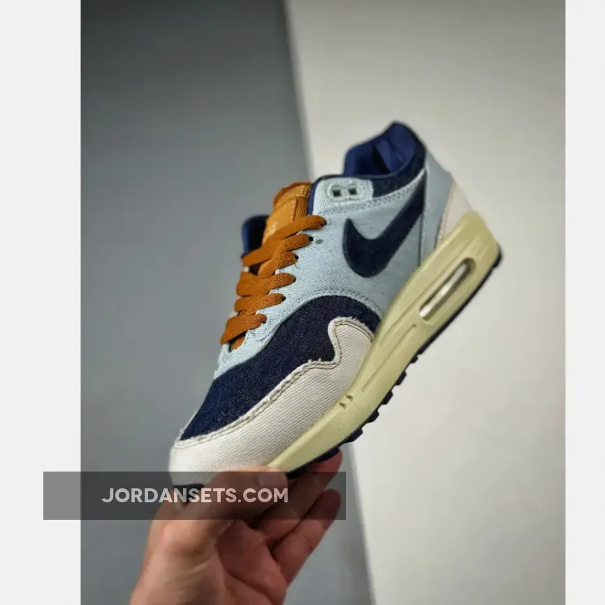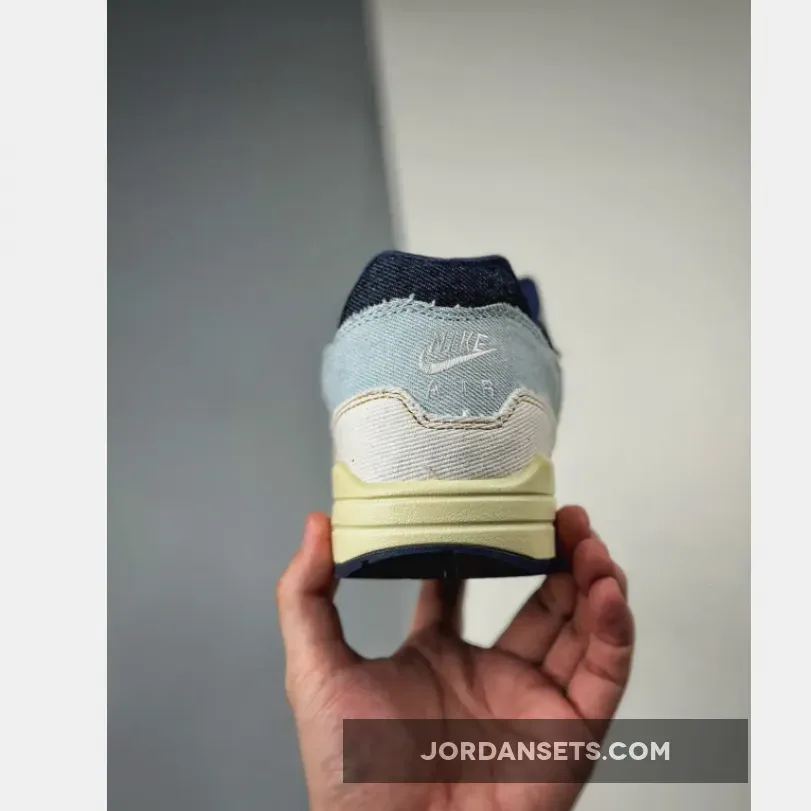 The Nike Air Max 1 boasts an Aura, Midnight Navy, and Pale Ivory color scheme. Its upper features a twill, denim-like material, with a Navy base and Light Blue overlays. Ivory mudguards complement both shades of Blue, while Tan padded tongues, matching tongue labels, laces, insoles, and exposed stitching add a stylish touch. The vintage vibe is enhanced by the signature embroidered “Nike Air” branding on the heels, combined with a Sail midsole. The design is rounded off with a Navy rubber outsole.