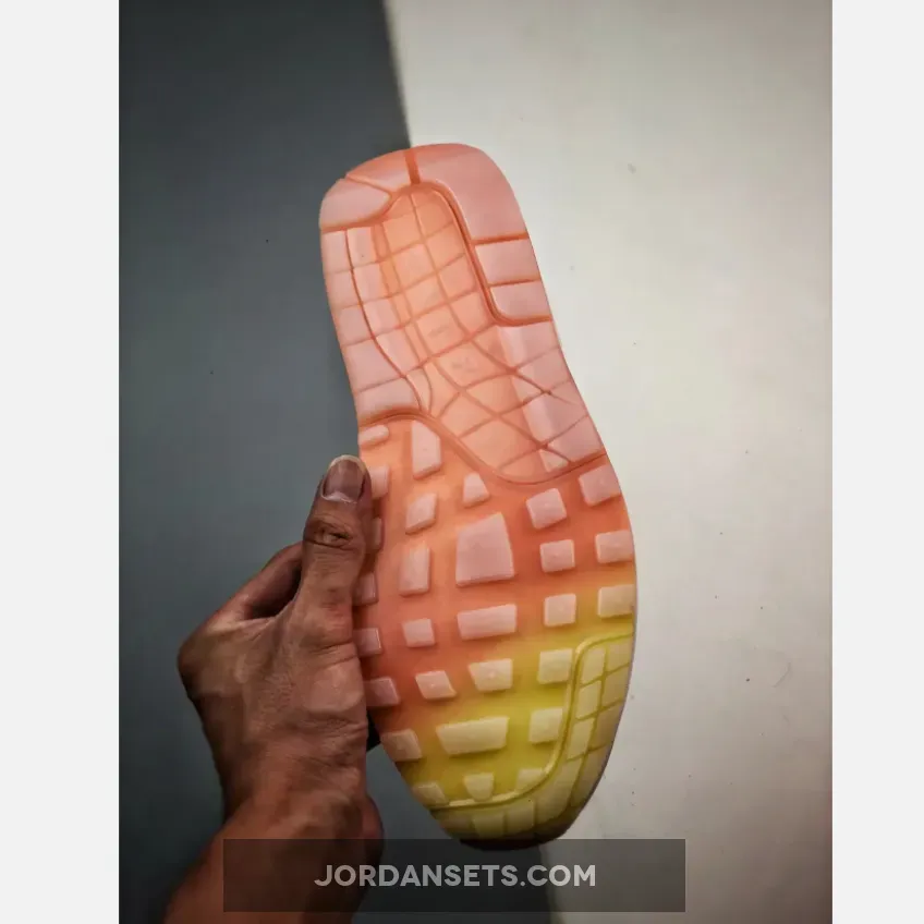The model rests on a white midsole and orange, green and red outsole and is tied together by white laces for a clean finish.