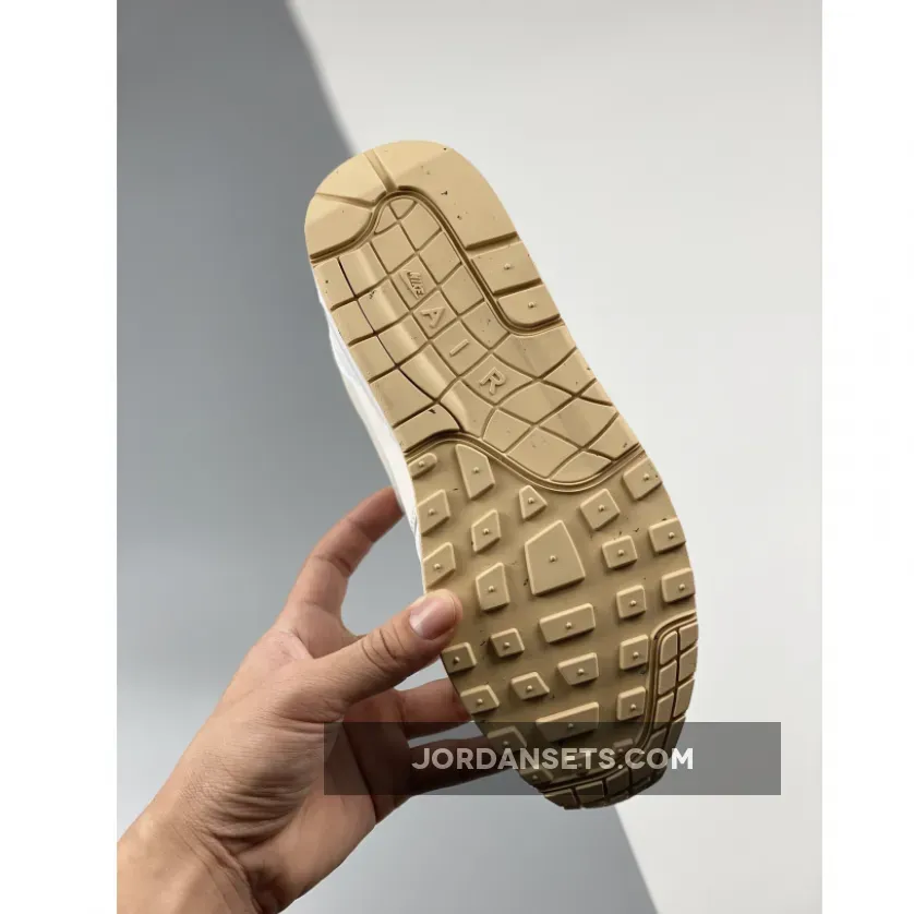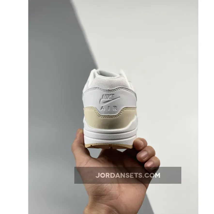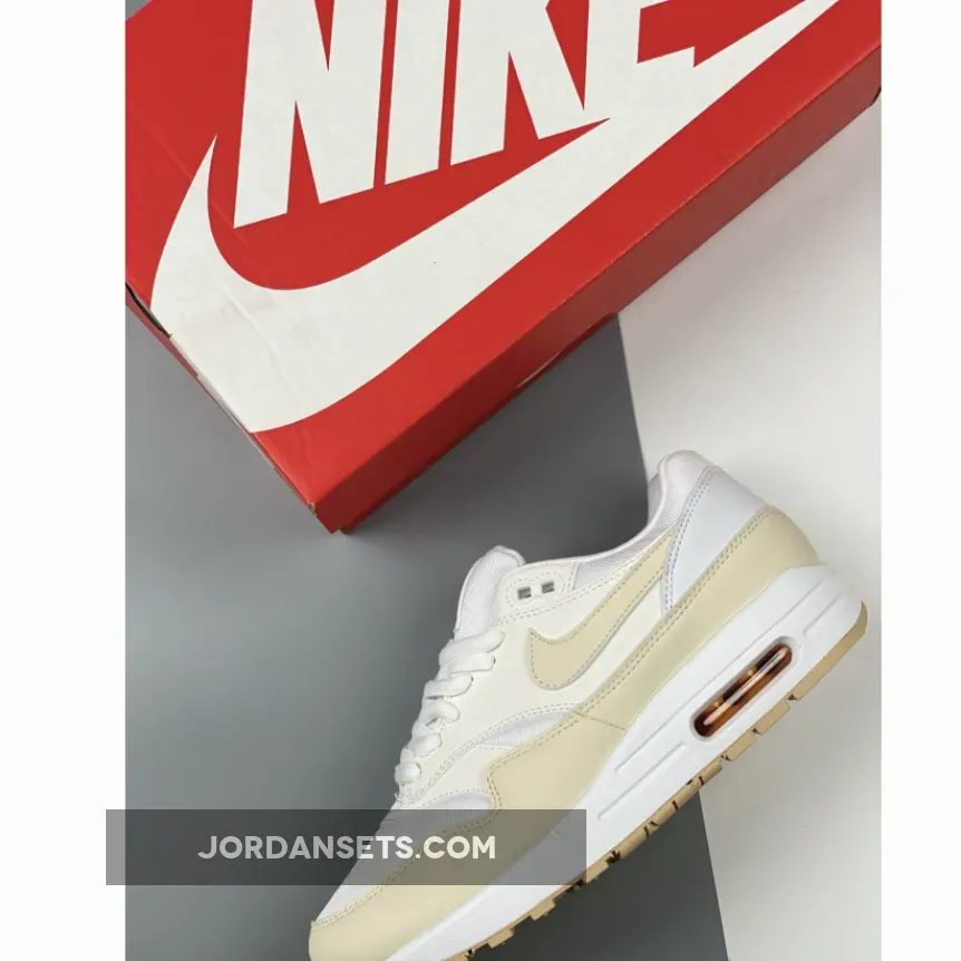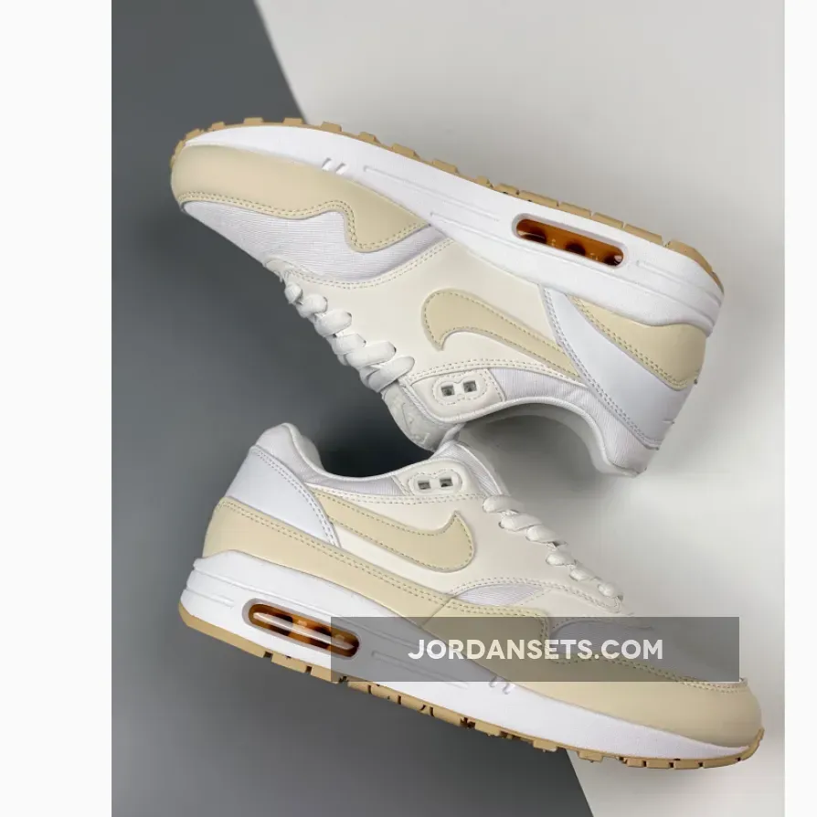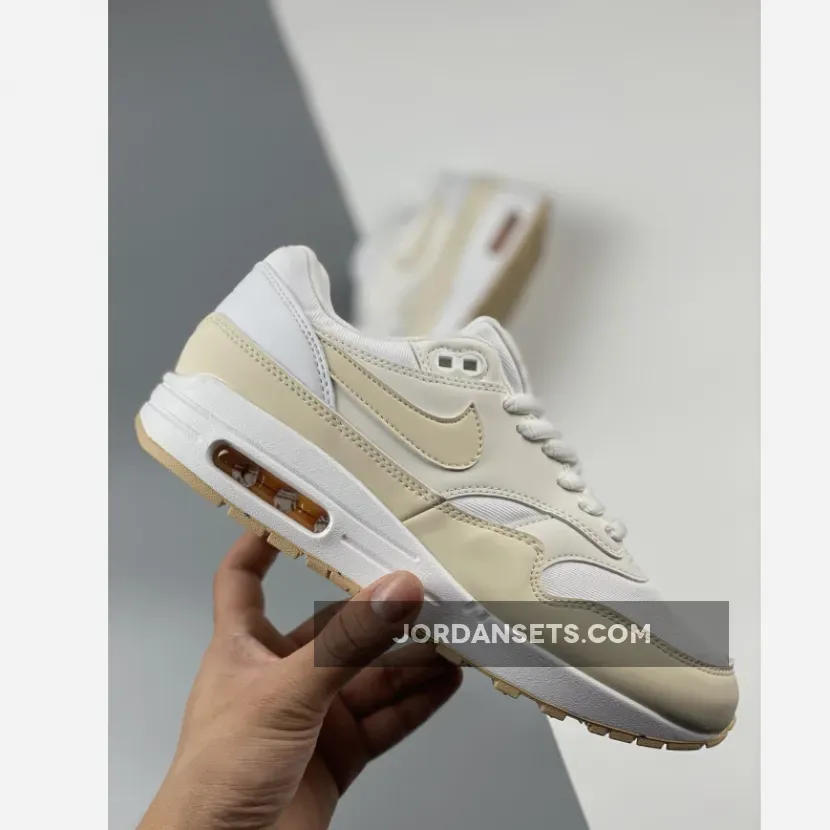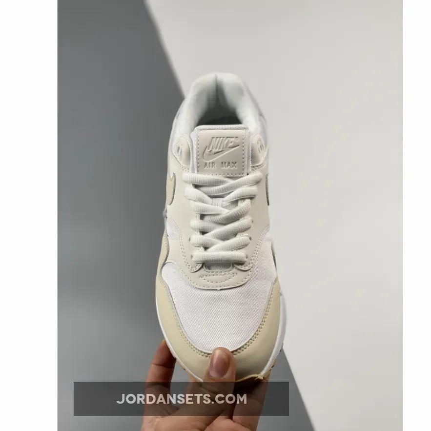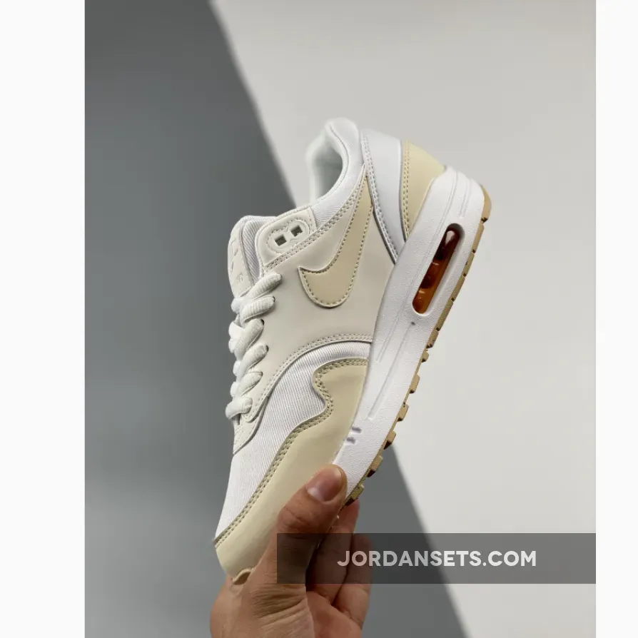 This Nike Air Max 1 comes dressed in a Summit White, Sanddrift, and Phantom color combination. Constructed with premium materials, which include mesh and leather. Tans are used along the Swoosh, mudguard, and many of the adjacent accents, while lighter creams highlight the mid-panel and vamp.