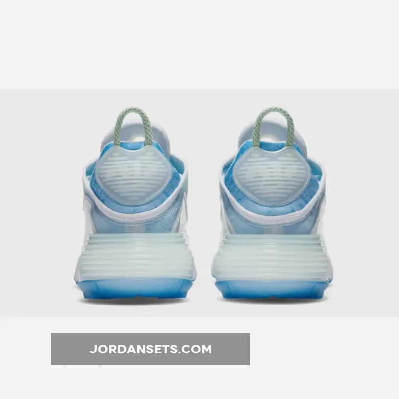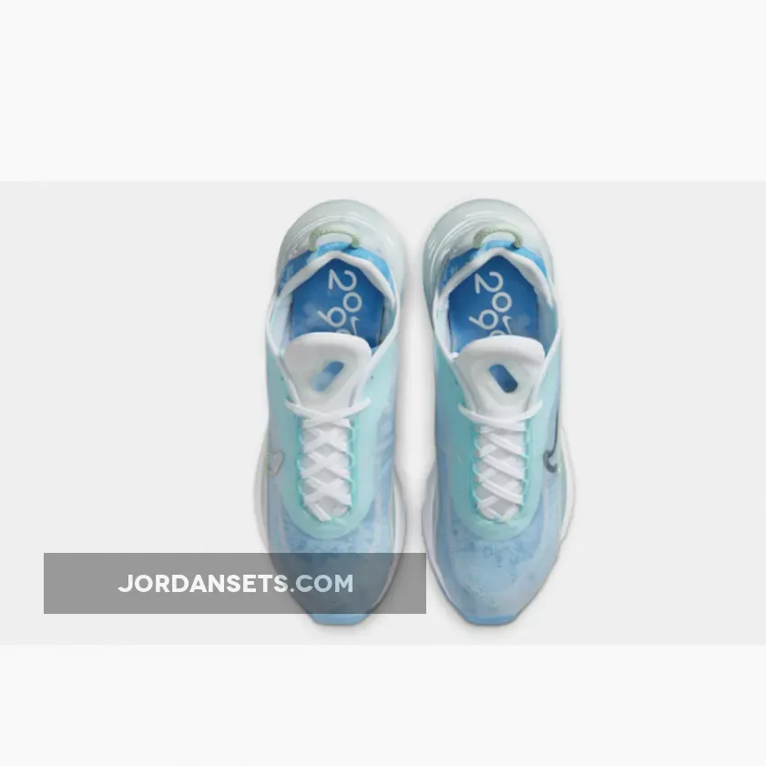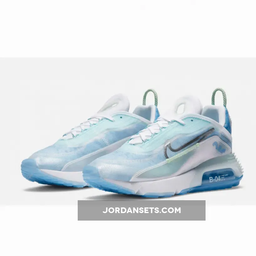 This women’s Nike Air Max 2090 features a White, Glacial Blue, and Metallic Silver color combination. Firstly, the pair comes with geometric patterns in shades of Blue with a coating covering the upper. The two elements make what resembles the shape of the Beijing Water Cube. Also, Max Air cushioning allows for this pair to be laced-up for hours.