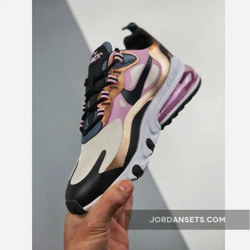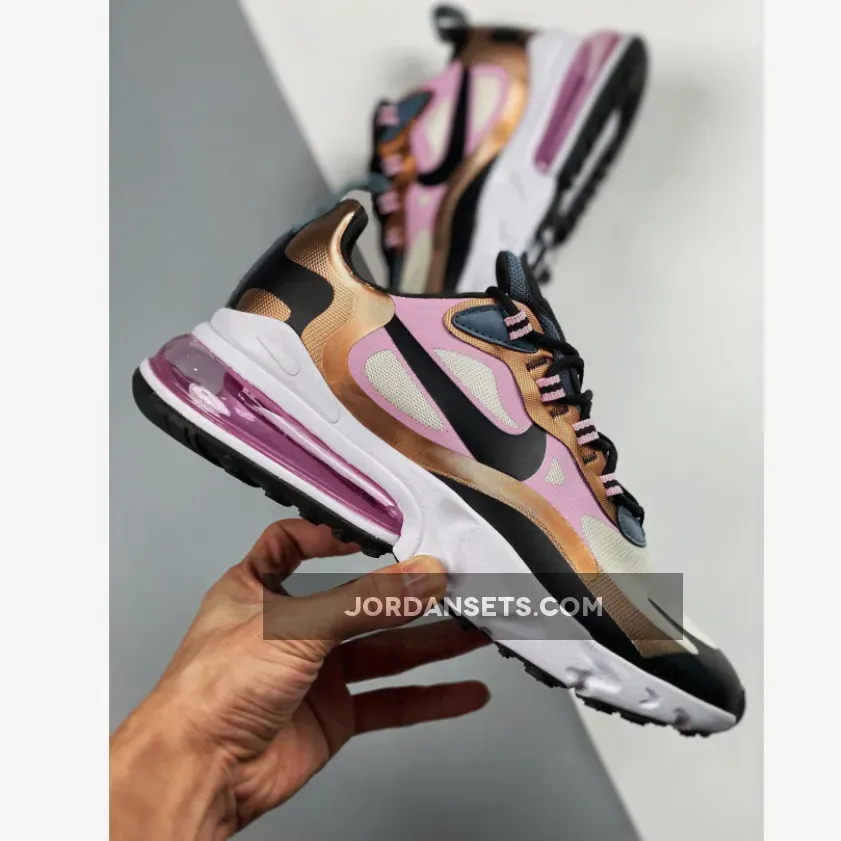 this Nike Air Max 270 React comes highlighted with Beige mesh across the base with synthetic detailing that uses Pink and Bronze. Following we have Black on the Swoosh logos, Pink placed within the Air Max unit along with Bronze outlines.